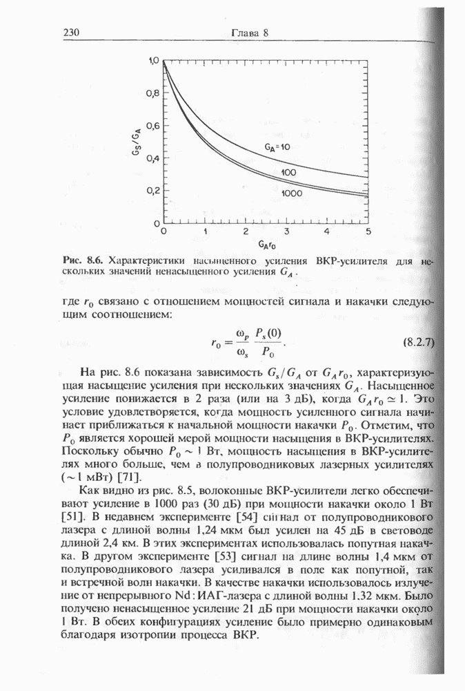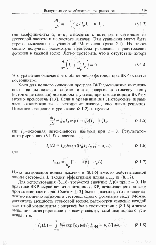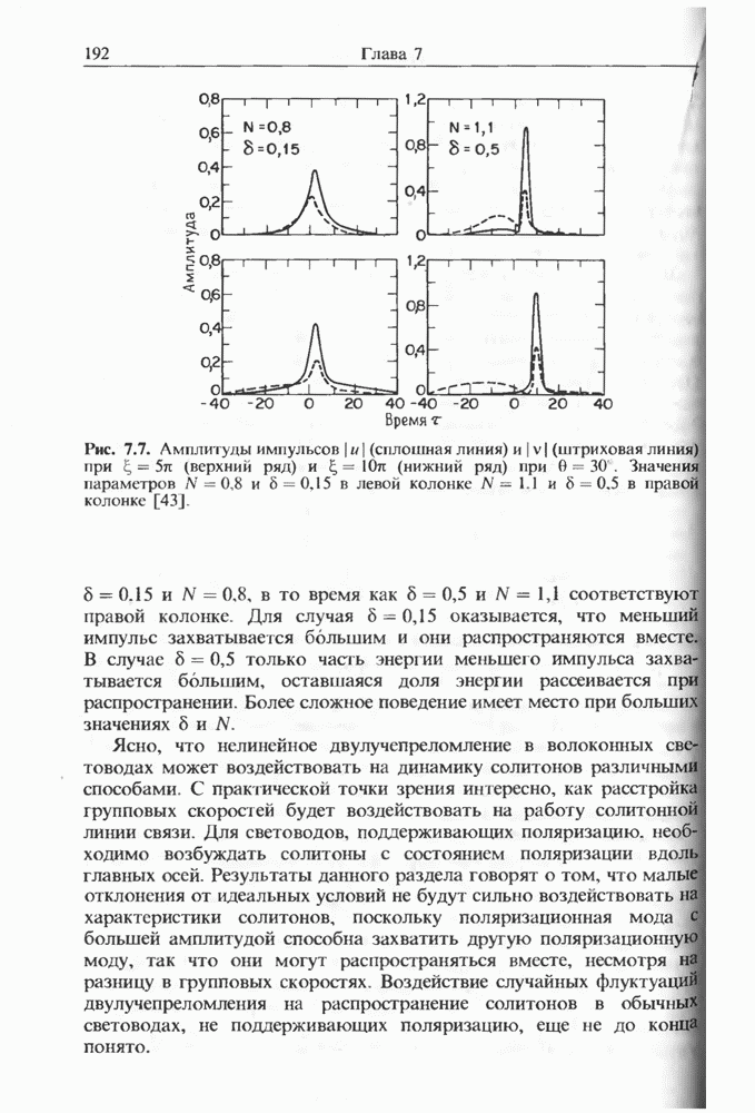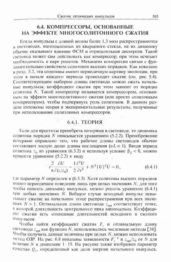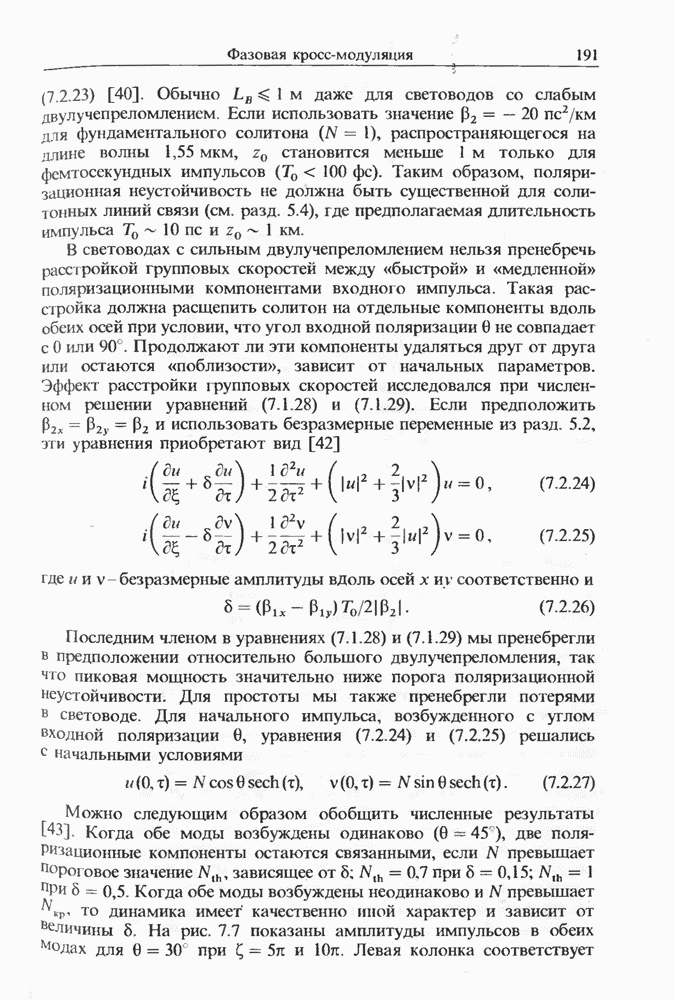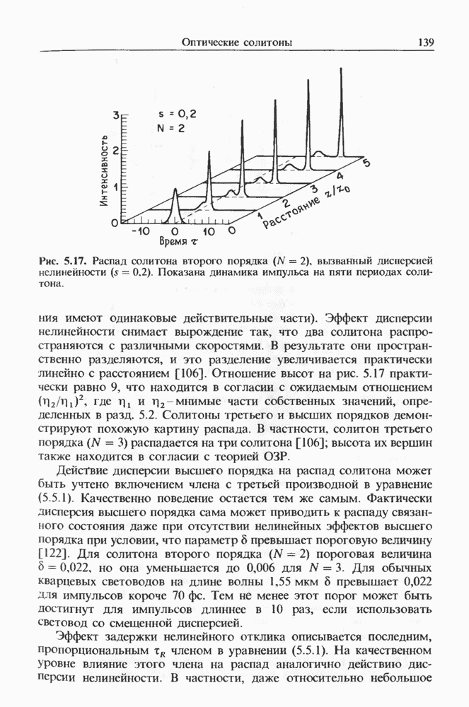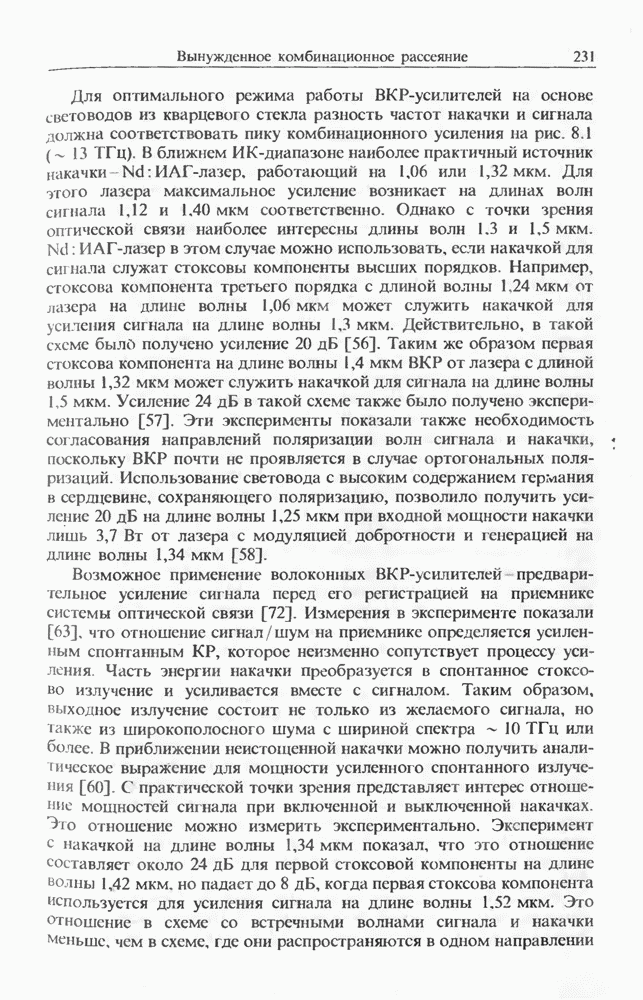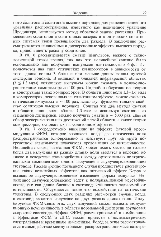 Когда длина волны накачки лежит в области отрицательной дисперсии световода, в импульсах накачки и ВКР могут появляться солитонные эффекты, возникающие в результате совместного действия нелинейности и дисперсии (см. гл. 5). Этот случай, в силу его большой научной и практической важности, широко исследовался как теоретически, так и экспериментально [118 138].
