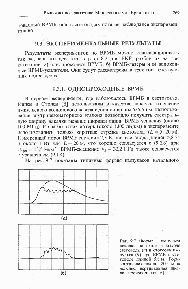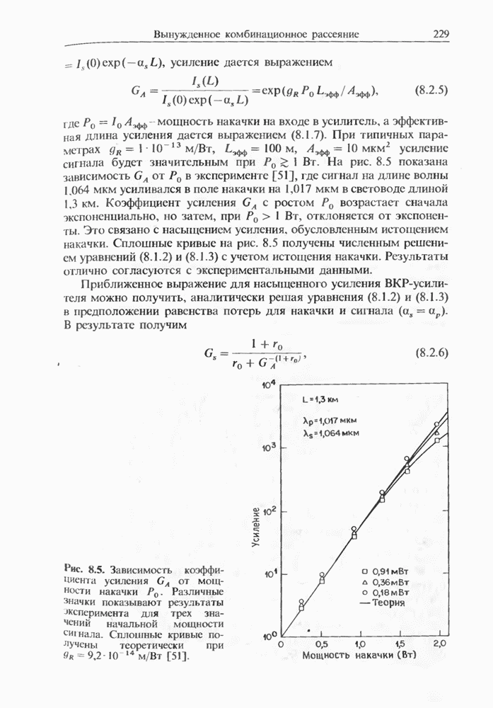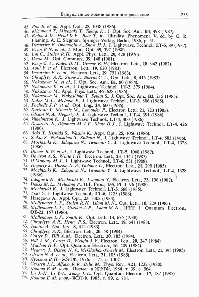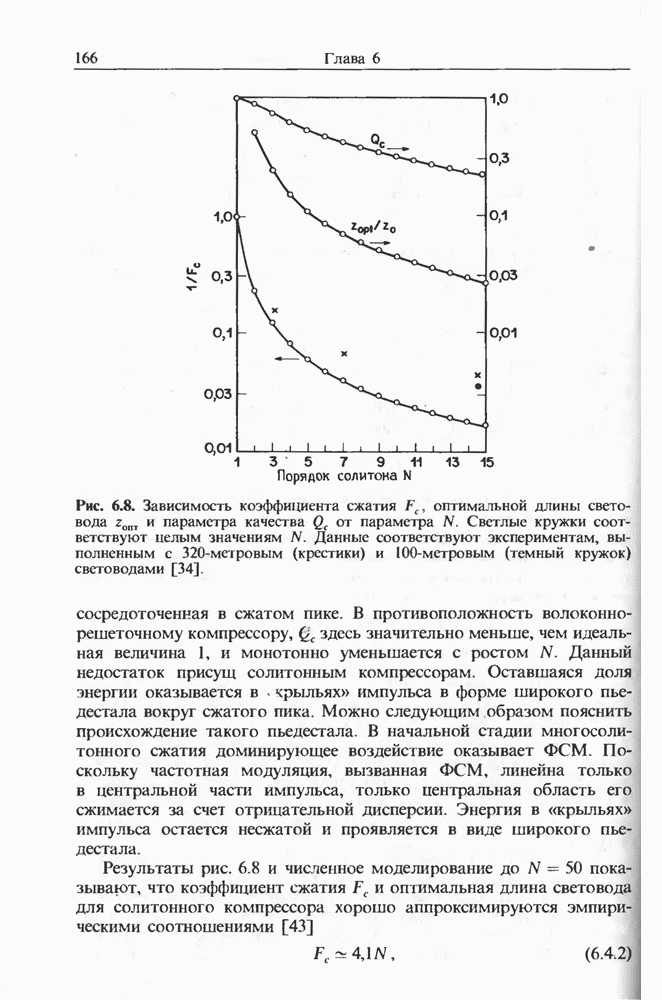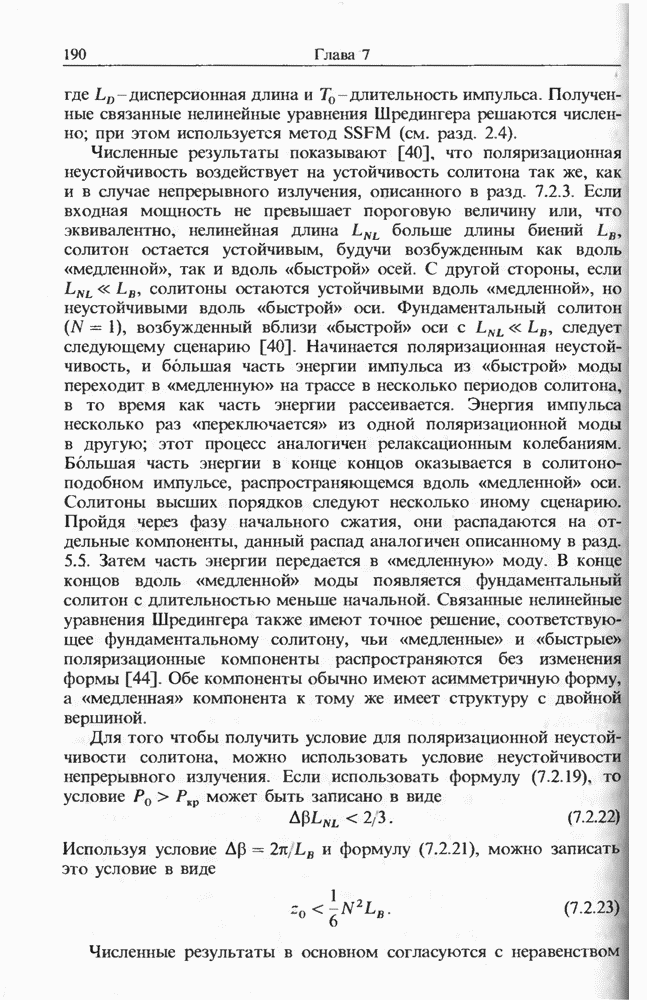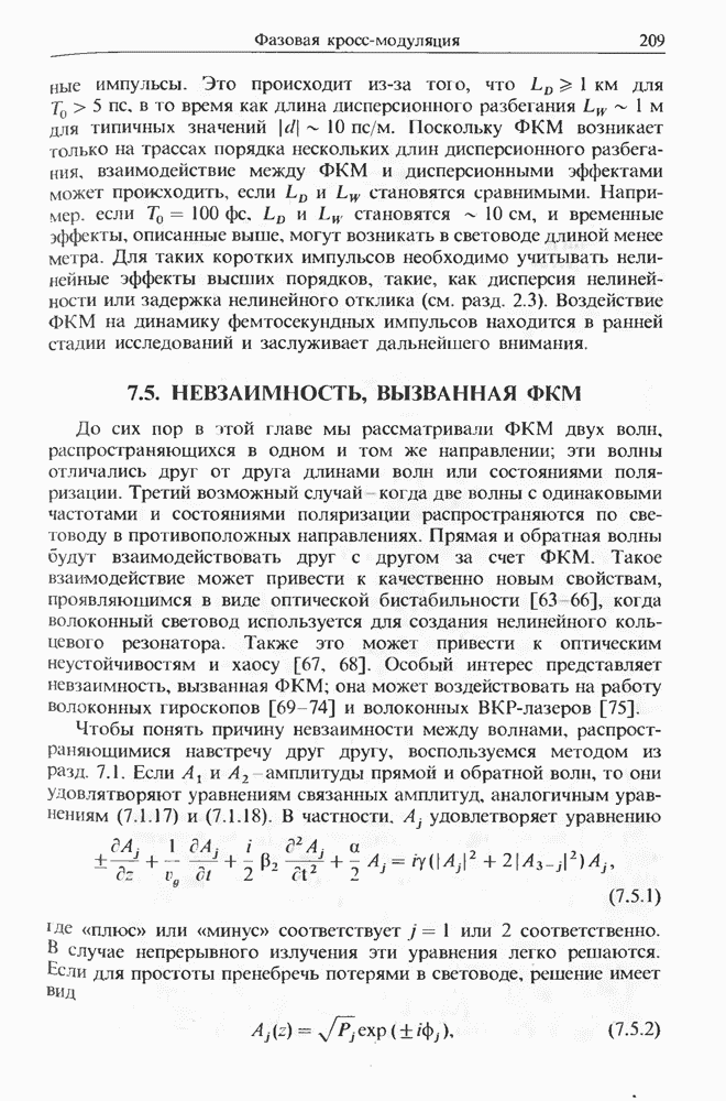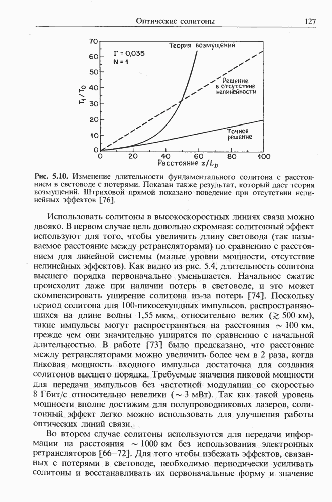 Когда длина волны накачки лежит в области отрицательной дисперсии световода, в импульсах накачки и ВКР могут появляться солитонные эффекты, возникающие в результате совместного действия нелинейности и дисперсии (см. гл. 5). Этот случай, в силу его большой научной и практической важности, широко исследовался как теоретически, так и экспериментально [118 138].