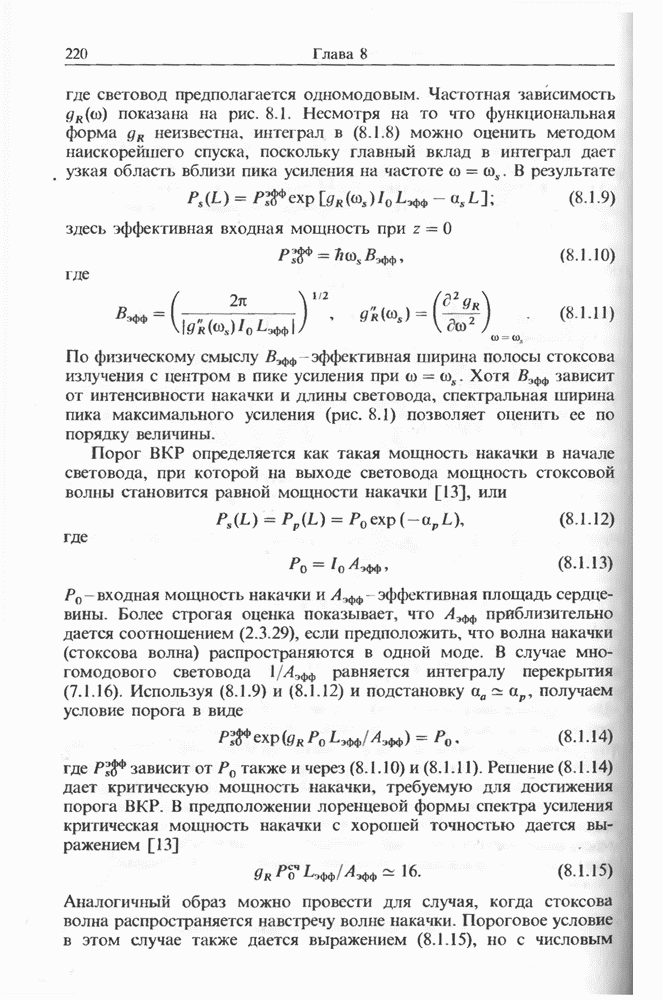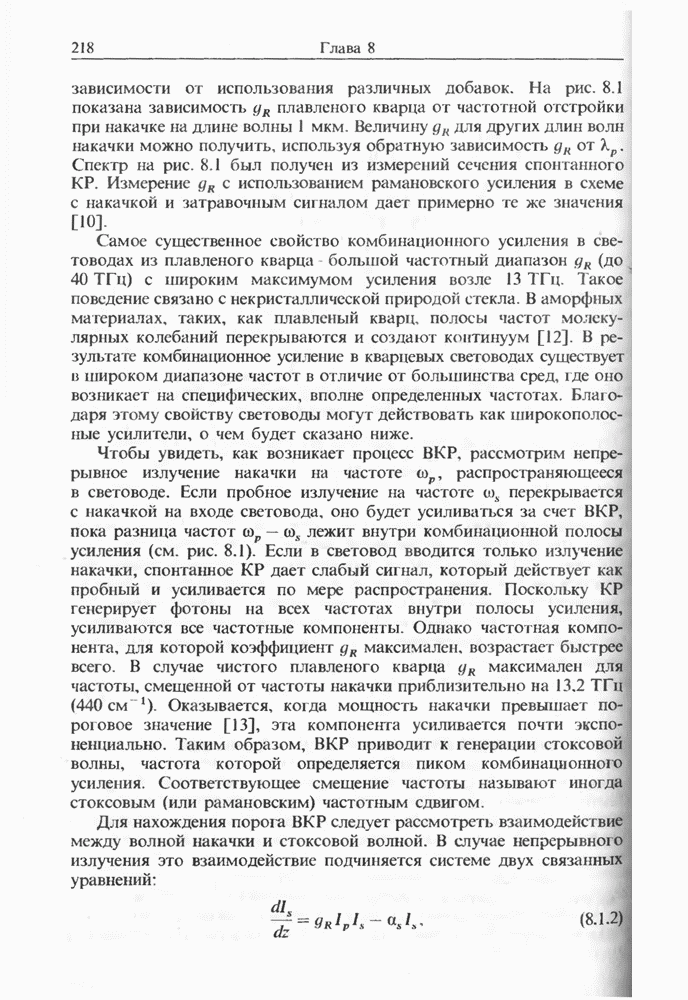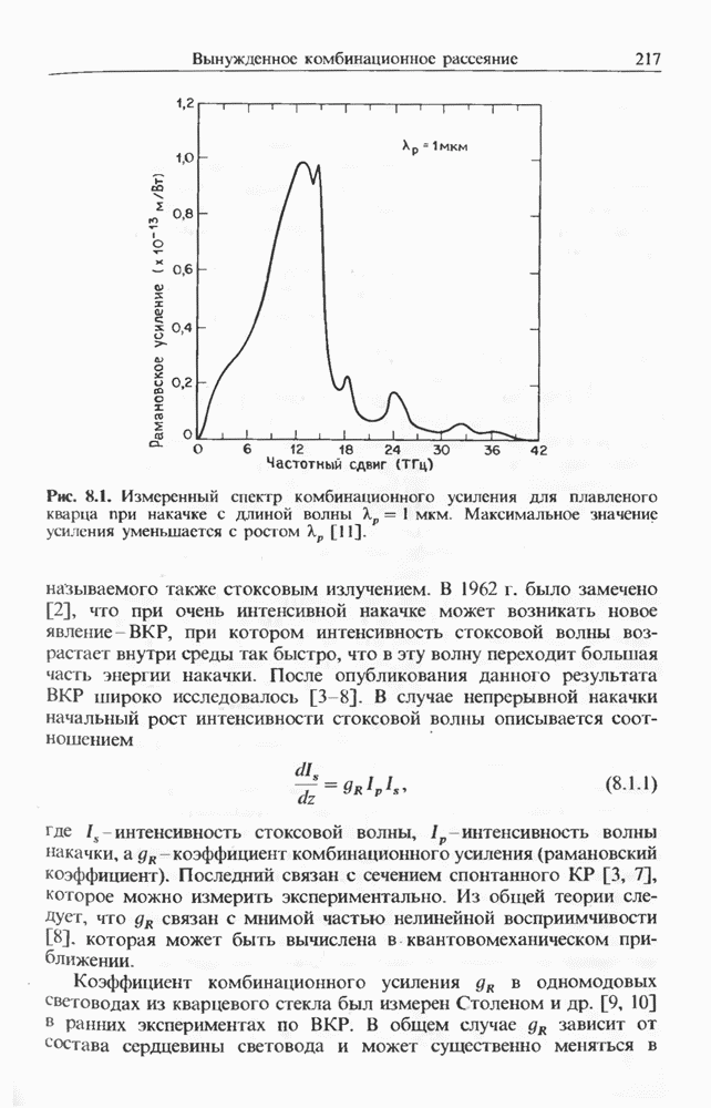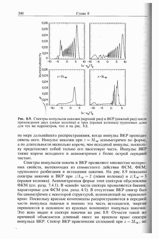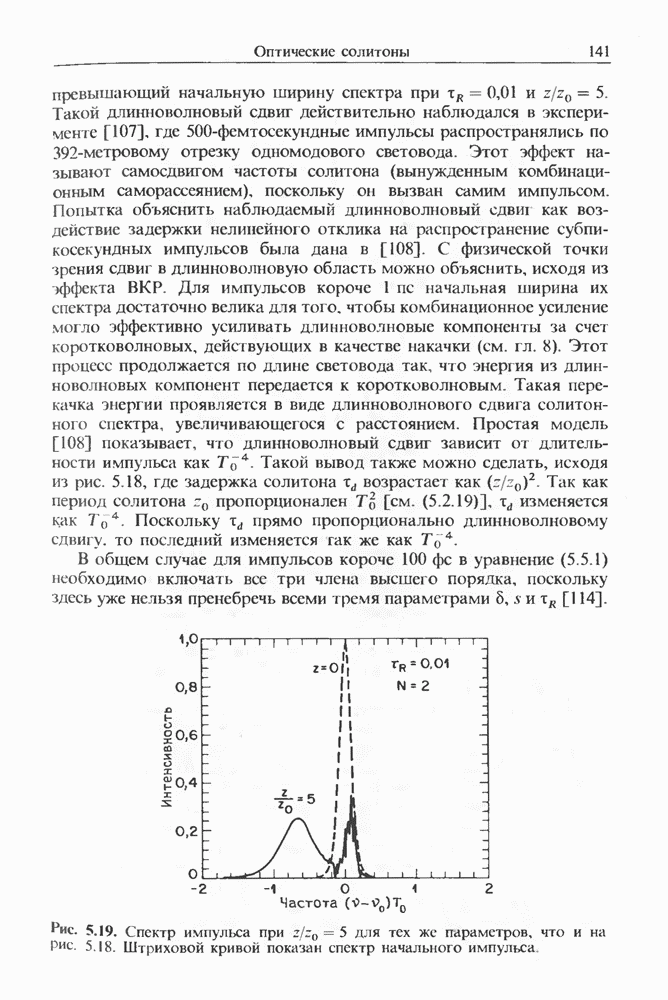 Альтернативное описание дается обобщенным уравнением распространения (2.3.35) и разд. 2.3, последний член которого, пропорциональный времени нелинейного отклика отвечает за ВКР. Как обсуждалось выше, для небольших частотных отстроек связан с наклоном кривой комбинационного усиления (см. рис. 8.1). Влияние члена, отвечающего за комбинационное усиление, на эволюцию фемтосекундных импульсов внутри световода уже обсуждалось в разд. 5.5 после рассмотрения других нелинейных эффектов высших порядков. На рис. 5.20 были показаны форма и спектр импульса, пиковая мощность которого соответствует солитону второго порядка. В таком случае исходный импульс расщепляется на два фрагмента на длине одного периода солитона, явление, названное в разд. 5.5 распадом солитона. Это явление может быть интерпретировано как вынужденное комбинационное саморассеяние импульса [119], которое может возникать, даже если порог ВКР с уровня шумовой затравки еще не достигается. Основная идея состоит в следующем. Входной импульс, являющийся солитоном высшего порядка, в начальной фазе распространения укорачивается с одновременным уширением спектра. Спектральное уширение красного крыла обеспечивает затравку для комбинационного усиления, т. е. через ВКР синие компоненты импульса служат накачкой для красных компонент. Это ясно видно на рис. 5.20, где основной пик спектра непрерывно смещается в красную сторону. Такое смещение называют самосдвигом частоты солитона [121]. Во временном рассмотрении энергия