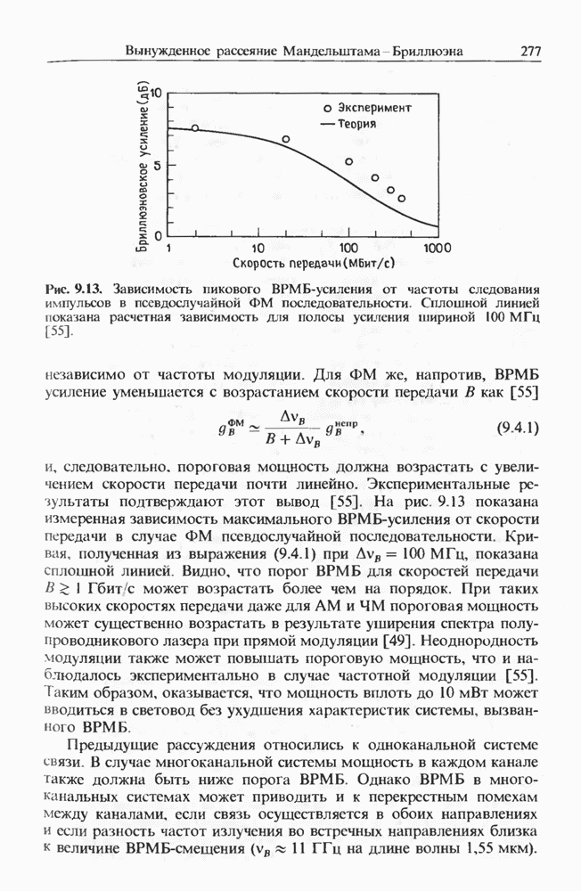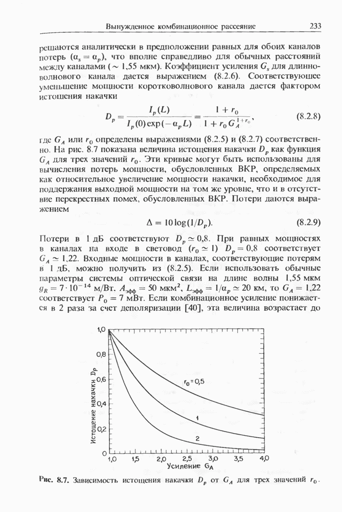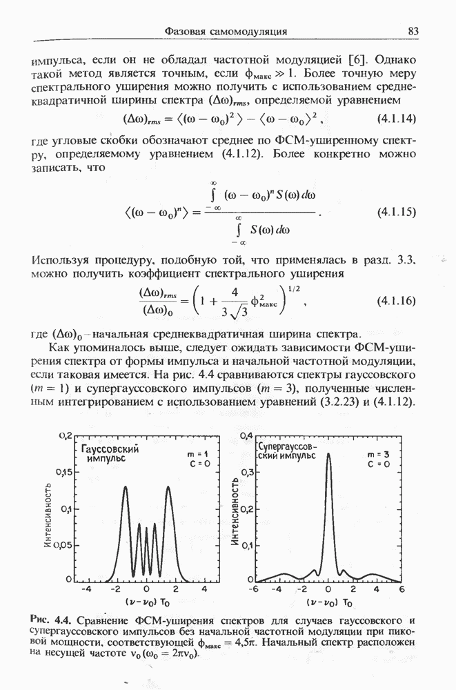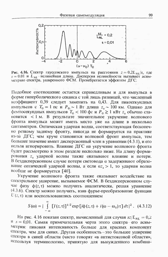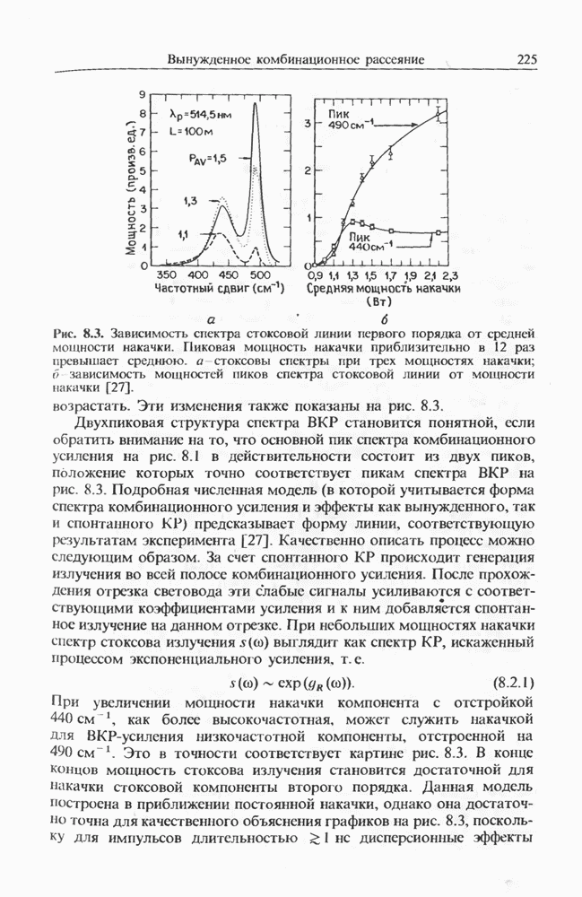 Альтернативное описание дается обобщенным уравнением распространения (2.3.35) и разд. 2.3, последний член которого, пропорциональный времени нелинейного отклика отвечает за ВКР. Как обсуждалось выше, для небольших частотных отстроек связан с наклоном кривой комбинационного усиления (см. рис. 8.1). Влияние члена, отвечающего за комбинационное усиление, на эволюцию фемтосекундных импульсов внутри световода уже обсуждалось в разд. 5.5 после рассмотрения других нелинейных эффектов высших порядков. На рис. 5.20 были показаны форма и спектр импульса, пиковая мощность которого соответствует солитону второго порядка. В таком случае исходный импульс расщепляется на два фрагмента на длине одного периода солитона, явление, названное в разд. 5.5 распадом солитона. Это явление может быть интерпретировано как вынужденное комбинационное саморассеяние импульса [119], которое может возникать, даже если порог ВКР с уровня шумовой затравки еще не достигается. Основная идея состоит в следующем. Входной импульс, являющийся солитоном высшего порядка, в начальной фазе распространения укорачивается с одновременным уширением спектра. Спектральное уширение красного крыла обеспечивает затравку для комбинационного усиления, т. е. через ВКР синие компоненты импульса служат накачкой для красных компонент. Это ясно видно на рис. 5.20, где основной пик спектра непрерывно смещается в красную сторону. Такое смещение называют самосдвигом частоты солитона [121]. Во временном рассмотрении энергия