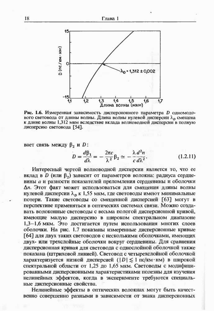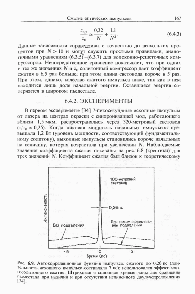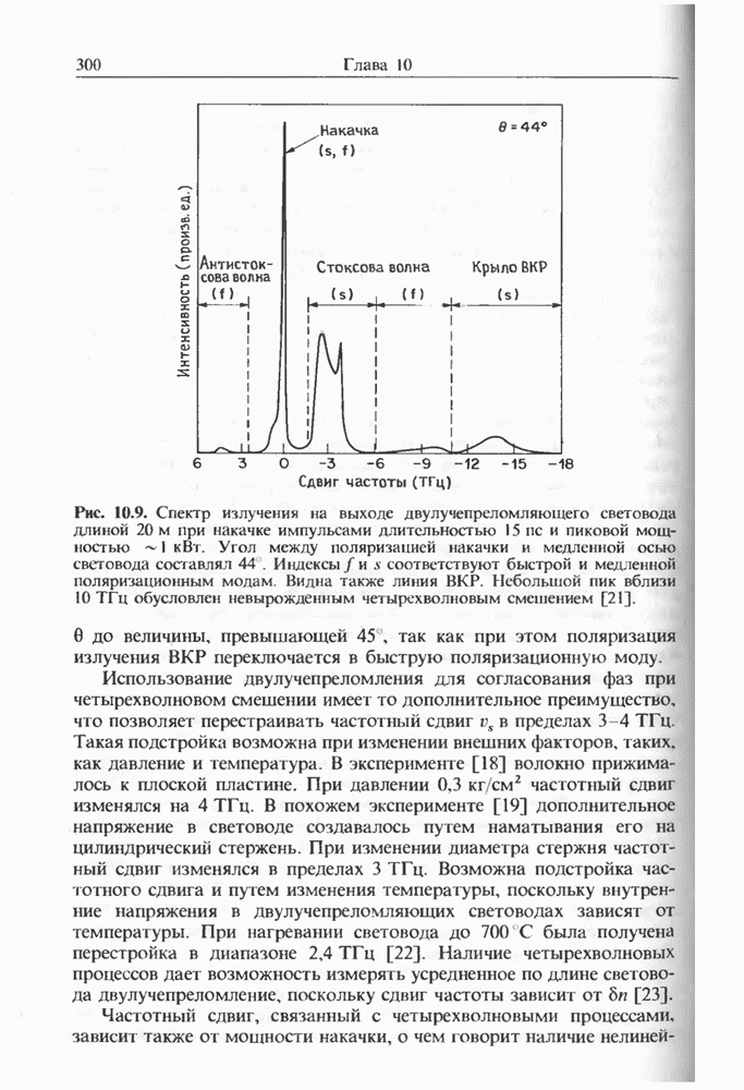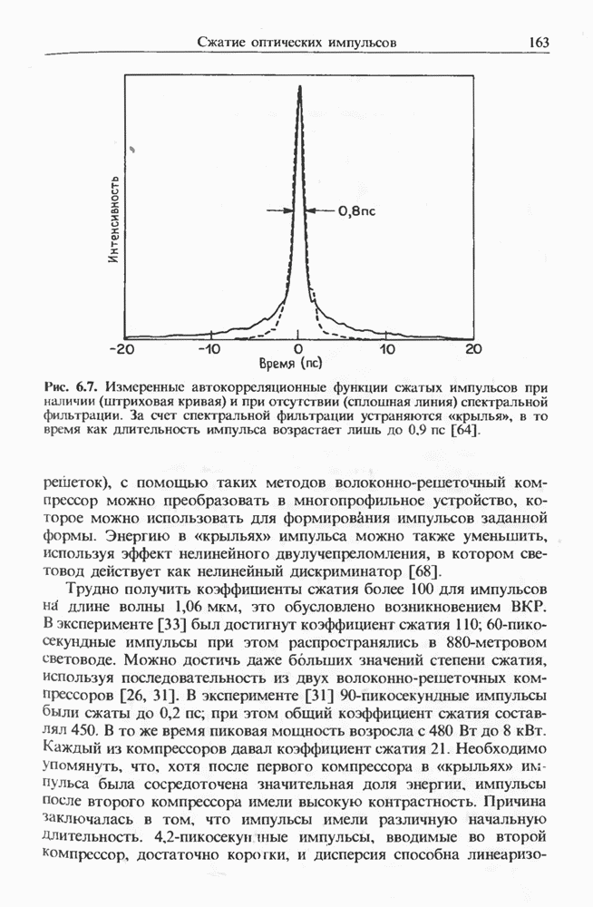 эксперименте [128] с тем же лазером использовался световод с нулем дисперсии, смещенным на 1,46 мкм Первая стоксова компонента на длине волны 1,407 мкм служила накачкой для генерации стоксовой компоненты второго порядка (на 1,516 мкм) в области отрицательной дисперсии световода. Длительность импульса ВКР, связанного со второй стоксовой компонентой, составила У импульса был широкий пьедестал, и лишь около 30% энергии распространялось в виде солитона