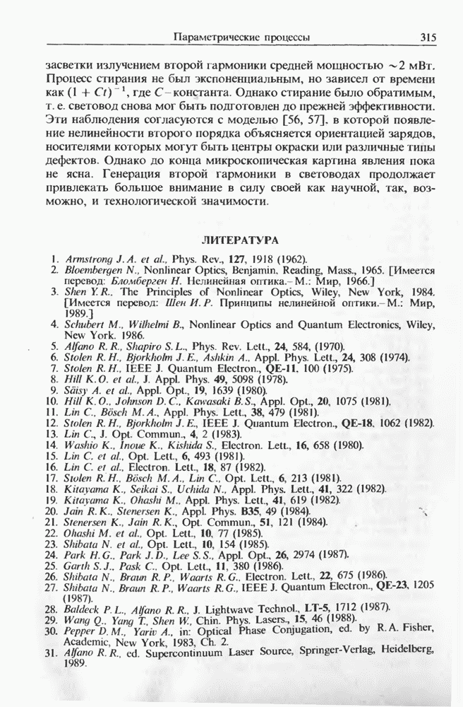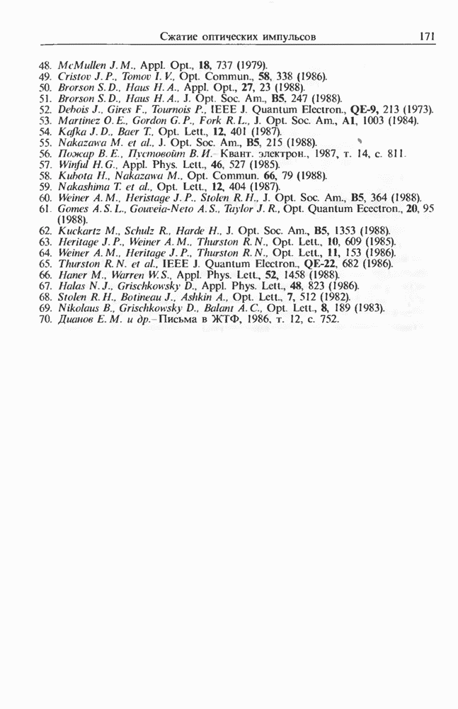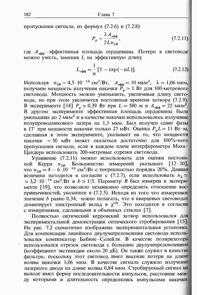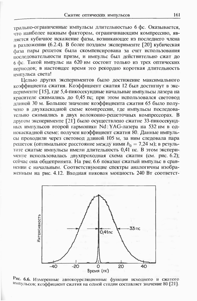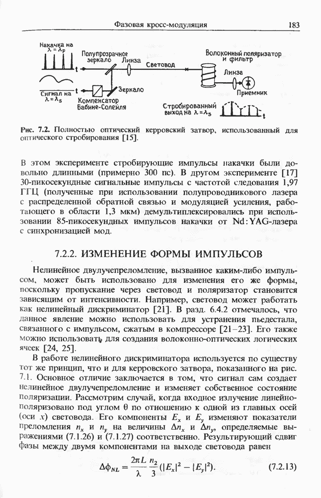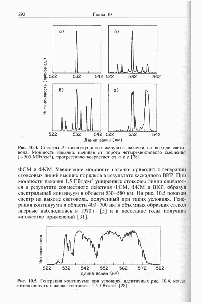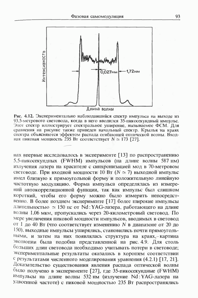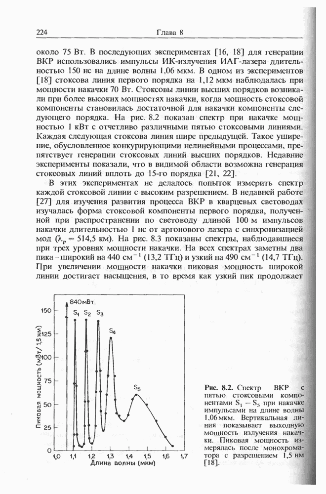1,06 мкм создавал импульсы длительностью на длине волны 1,5 мкм, хотя его длительность составляла Входной пиковой мощности было достаточно для генерации многих стоксовых компонент в световоде длиной Стоксова компонента ВКР четвертого порядка вблизи длины волны 1,3 мкм служила накачкой для генерации континуума, который простирался до 1,7 мкм. В двухступенчатой схеме, где вторая ступень состояла из световода со смещенной дисперсией длиной длительность импульса была сокращена до т. е. лишь до трех световых периодов.