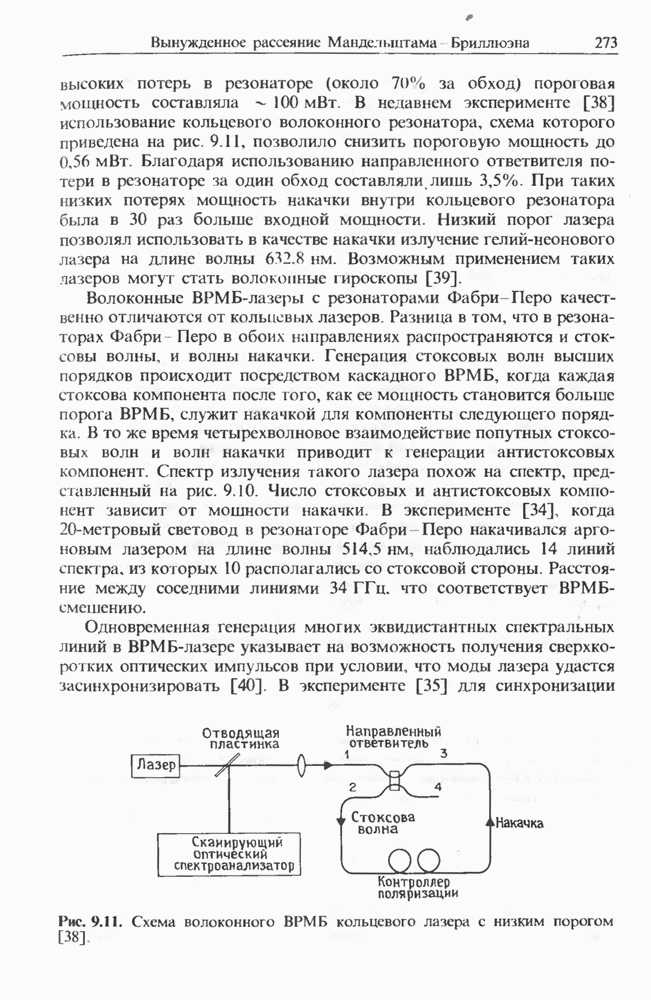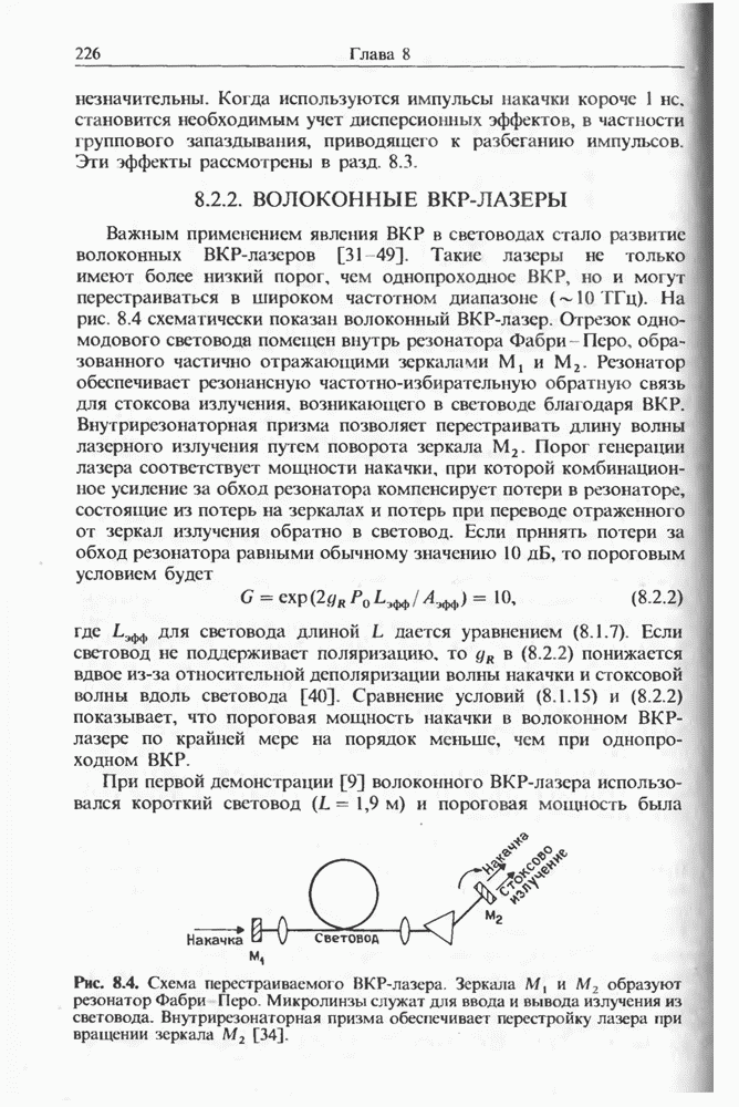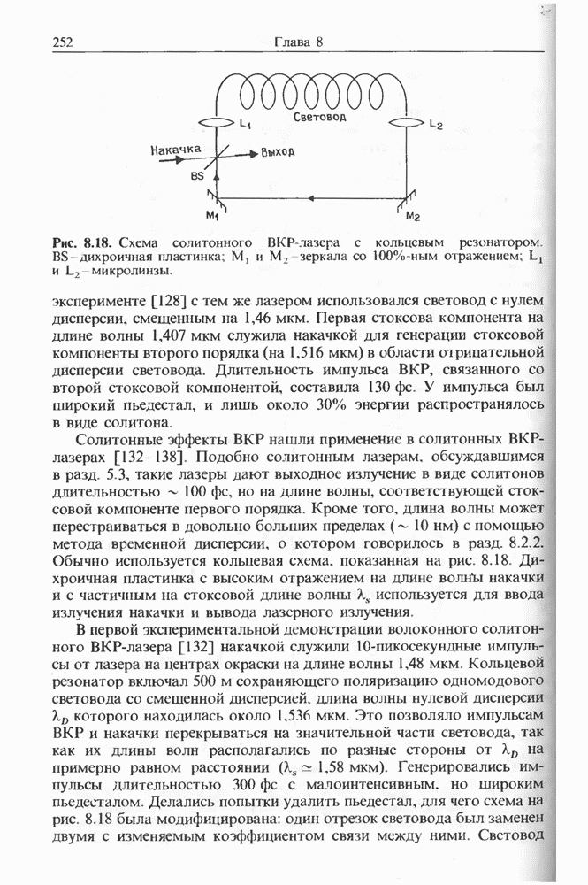 Рис. 8.18. Схема солитонного ВКР-лазера с кольцевым резонатором. дихроичная пластинка; М, и зеркала со 100%-ным отражением; и микролинзы.