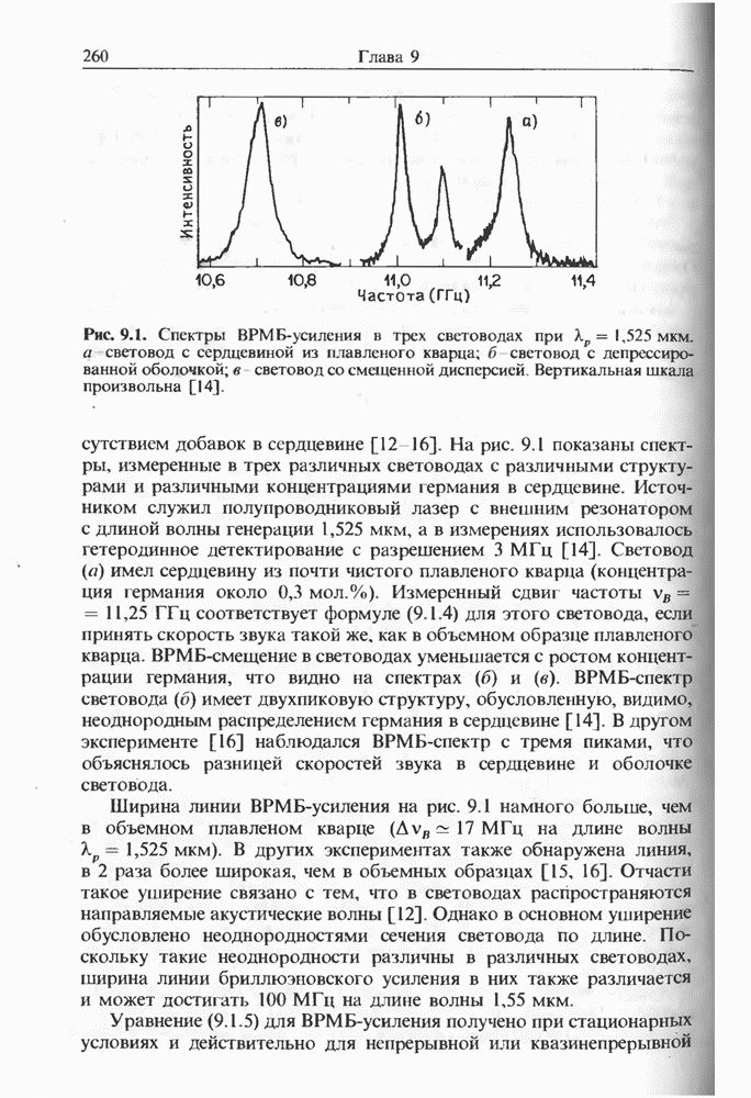 длиной обеспечивал комбинационное усиление, в то время как другой световод длиной служил для сжатия импульса в нем не возникало, поскольку при переводе излучения из одного световода в другой мощность накачки опускалась ниже порога.). Удавалось получить импульсы без пьедестала длительностью когда разница длин соответствовала 380 см 1 или Однако, когда длины волн отстояли друг от друга на соответствует пику комбинационного усиления), значительная часть энергии импульса содержалась в широком пьедестале. Такое сложное поведение связано с эффектом