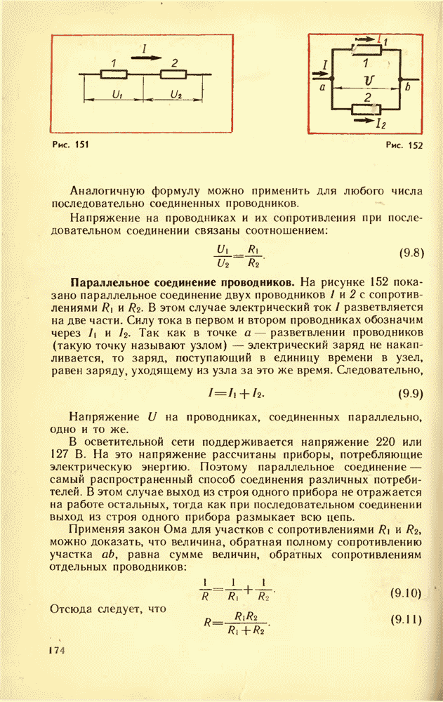Последовательное соединение проводников. При последовательном соединении электрическая цепь не имеет разветвлений. Все проводники включают в цепь поочередно друг за другом. На рисунке 151 показано последовательное соединение двух проводников