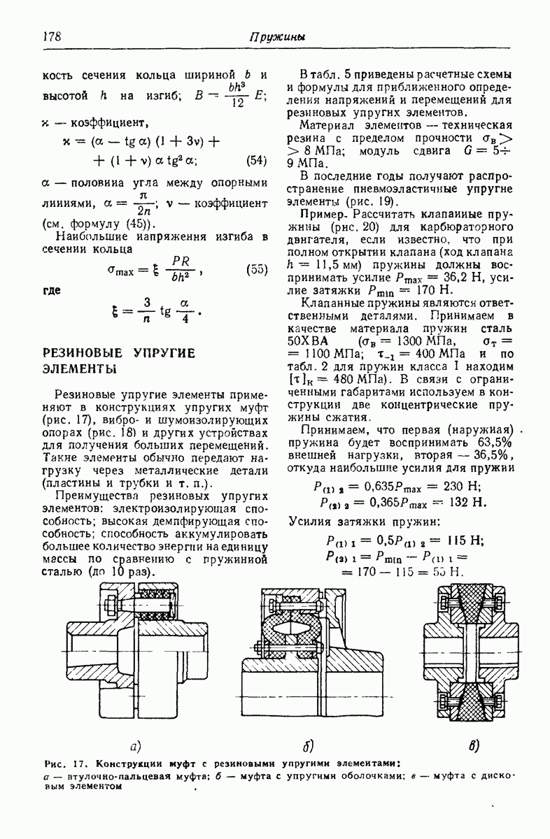 Резиновые упругие элементы применяют в конструкциях упругих муфт (рис. 17), вибро- и шумоизолирующих опорах (рис. 18) и других устройствах для получения больших перемещений. Такие элементы обычно передают нагрузку через металлические детали (пластины и трубки и т. п.).