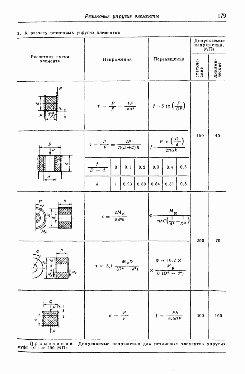 В табл. 5 приведены расчетные схемы и формулы для приближенного определения напряжений и перемещений для резиновых упругих элементов.