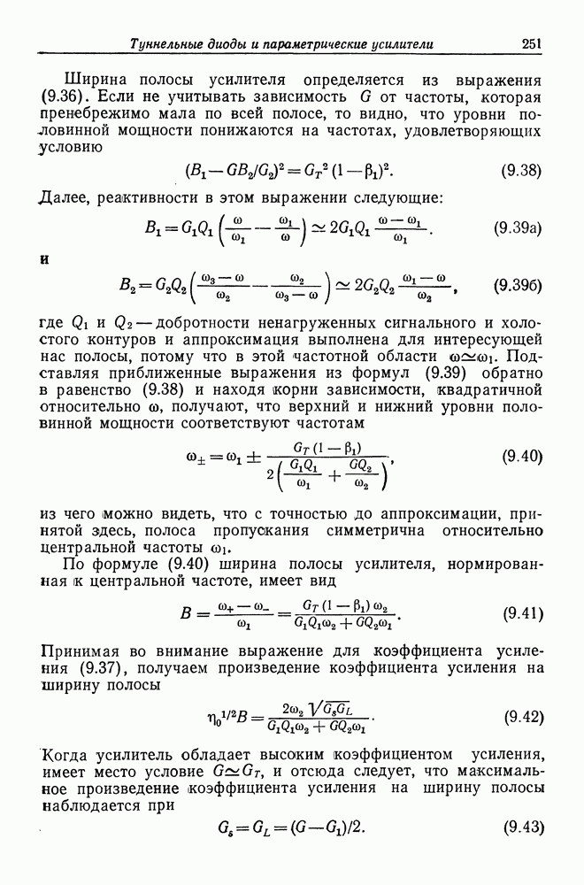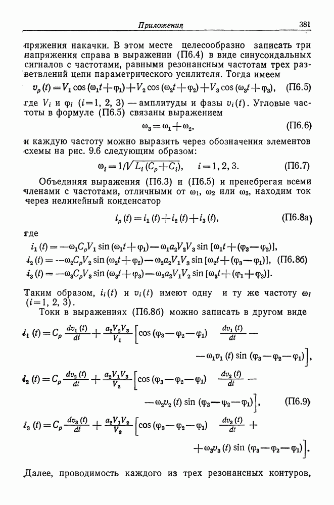 амплитуда накачки. В выражениях (9.34) подразумевается, что полосы пропускания трех резонансных контуров на рис. 9.6 не перекрываются, так что для всех частот внутри полосы пропускания любого из этих контуров остальные два имеют бесконечные проводимости.
