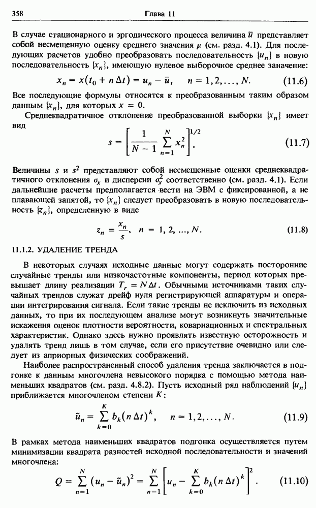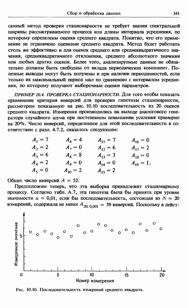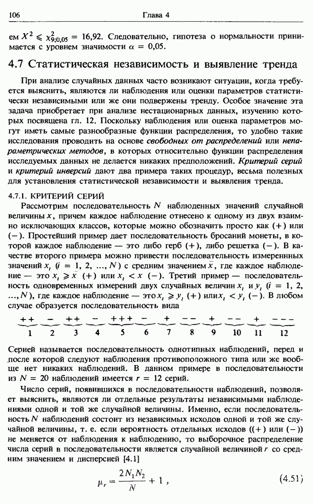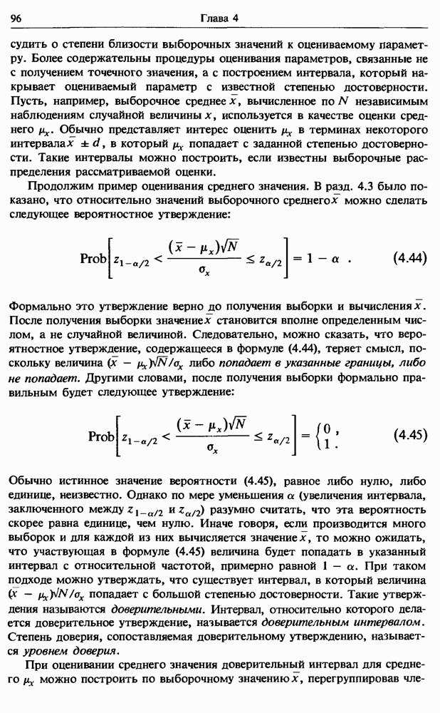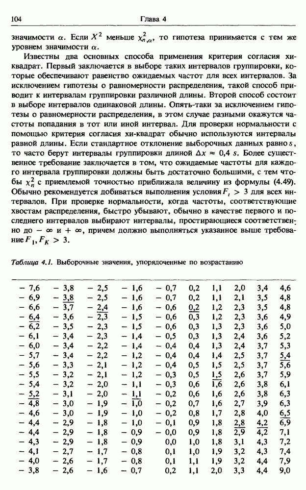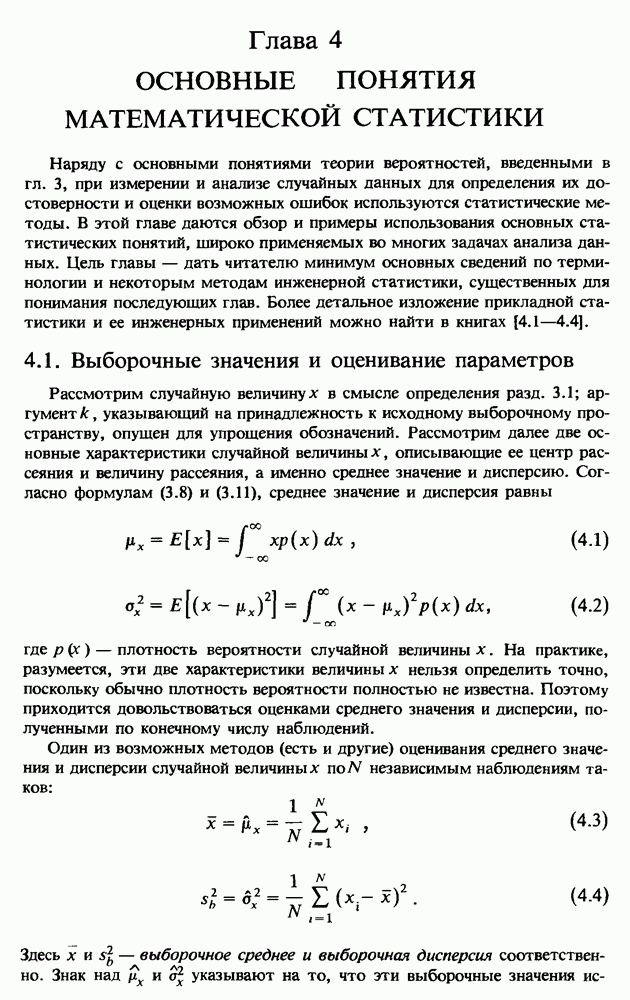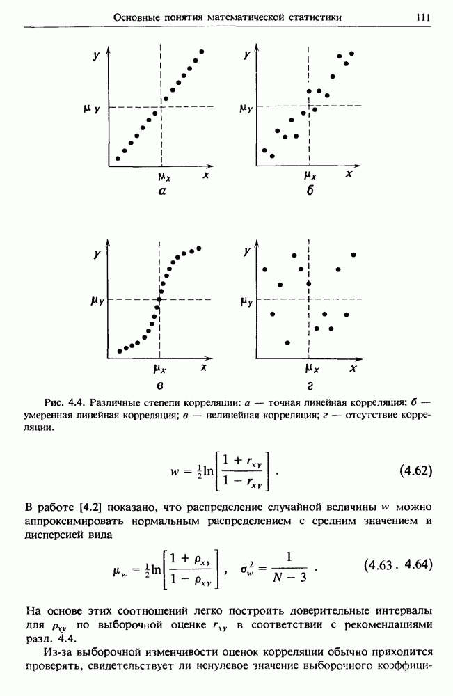 то предсказанное значение у, будет в точности равняться наблюденному значению у, при любом данном. Однако на практике обычно отсутствует идеальная линейная зависимость между данными. Как правило, внешние случайные воздействия приводят к разбросу данных, и, кроме того, возможны искажения за счет присутствия нелинейных эффектов (см. рис. 4.4). Тем не менее, если все же предположить существование линейной связи и наличие неограниченной выборки, то можно подобрать такие значения