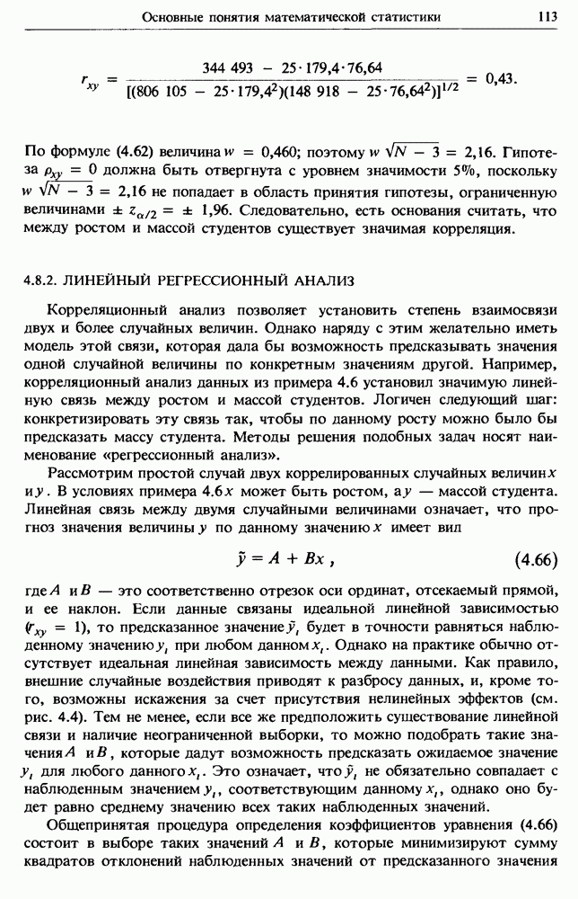 . В условиях примера 4.6 может быть ростом, а у — массой студента. Линейная связь между двумя случайными величинами означает, что прогноз значения величины по данному значению имеет вид