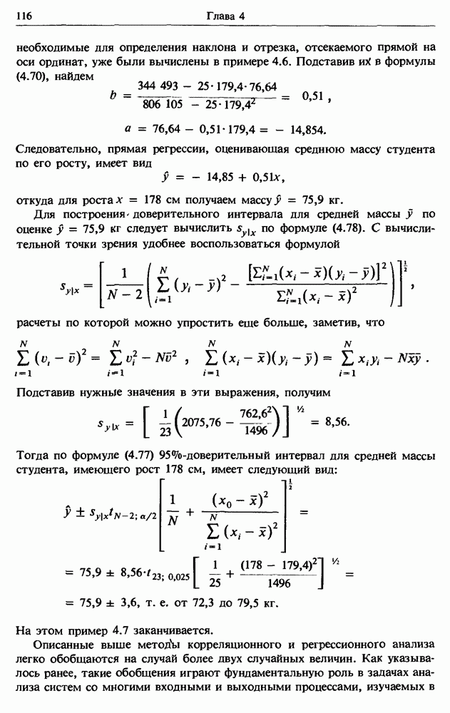 ПРИМЕР 4.7. ЛИНЕЙНЫЙ РЕГРЕССИОННЫЙ АНАЛИЗ. Определим по данным, содержащимся в табл. 4.3 из примера 4.6, прямую регрессии, задающую линейный прогноз средней массы студента по его росту. Найдем также 95%-доверительный интервал для средней массы студентов, имеющих рост 178 см.
