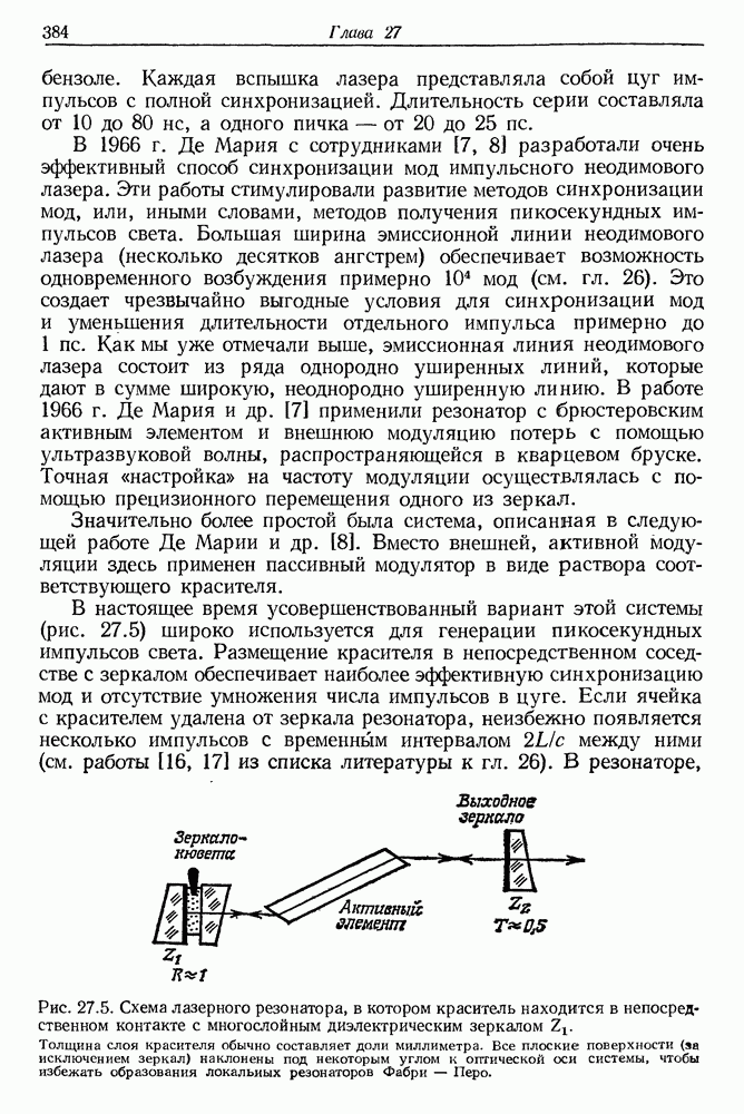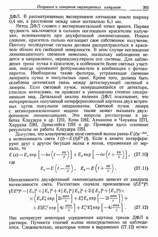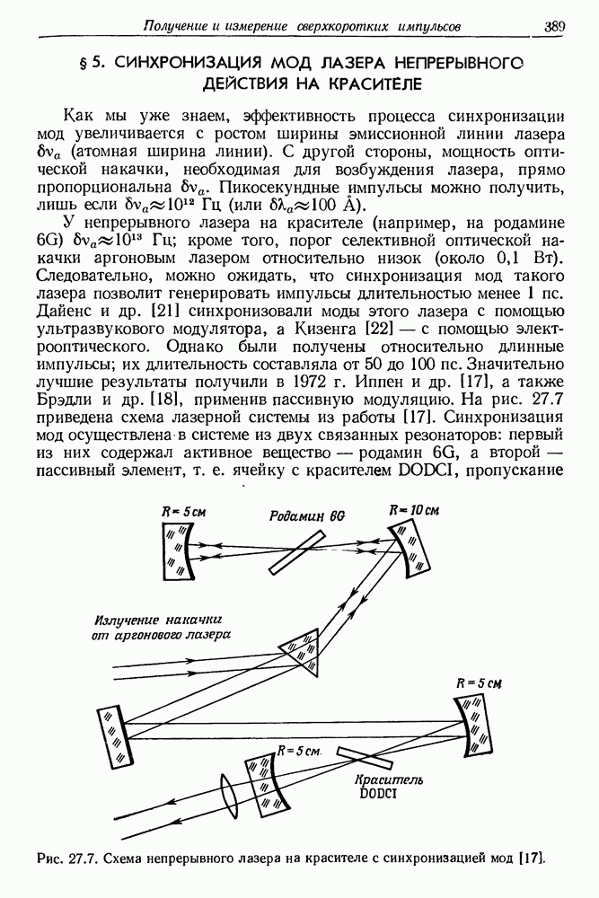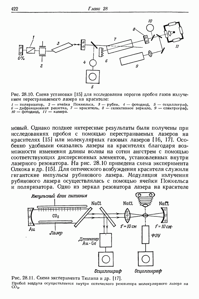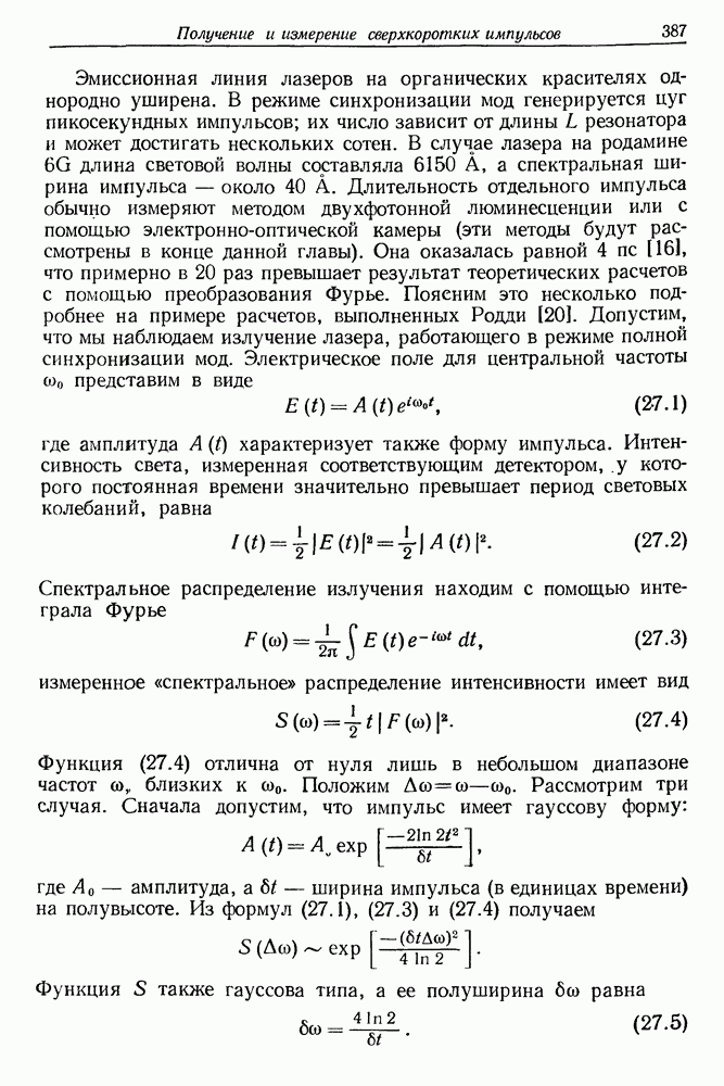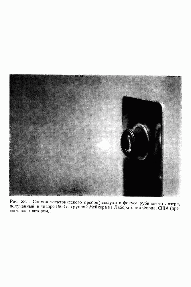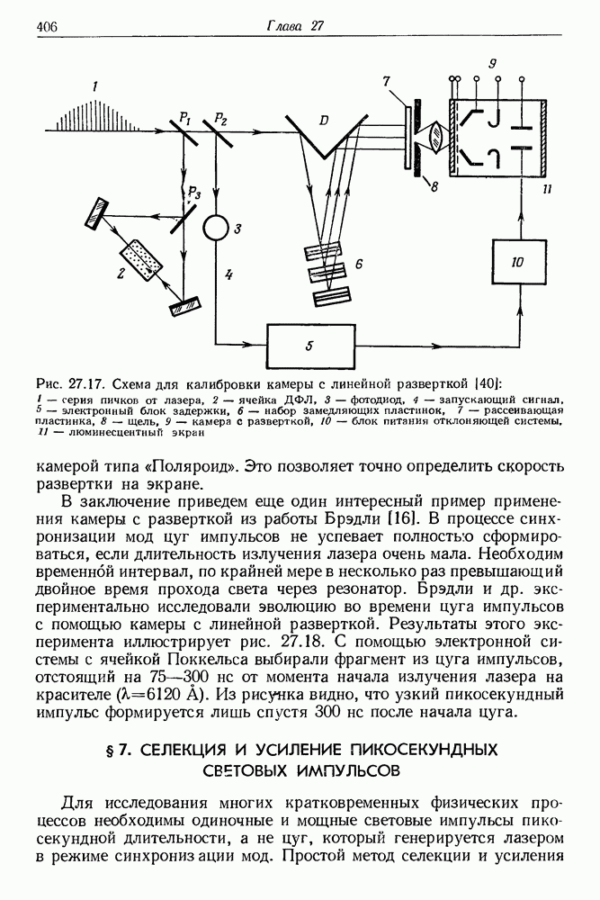 б. Сверхскоростная электронно-оптическая камера с линейной разверткойВ последние годы достигнут значительный прогресс в области высокоскоростной фотографии. Специальные камеры с линейной разверткой; содержащие электронно-оптические преобразователи и усилители света, способны регистрировать процессы пикосекундной длительности. Ввиду большого значения этих устройств, для лазерной техники рассмотрим их несколько подробнее. Электроннооптический преобразователь изображений (ЭОП) был создан в 1934 г. Хольстом и др. [31]. Он позволял видеть предметы, освещенные инфракрасным излучением. Принцип действия ЭОП проиллюстрирован на рис. 27.9. Инфракрасное изображение формируется на фоточувствительном катоде и выбивает из него электроны. Поток электронов ускоряется, формируется с помощью электростатической линзы (цилиндрического анода) и создает видимое изображение на люминесцентном экране. Преобразователи такого типа широко применялись в 60-х годах для визуализации пучков первых гелий-неоновых лазеров, работающих в близкой инфракрасной области спектра (1,15 мкм). Применение ЭОП в сверхскоростной фотографии началось в 50-х годах для регистрации процессов наносекундной длительности и в 70-х годах для регистрации пикосекундных процессов. Читателям, интересующимся этими вопросами, рекомендуем обширный обзор Смита [32]. В скоростной фотографии существуют следующие варианты систем с ЭОП: 1. Фотографирование одиночного изображения: в этом случае ЭОП снабжается соответствующим затвором. 2. Фотографирование процесса с заданными временными интервалами. Изображения регистрируются на движущейся кинопленке. Возможна также регистрация последовательных изображений на различных участках неподвижной фотопленки с помощью электростатических или магнитных отклоняющих систем. Такая регистрация называется покадровой. 3. Непрерывное фотографирование процесса на неподвижную пленку. К электростатической или магнитной отклоняющей системе прикладываются напряжение или ток, которые вызывают линейное во времени перемещение потока электронов по поверхности экрана. В этом случае говорят о системах с линейной разверткой. Очевидно, ЭОП для покадровой съемки и системы с разверткой представляют собой более сложные устройства, чем преобразователь