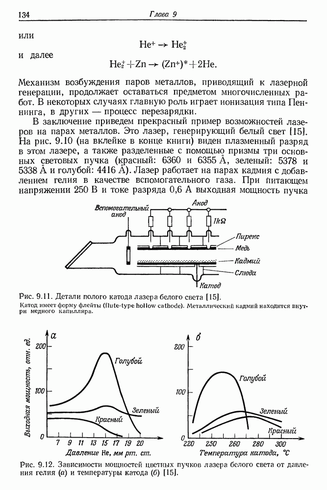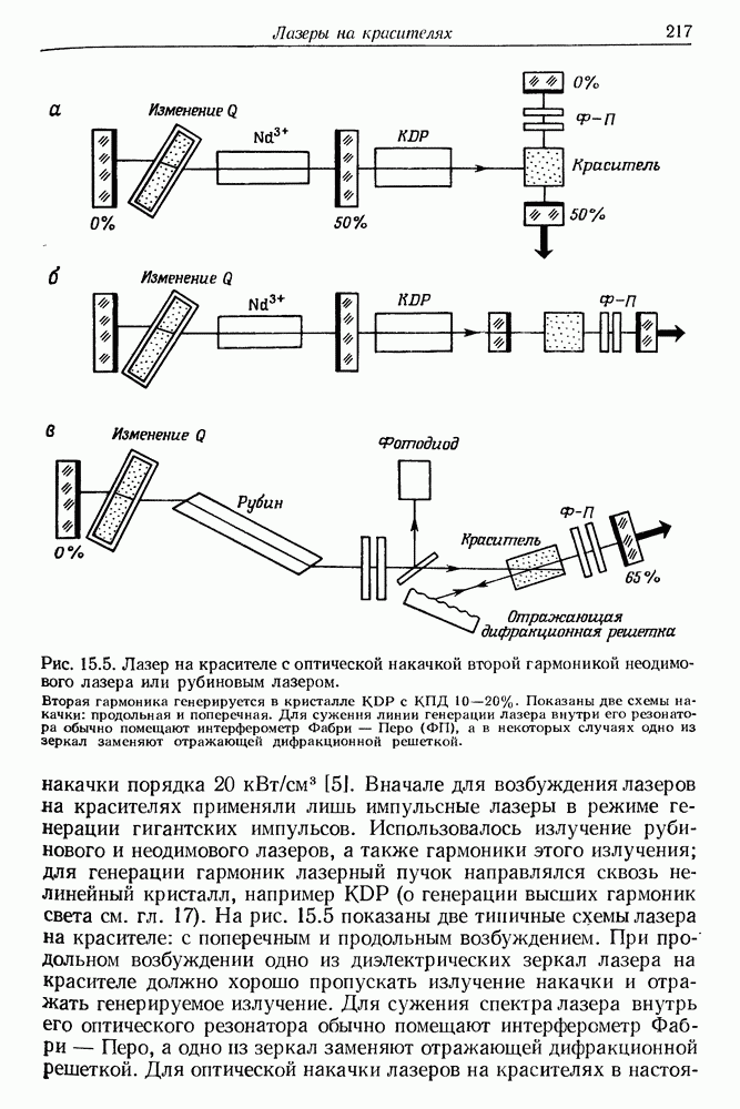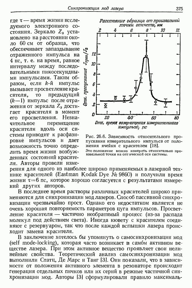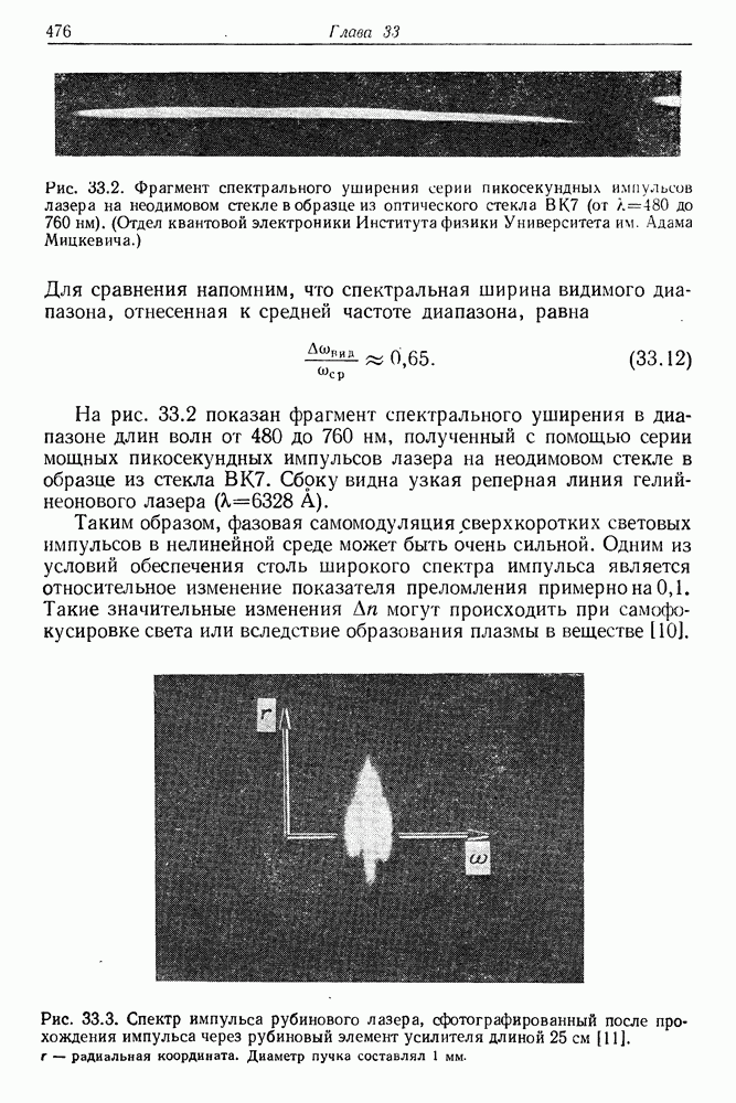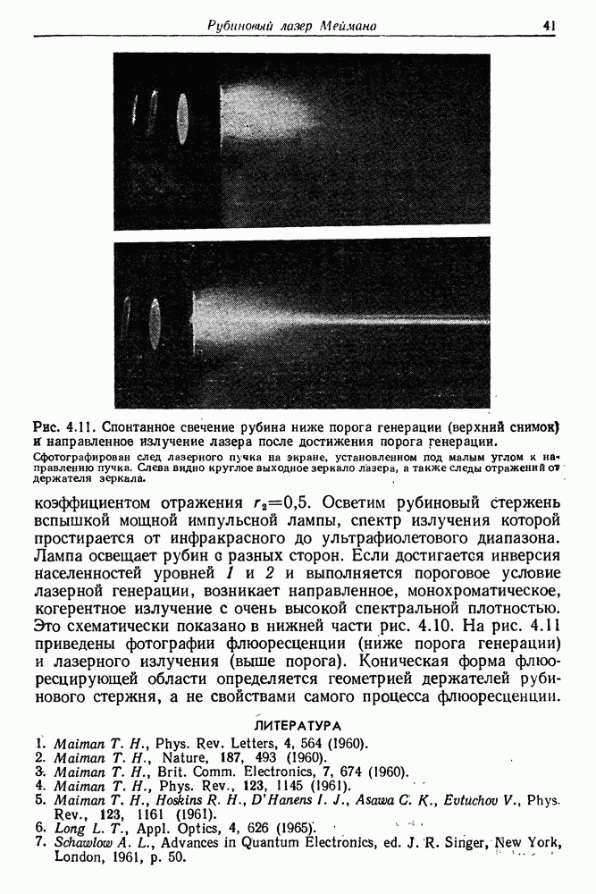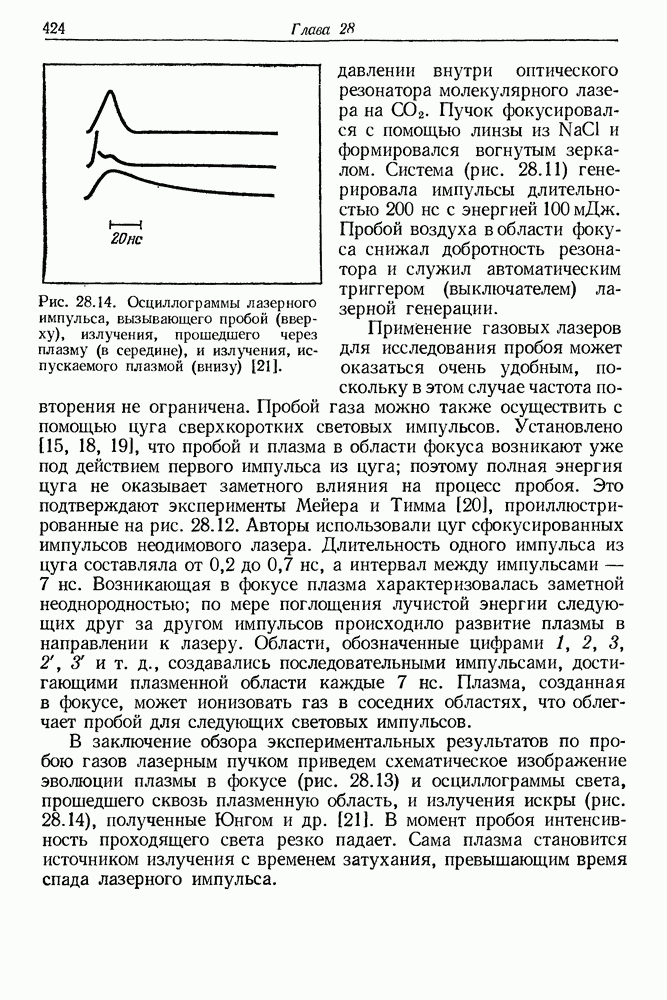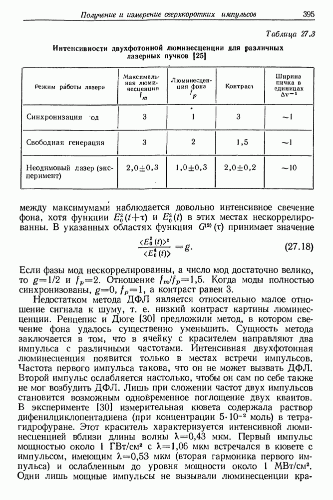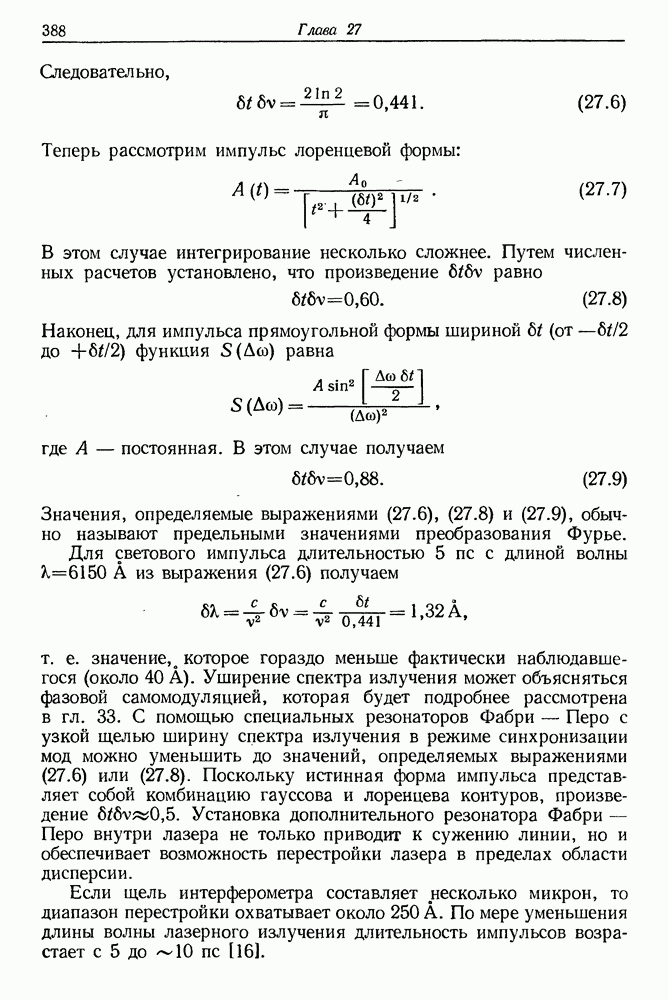 б. Сверхскоростная электронно-оптическая камера с линейной разверткойВ последние годы достигнут значительный прогресс в области высокоскоростной фотографии. Специальные камеры с линейной разверткой; содержащие электронно-оптические преобразователи и усилители света, способны регистрировать процессы пикосекундной длительности. Ввиду большого значения этих устройств, для лазерной техники рассмотрим их несколько подробнее. Электроннооптический преобразователь изображений (ЭОП) был создан в 1934 г. Хольстом и др. [31]. Он позволял видеть предметы, освещенные инфракрасным излучением. Принцип действия ЭОП проиллюстрирован на рис. 27.9. Инфракрасное изображение формируется на фоточувствительном катоде и выбивает из него электроны. Поток электронов ускоряется, формируется с помощью электростатической линзы (цилиндрического анода) и создает видимое изображение на люминесцентном экране. Преобразователи такого типа широко применялись в 60-х годах для визуализации пучков первых гелий-неоновых лазеров, работающих в близкой инфракрасной области спектра (1,15 мкм). Применение ЭОП в сверхскоростной фотографии началось в 50-х годах для регистрации процессов наносекундной длительности и в 70-х годах для регистрации пикосекундных процессов. Читателям, интересующимся этими вопросами, рекомендуем обширный обзор Смита [32]. В скоростной фотографии существуют следующие варианты систем с ЭОП: 1. Фотографирование одиночного изображения: в этом случае ЭОП снабжается соответствующим затвором. 2. Фотографирование процесса с заданными временными интервалами. Изображения регистрируются на движущейся кинопленке. Возможна также регистрация последовательных изображений на различных участках неподвижной фотопленки с помощью электростатических или магнитных отклоняющих систем. Такая регистрация называется покадровой. 3. Непрерывное фотографирование процесса на неподвижную пленку. К электростатической или магнитной отклоняющей системе прикладываются напряжение или ток, которые вызывают линейное во времени перемещение потока электронов по поверхности экрана. В этом случае говорят о системах с линейной разверткой. Очевидно, ЭОП для покадровой съемки и системы с разверткой представляют собой более сложные устройства, чем преобразователь