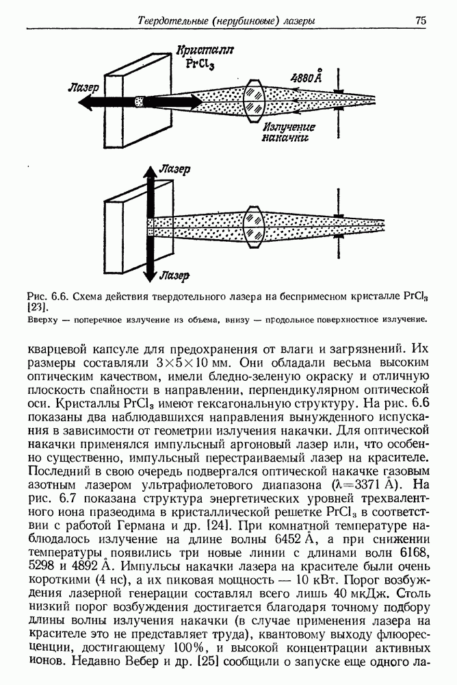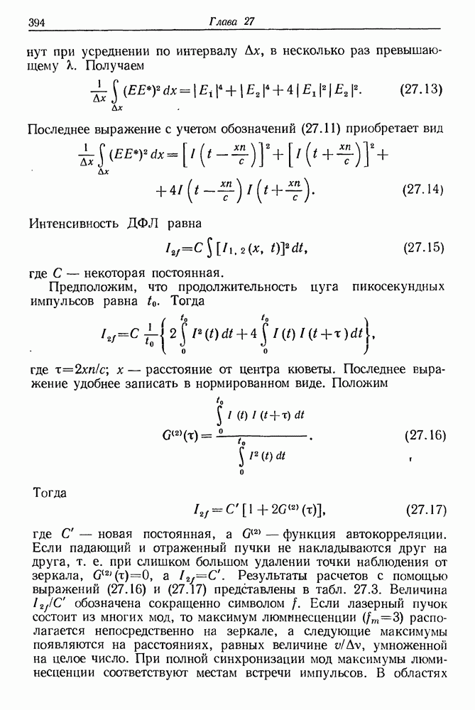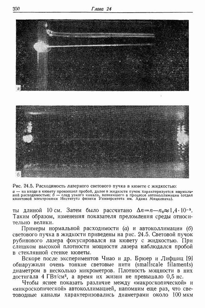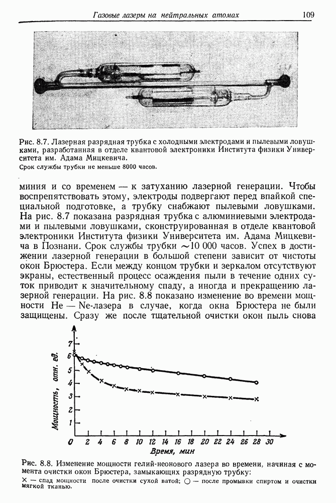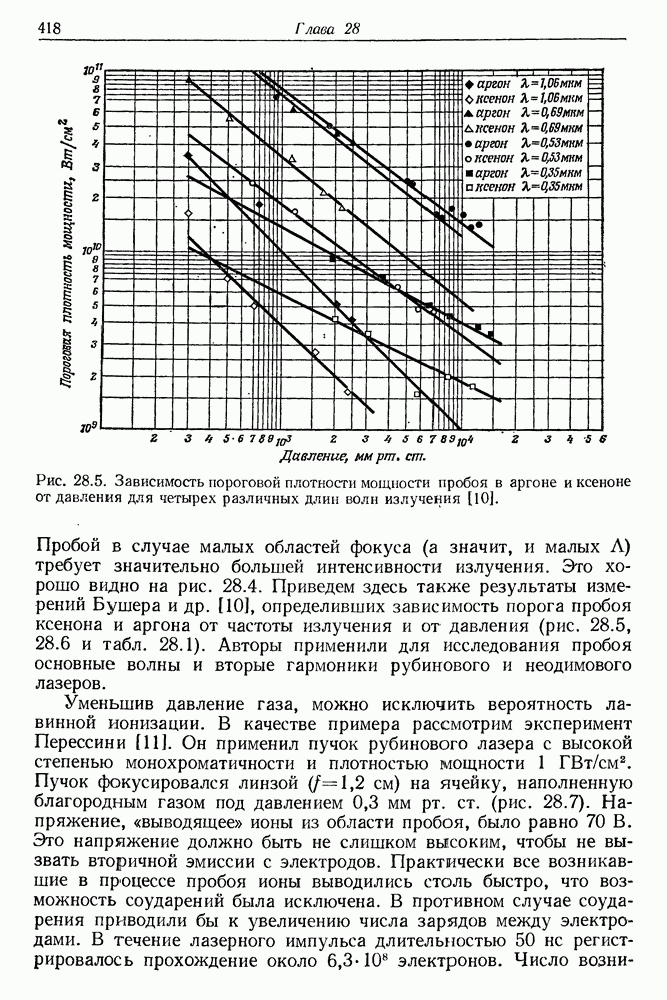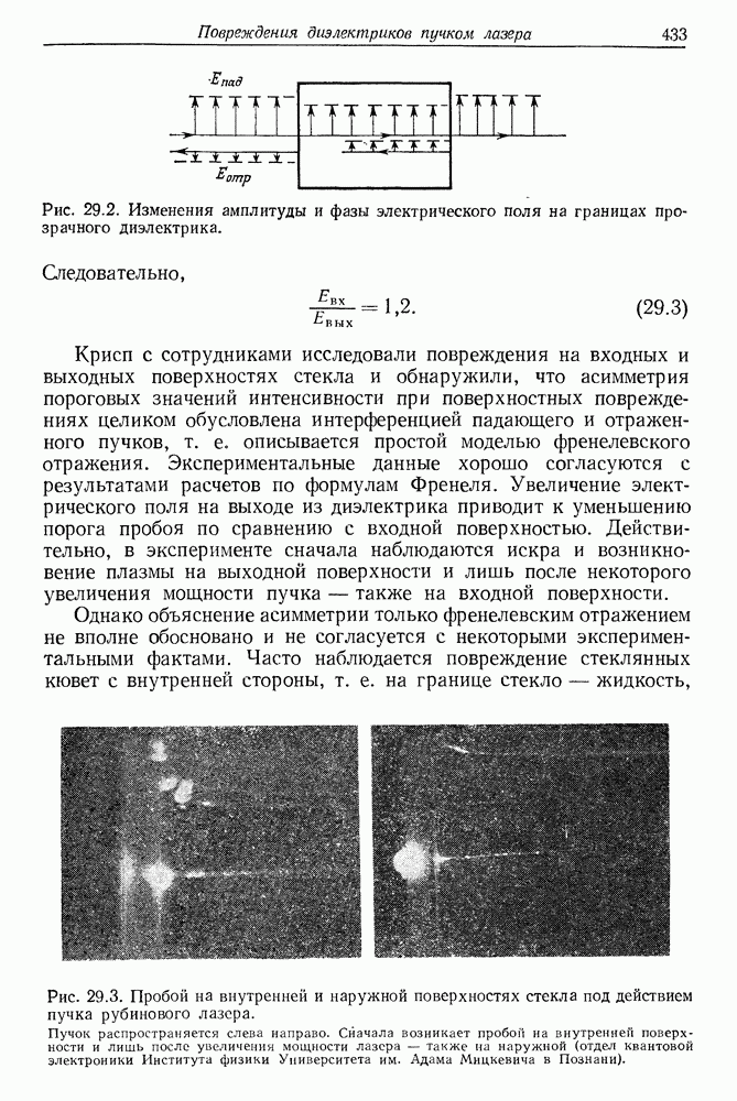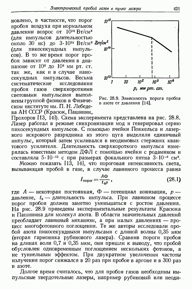 б. Сверхскоростная электронно-оптическая камера с линейной разверткойВ последние годы достигнут значительный прогресс в области высокоскоростной фотографии. Специальные камеры с линейной разверткой; содержащие электронно-оптические преобразователи и усилители света, способны регистрировать процессы пикосекундной длительности. Ввиду большого значения этих устройств, для лазерной техники рассмотрим их несколько подробнее. Электроннооптический преобразователь изображений (ЭОП) был создан в 1934 г. Хольстом и др. [31]. Он позволял видеть предметы, освещенные инфракрасным излучением. Принцип действия ЭОП проиллюстрирован на рис. 27.9. Инфракрасное изображение формируется на фоточувствительном катоде и выбивает из него электроны. Поток электронов ускоряется, формируется с помощью электростатической линзы (цилиндрического анода) и создает видимое изображение на люминесцентном экране. Преобразователи такого типа широко применялись в 60-х годах для визуализации пучков первых гелий-неоновых лазеров, работающих в близкой инфракрасной области спектра (1,15 мкм). Применение ЭОП в сверхскоростной фотографии началось в 50-х годах для регистрации процессов наносекундной длительности и в 70-х годах для регистрации пикосекундных процессов. Читателям, интересующимся этими вопросами, рекомендуем обширный обзор Смита [32]. В скоростной фотографии существуют следующие варианты систем с ЭОП: 1. Фотографирование одиночного изображения: в этом случае ЭОП снабжается соответствующим затвором. 2. Фотографирование процесса с заданными временными интервалами. Изображения регистрируются на движущейся кинопленке. Возможна также регистрация последовательных изображений на различных участках неподвижной фотопленки с помощью электростатических или магнитных отклоняющих систем. Такая регистрация называется покадровой. 3. Непрерывное фотографирование процесса на неподвижную пленку. К электростатической или магнитной отклоняющей системе прикладываются напряжение или ток, которые вызывают линейное во времени перемещение потока электронов по поверхности экрана. В этом случае говорят о системах с линейной разверткой. Очевидно, ЭОП для покадровой съемки и системы с разверткой представляют собой более сложные устройства, чем преобразователь