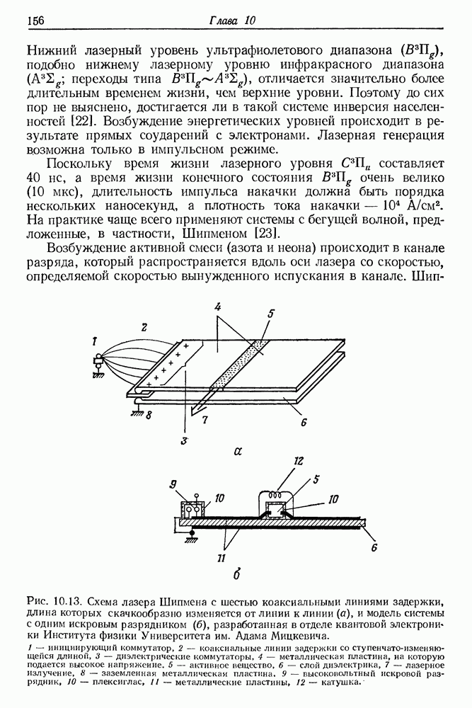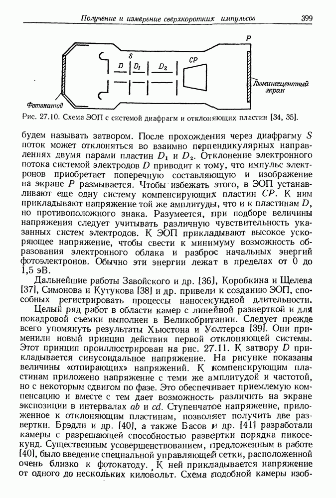 Рис. 27.10. Схема ЭОП с системой диафрагм и отклоняющих пластин [34, 35]. будем называть затвором. После прохождения через диафрагму 5 поток может отклоняться во взаимно перпендикулярных направлениях двумя парами пластин Дальнейшие работы Завойского и др. Целый ряд работ в области камер с линейной разверткой и для покадровой съемки выполнен в Великобритании. Следует прежде всего упомянуть результаты Хьюстона и Уолтерса [39]. Они применили новый принцип действия первой отклоняющей системы. Этот принцип проиллюстрирован на рис. 27.11. К затвору