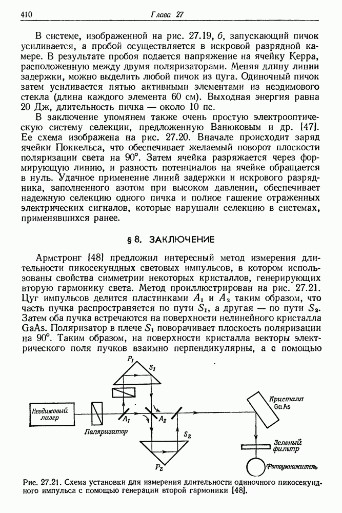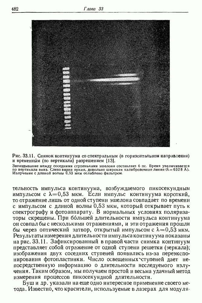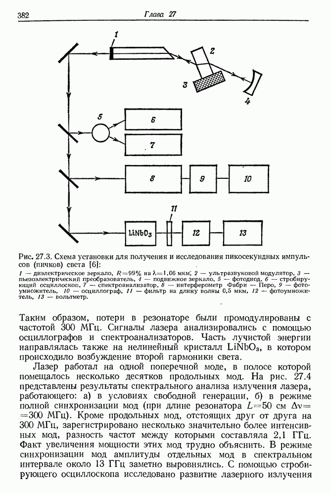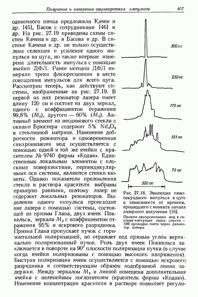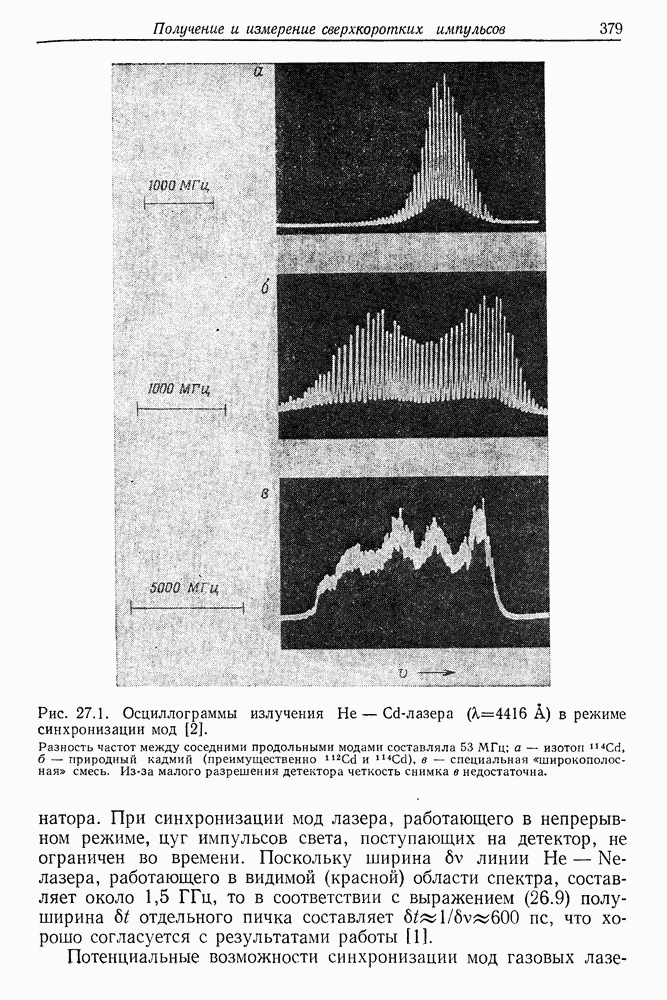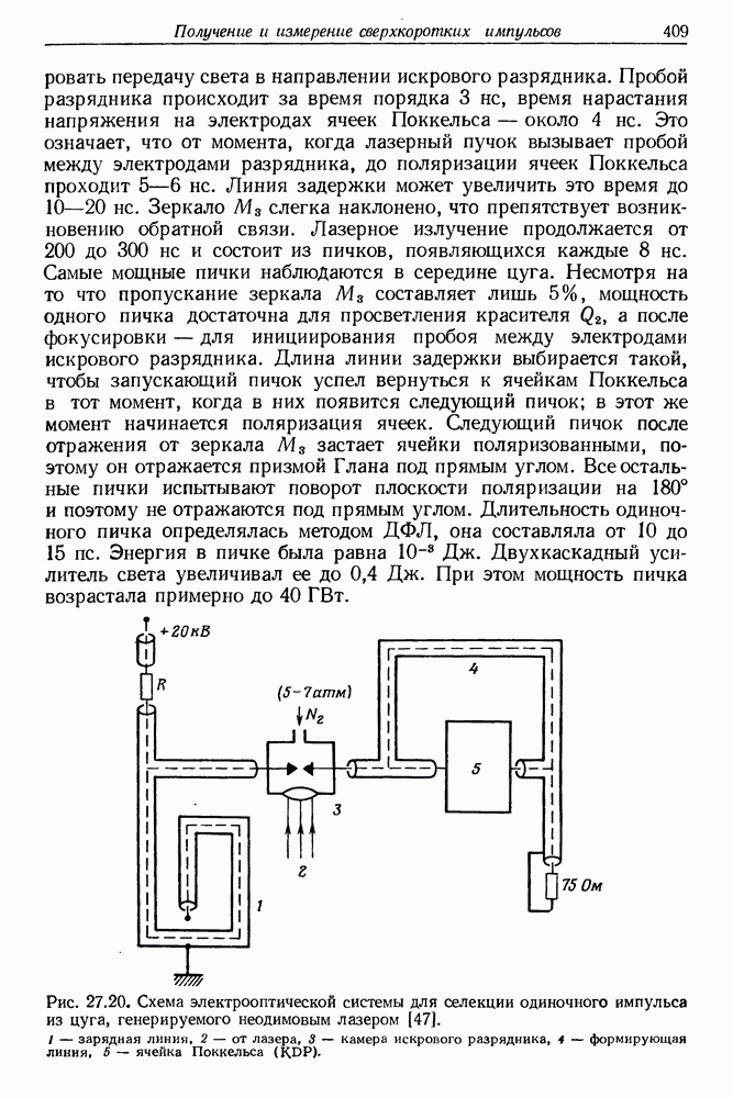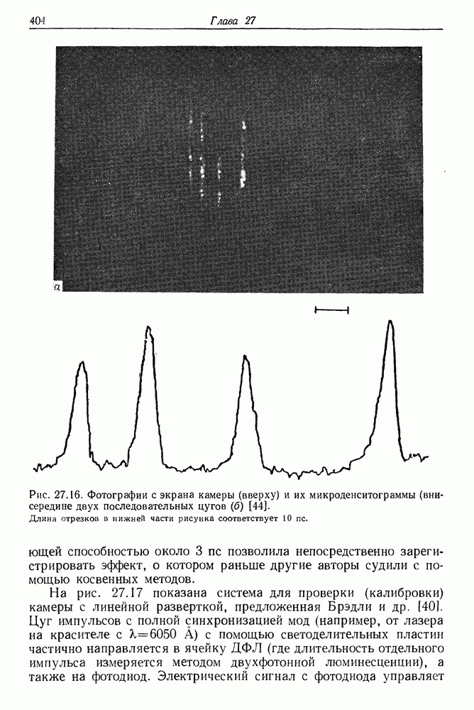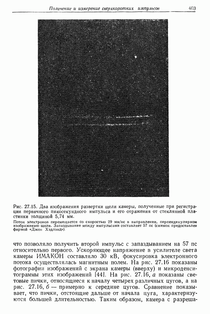 Рис. 27.14. Внешний вид камеры фирмы «Джон Хэдлэнд». Параметры камеры: скорость развертки от повышает разрешающую способность. Камера типа В СССР в группе Басова создан несколько иной тип сверхскоростной камеры с разверткой; камера получила название «пико-хрон» [43]. Поток электронов отклоняется аксиальным магнитным полем, а след на люминесцентном экране имеет форму спирали. Если камера регистрирует цуг пикосекундных лазерных импульсов, указанная спираль состоит из светящихся пятнышек. Ширина пятнышка является мерой длительности импульса, а расстояние между пятнышками характеризует периодичность появления импульсов.