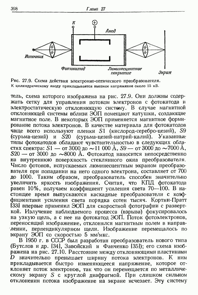Рис. 27.9. Схема действия электронно-оптического преобразователя. К цилиндрическому аноду прикладывается высокое напряжение около схема которого изображена на рис. 27.9. Они должны содержать сетку для управления потоком электронов с фотокатода и электростатическую отклоняющую систему. В случае магнитной отклоняющей системы вблизи ЭОП помещают катушки, создающие магнитное поле. В некоторых ЭОП применяется магнитное формирование потока электронов. В качестве материала для фотокатодов чаще всего используют пленки В 1950 г. в СССР был разработан преобразователь нового типа (Бутслов и др. [34], Завойский и Фанченко