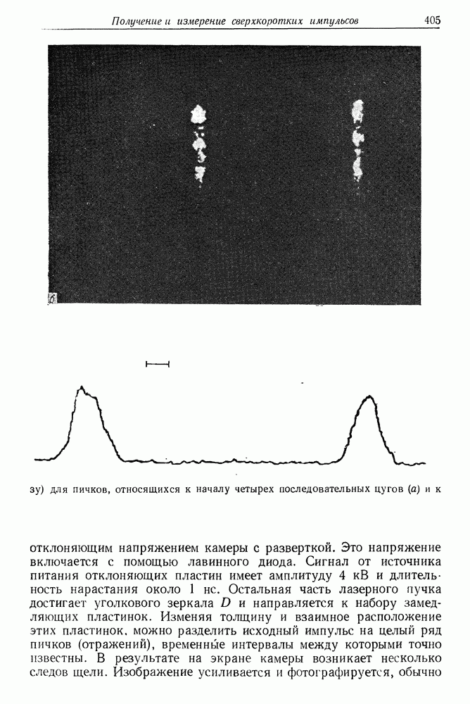 Рис. 27.11. Графики отпирающего, компенсирующего и отклоняющего напряжений в камере: а — напряжение на пластинах D, б - напряжение на пластинах изображена на рис. 27.12. При ускоряющем напряжении На рис. 27.13 и 27.14 показаны конструктивные особенности и внешний вид камеры с разверткой и для покадровой съемки известной английской фирмы «Джон Хэдлэнд». Однако лучшими считаются камеры фирмы «Электро-Фотоникс» из Северной Ирландии, созданные в сотрудничестве с группой Брэдли