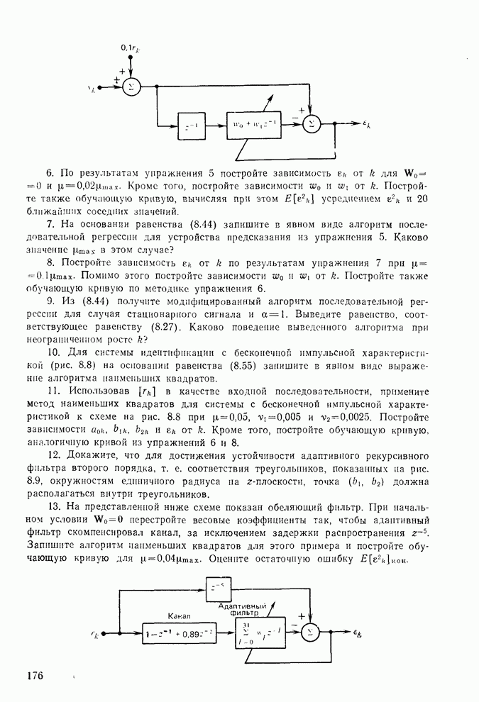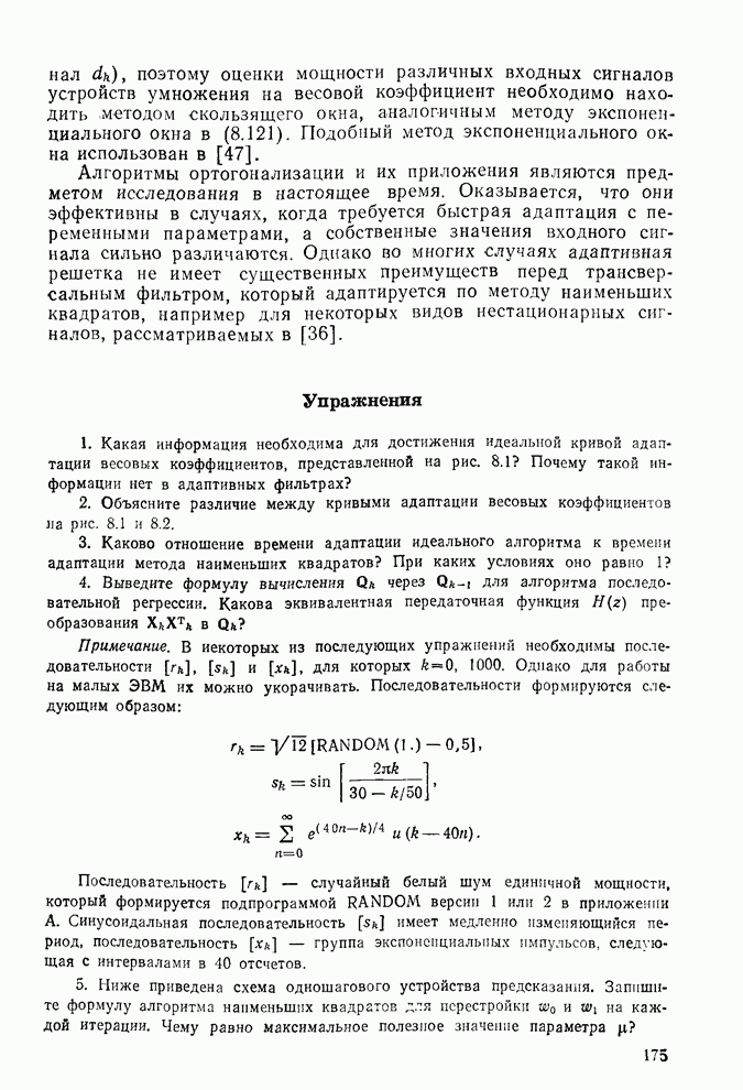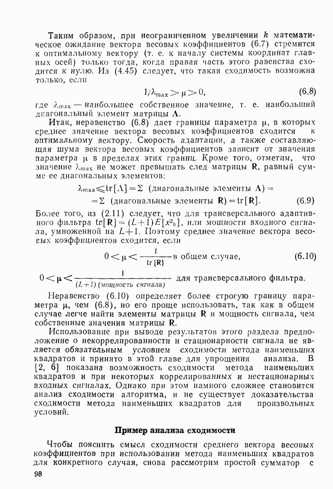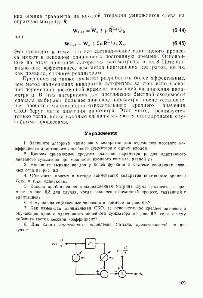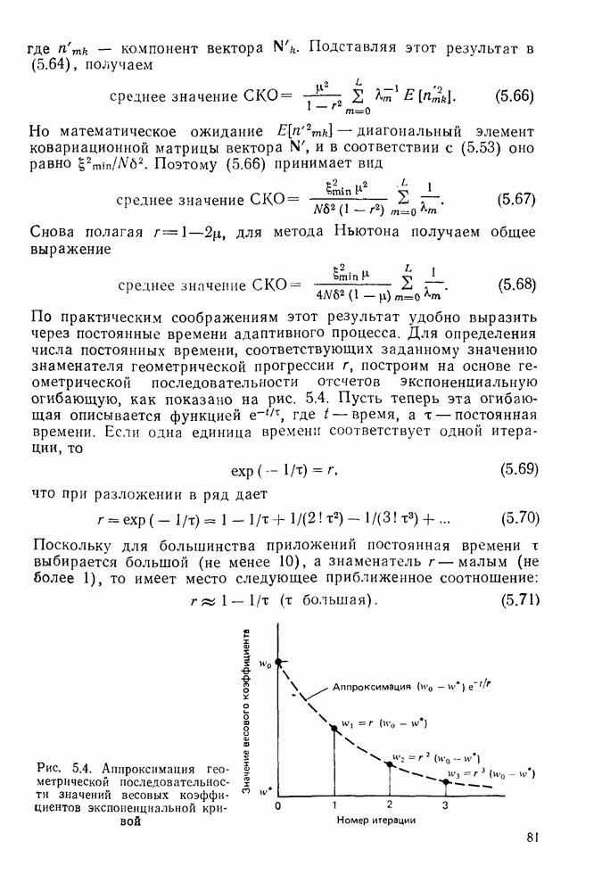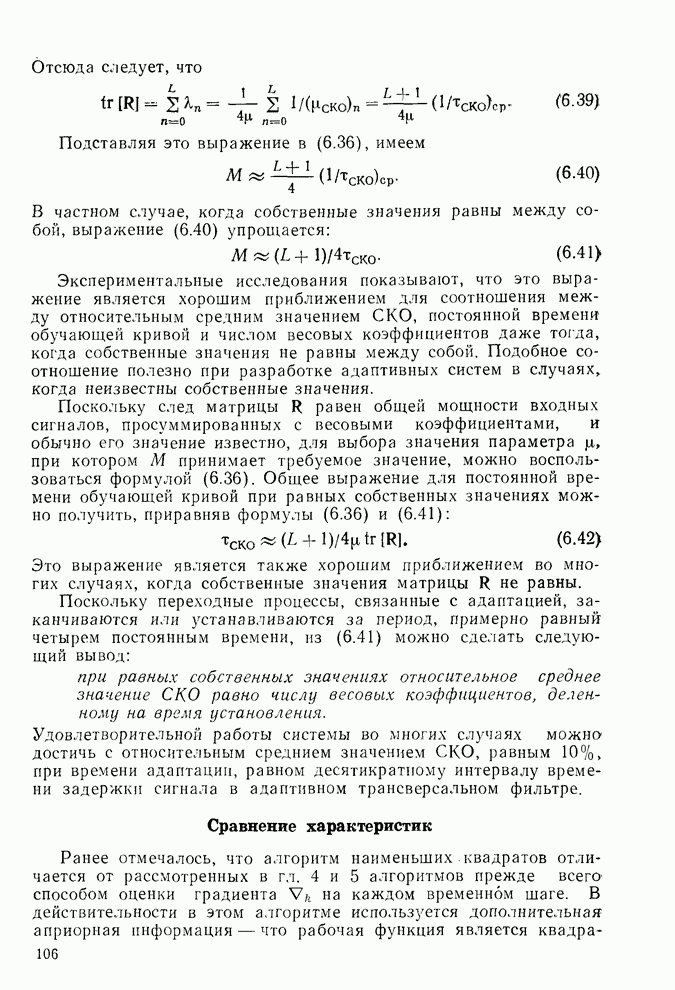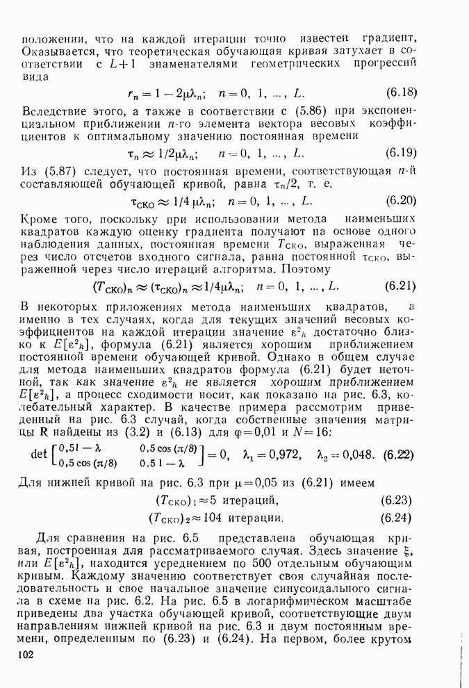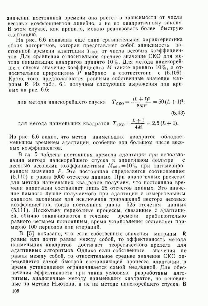 , а число N можно уменьшить, если на одной итерации брать меньше отсчетов сигнала ошибки. Ясно, что система с малым размером шага и малым количеством данных на одном шаге эквивалентна системе с большим размером шага и большим количеством данных на одном шаге. Как следует из (5.98), важным показателем является количество данных, которые обрабатываются за период, равный постоянной времени адаптации.