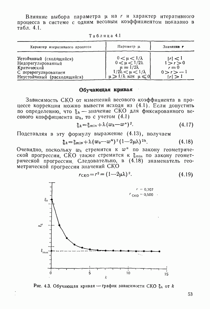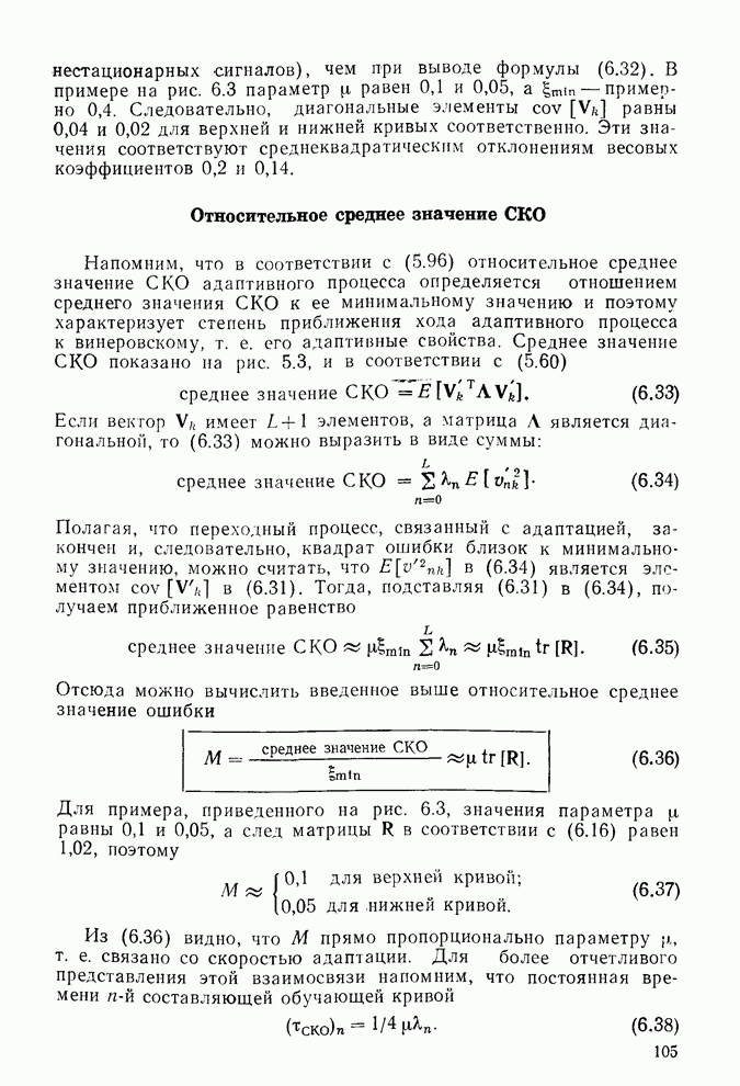 Среднее значение СКО есть усредненное приращение среднеквадратической ошибки относительно минимальной. Эти величина позволяет измерить усредненную во времени разность между действительной и оптимальной характеристиками адаптивного процесса. Еще одной мерой такой разности, особенно полезной при разработке адаптивных процессов, является относительное среднее значение СКО М, которое определим как отношение среднего значения СКО к ее минимальному значению:
