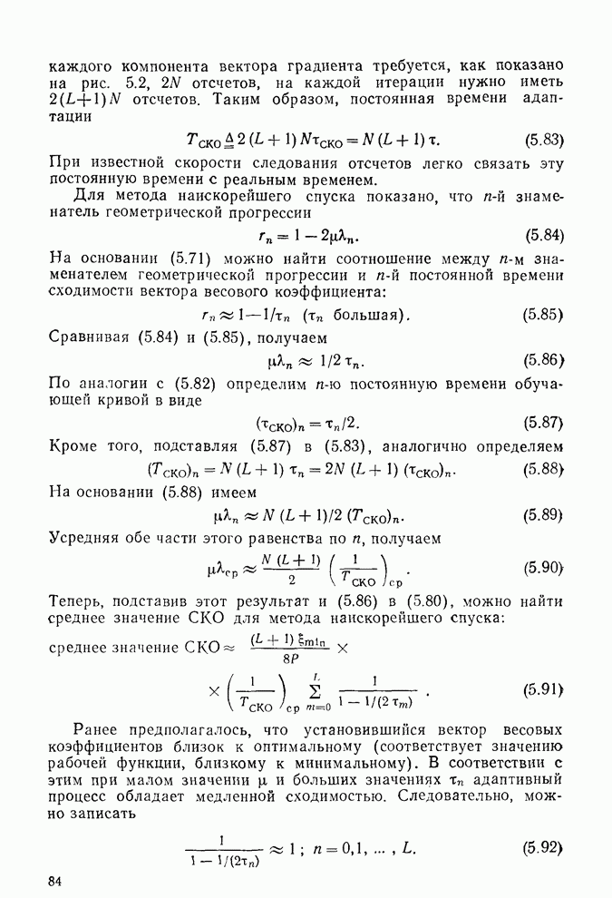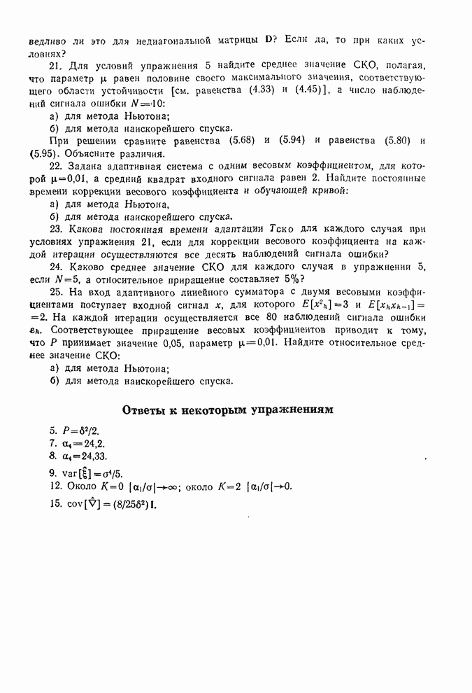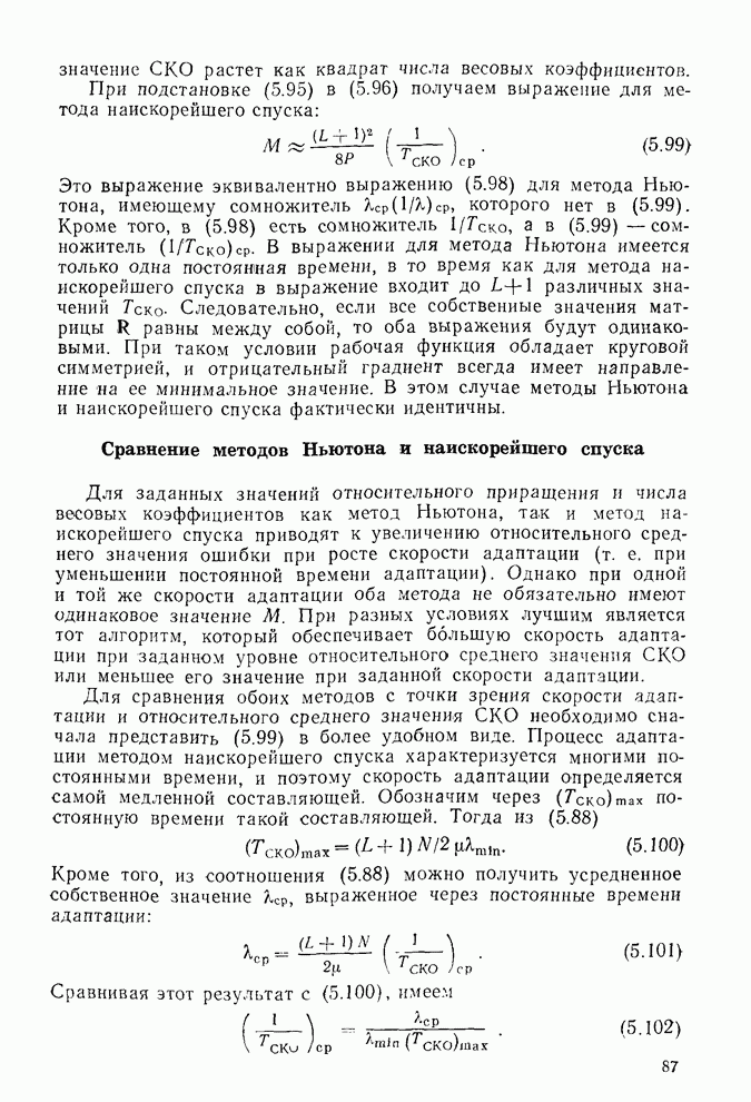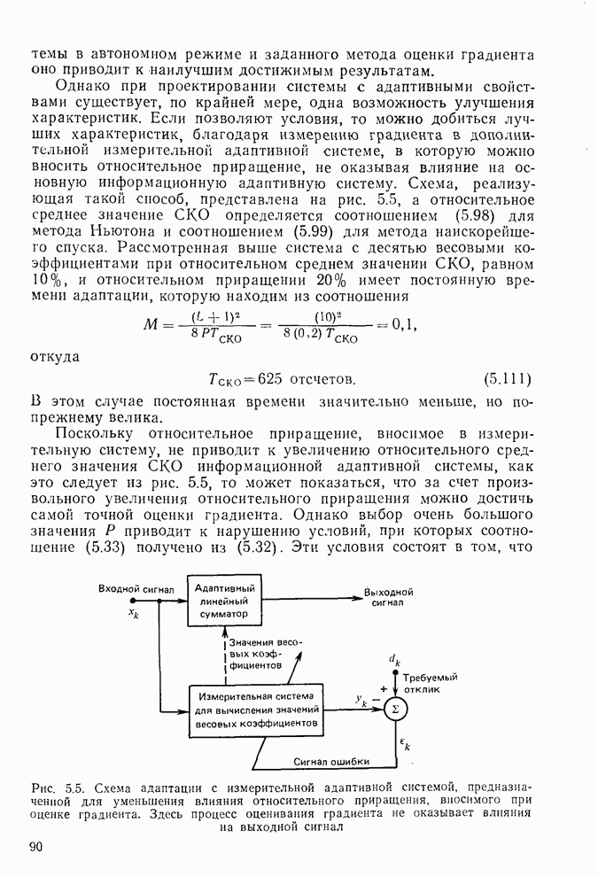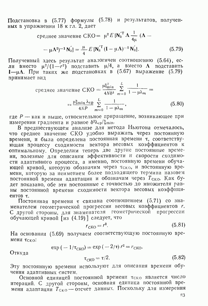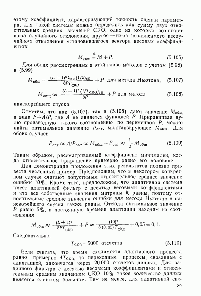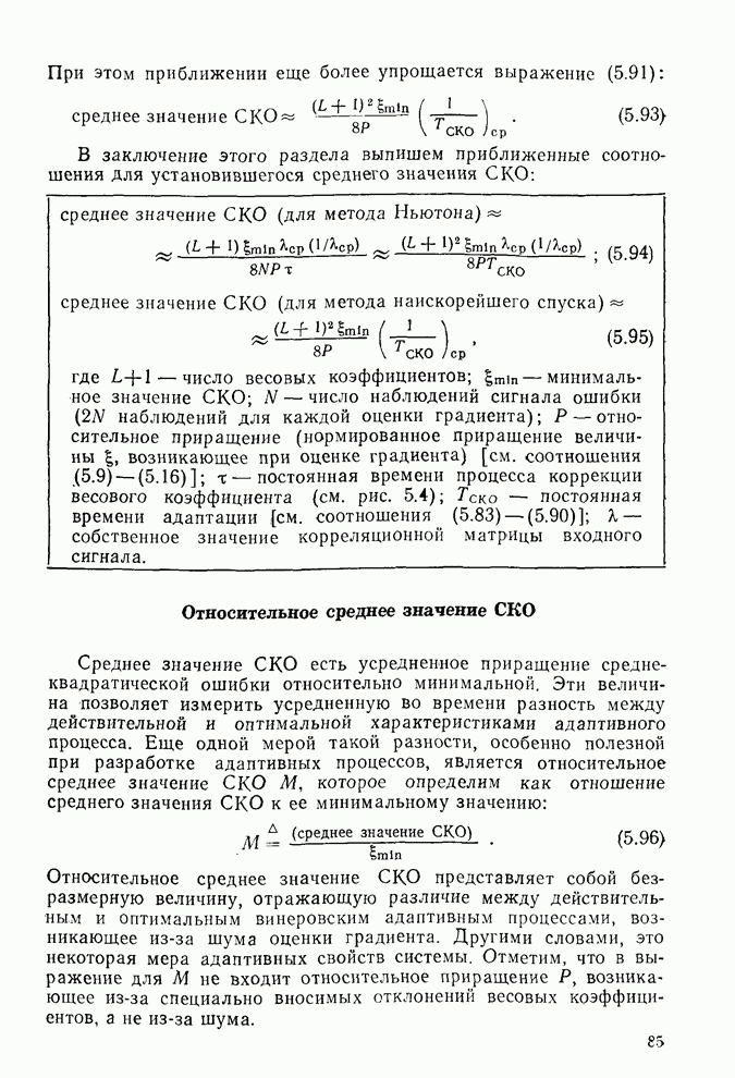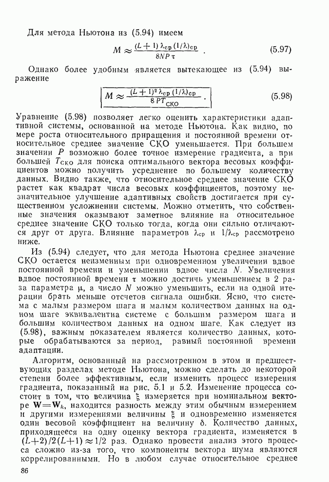 Уравнение (5.98) позволяет легко оценить характеристики адаптивной системы, основанной на методе Ньютона. Как видно, по мере роста относительного приращения и постоянной времени относительное среднее значение СКО уменьшается. При большем значении Р возможно более точное измерение градиента, а при большей Тско для поиска оптимального вектора весовых коэффициентов можно получить усреднение по большему количеству данных. Видно также, что относительное среднее значение СКО растет как квадрат числа весовых коэффициентов, поэтому незначительное улучшение адаптивных свойств достигается при существенном усложнении системы. Можно отметить, что собственные значения оказывают заметное влияние на относительное среднее значение СКО только тогда, когда они сильно отличаются друг от друга. Влияние параметров