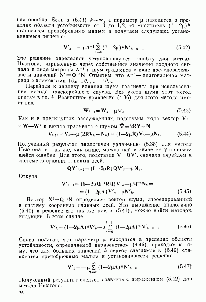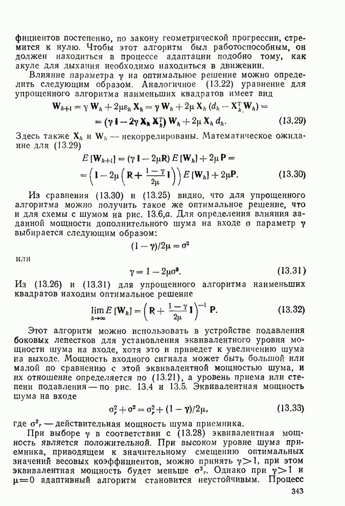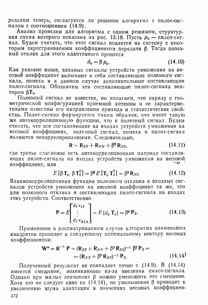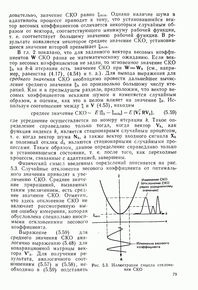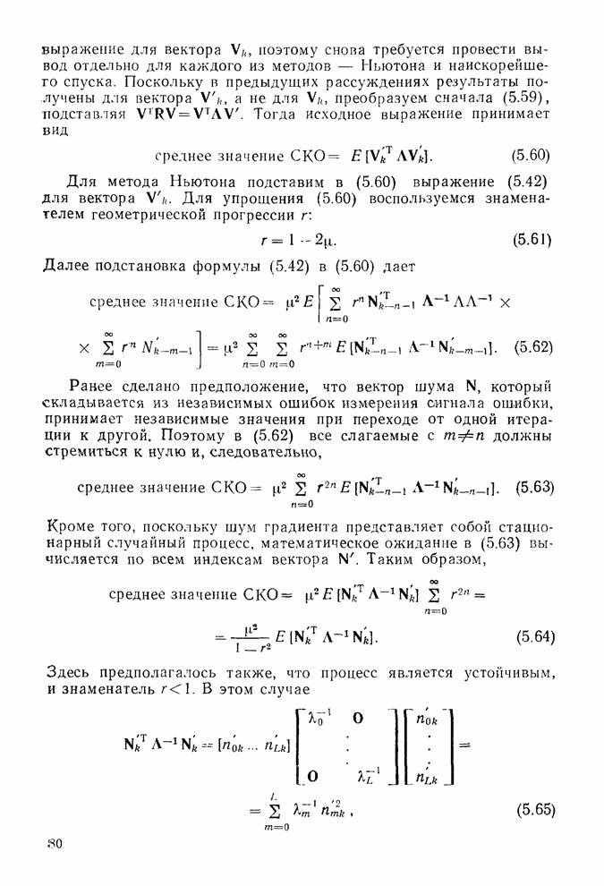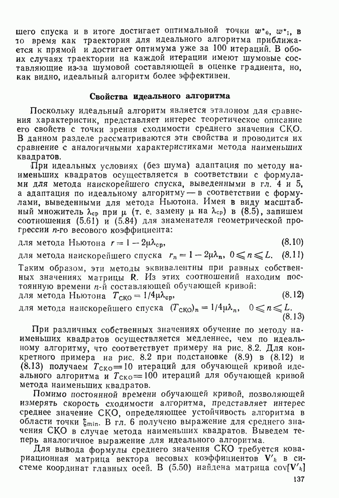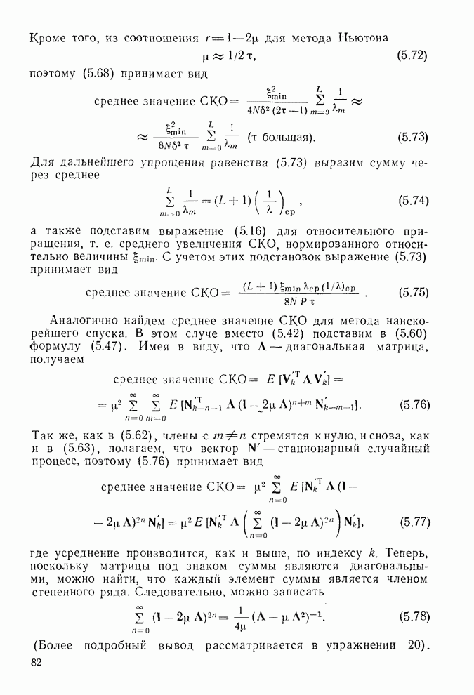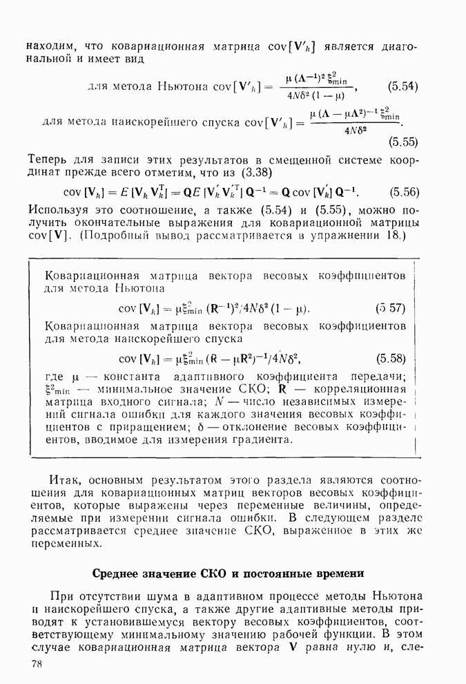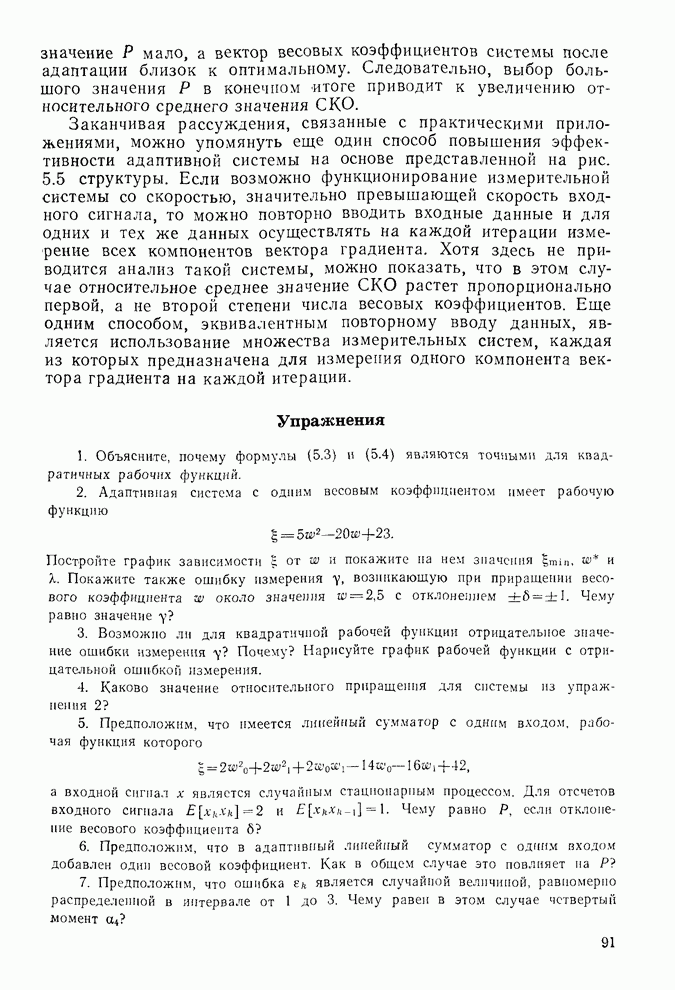 Уравнение (5.98) позволяет легко оценить характеристики адаптивной системы, основанной на методе Ньютона. Как видно, по мере роста относительного приращения и постоянной времени относительное среднее значение СКО уменьшается. При большем значении Р возможно более точное измерение градиента, а при большей Тско для поиска оптимального вектора весовых коэффициентов можно получить усреднение по большему количеству данных. Видно также, что относительное среднее значение СКО растет как квадрат числа весовых коэффициентов, поэтому незначительное улучшение адаптивных свойств достигается при существенном усложнении системы. Можно отметить, что собственные значения оказывают заметное влияние на относительное среднее значение СКО только тогда, когда они сильно отличаются друг от друга. Влияние параметров