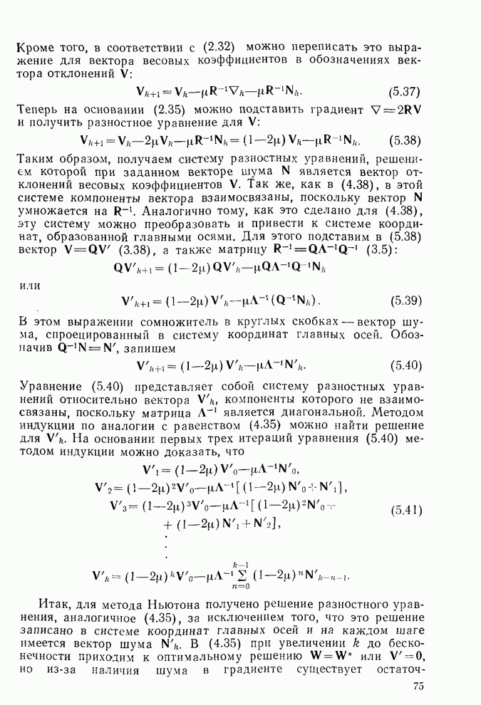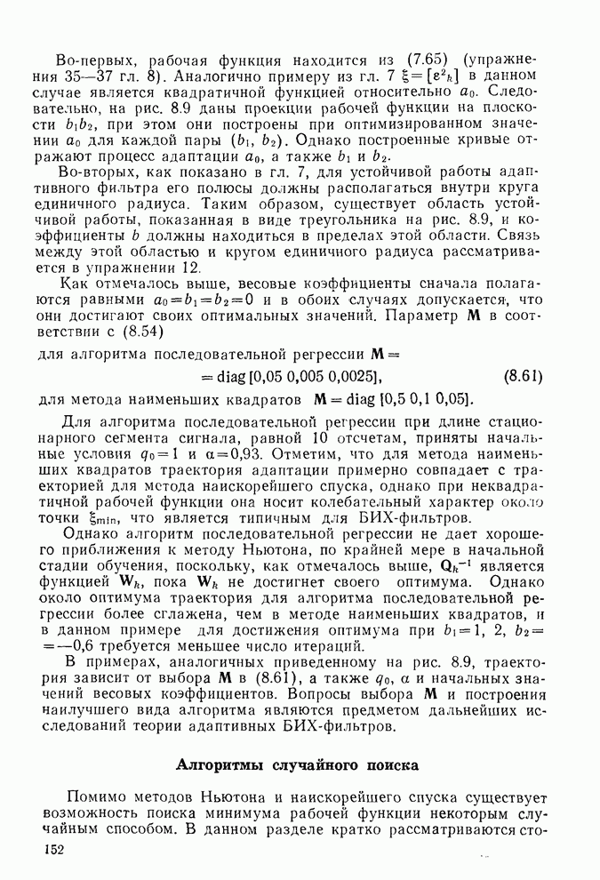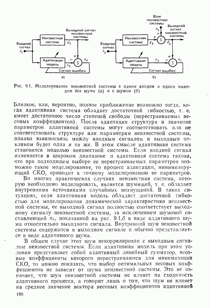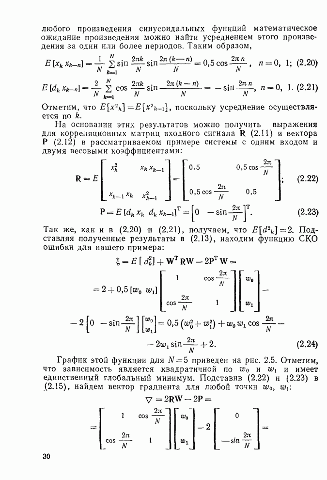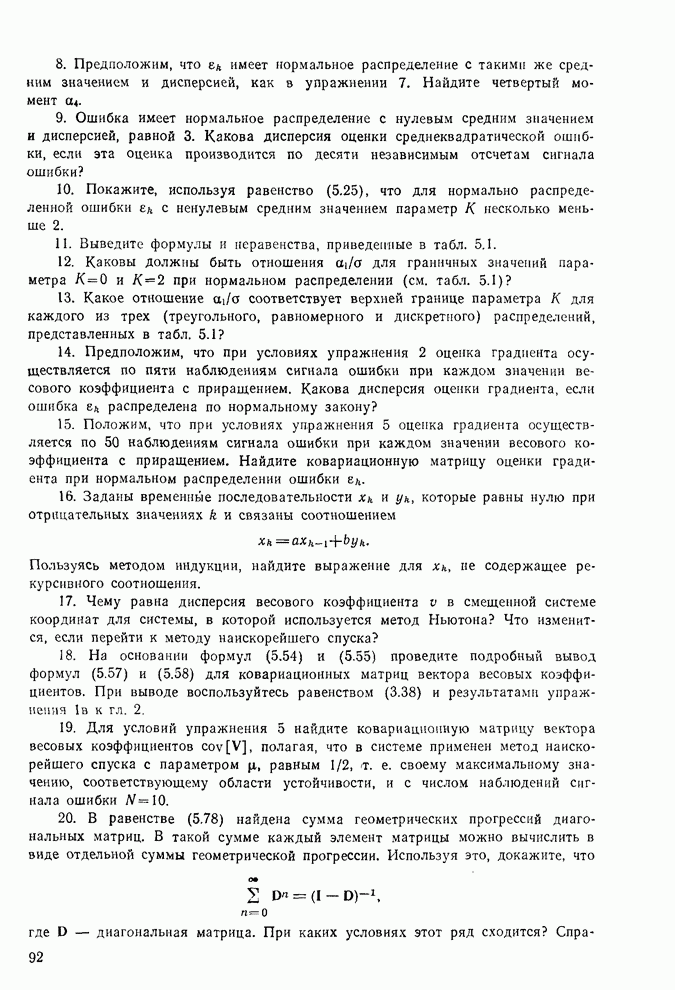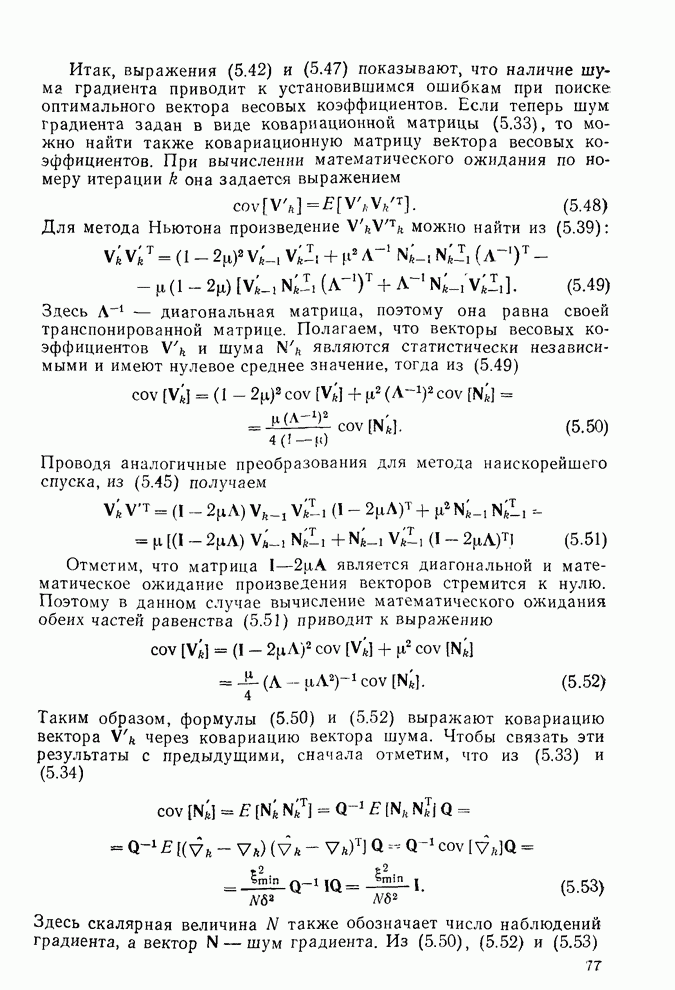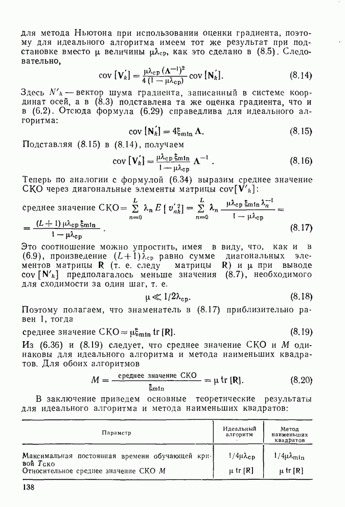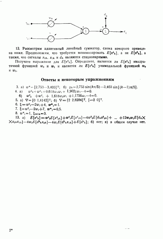 Уравнение (5.98) позволяет легко оценить характеристики адаптивной системы, основанной на методе Ньютона. Как видно, по мере роста относительного приращения и постоянной времени относительное среднее значение СКО уменьшается. При большем значении Р возможно более точное измерение градиента, а при большей Тско для поиска оптимального вектора весовых коэффициентов можно получить усреднение по большему количеству данных. Видно также, что относительное среднее значение СКО растет как квадрат числа весовых коэффициентов, поэтому незначительное улучшение адаптивных свойств достигается при существенном усложнении системы. Можно отметить, что собственные значения оказывают заметное влияние на относительное среднее значение СКО только тогда, когда они сильно отличаются друг от друга. Влияние параметров