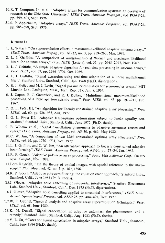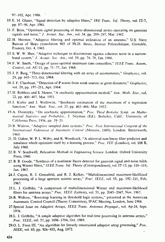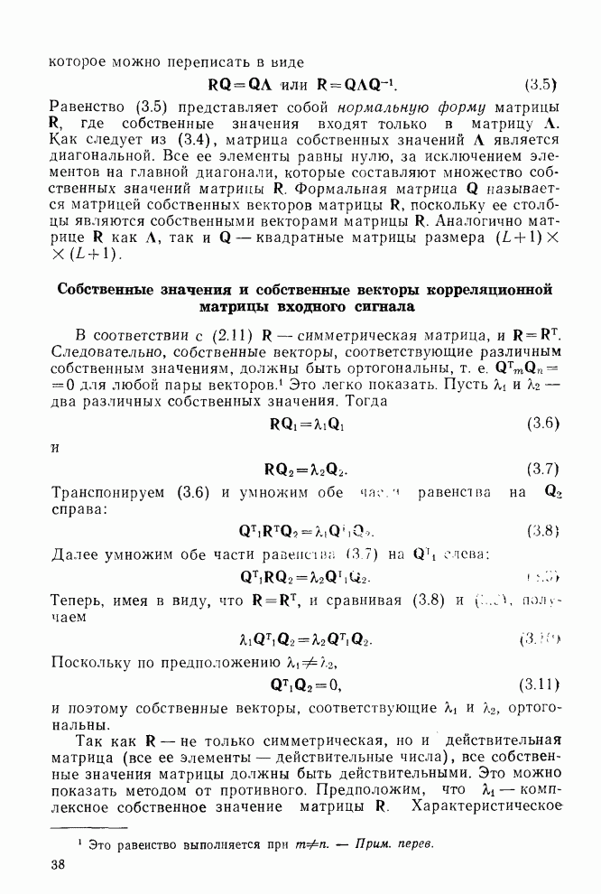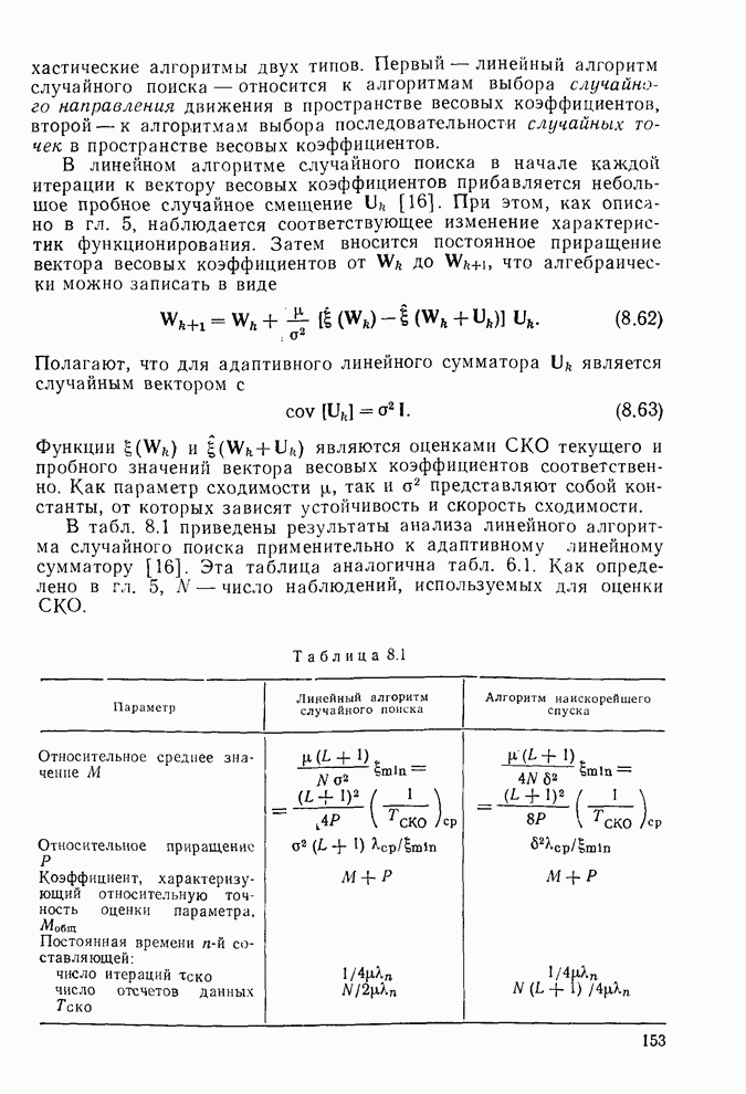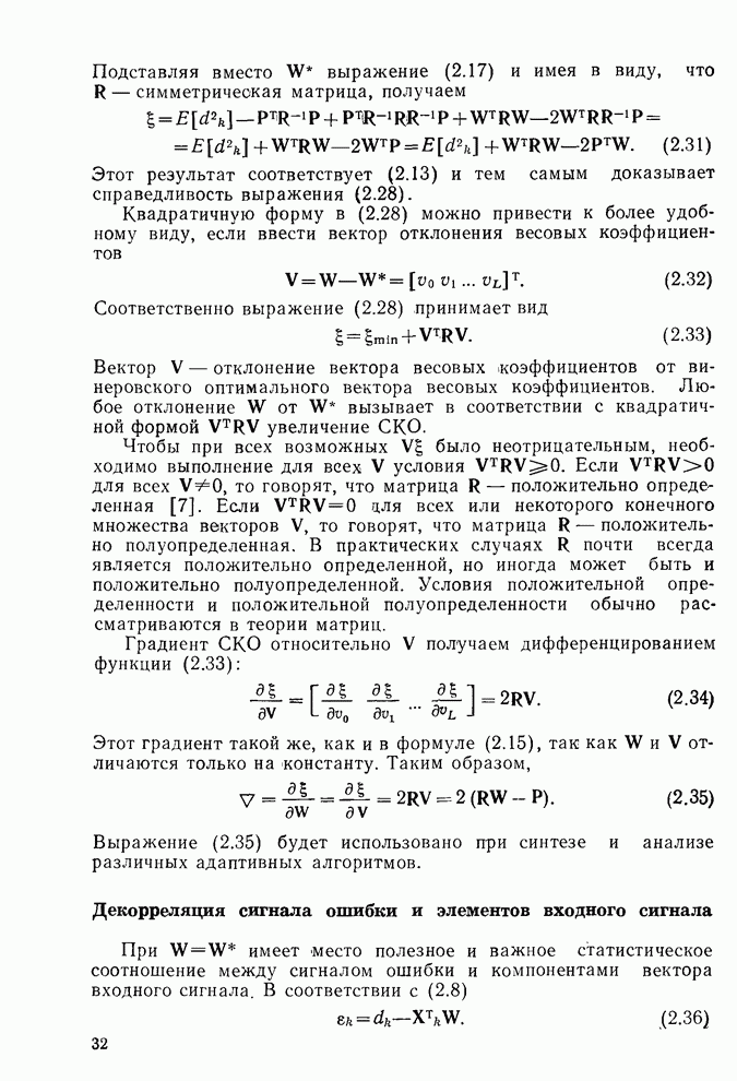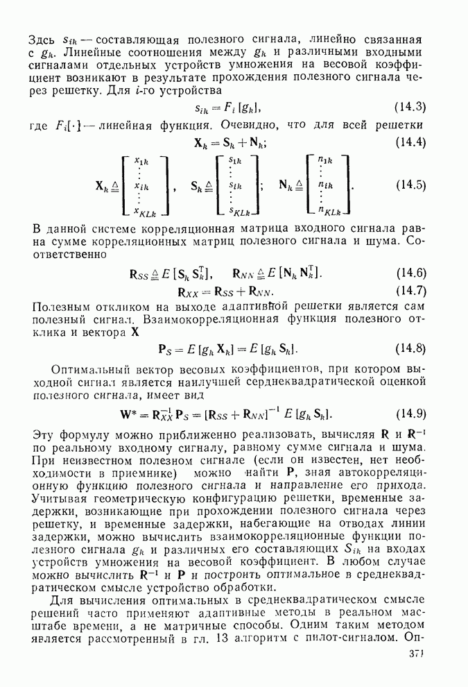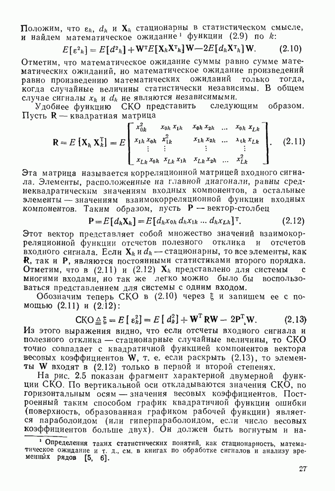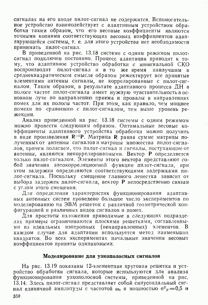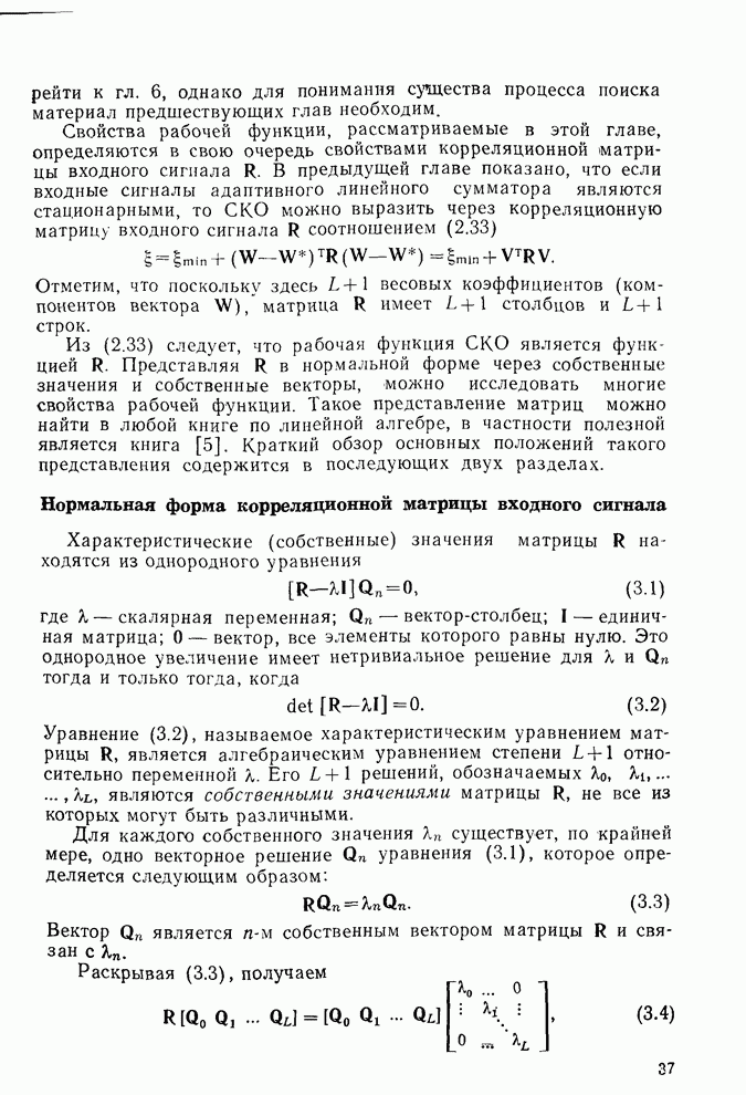 Уравнение (5.98) позволяет легко оценить характеристики адаптивной системы, основанной на методе Ньютона. Как видно, по мере роста относительного приращения и постоянной времени относительное среднее значение СКО уменьшается. При большем значении Р возможно более точное измерение градиента, а при большей Тско для поиска оптимального вектора весовых коэффициентов можно получить усреднение по большему количеству данных. Видно также, что относительное среднее значение СКО растет как квадрат числа весовых коэффициентов, поэтому незначительное улучшение адаптивных свойств достигается при существенном усложнении системы. Можно отметить, что собственные значения оказывают заметное влияние на относительное среднее значение СКО только тогда, когда они сильно отличаются друг от друга. Влияние параметров