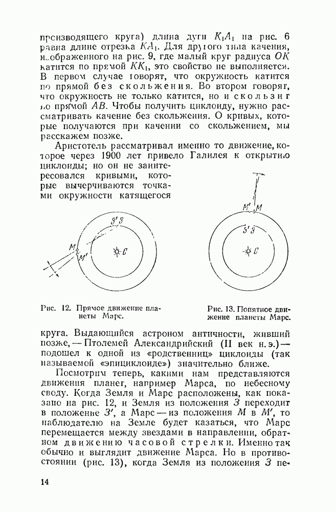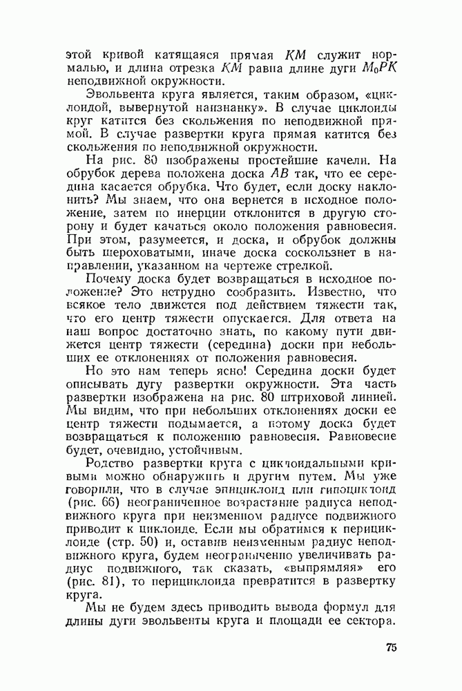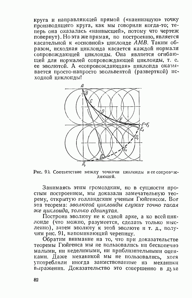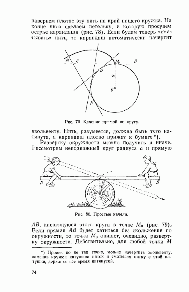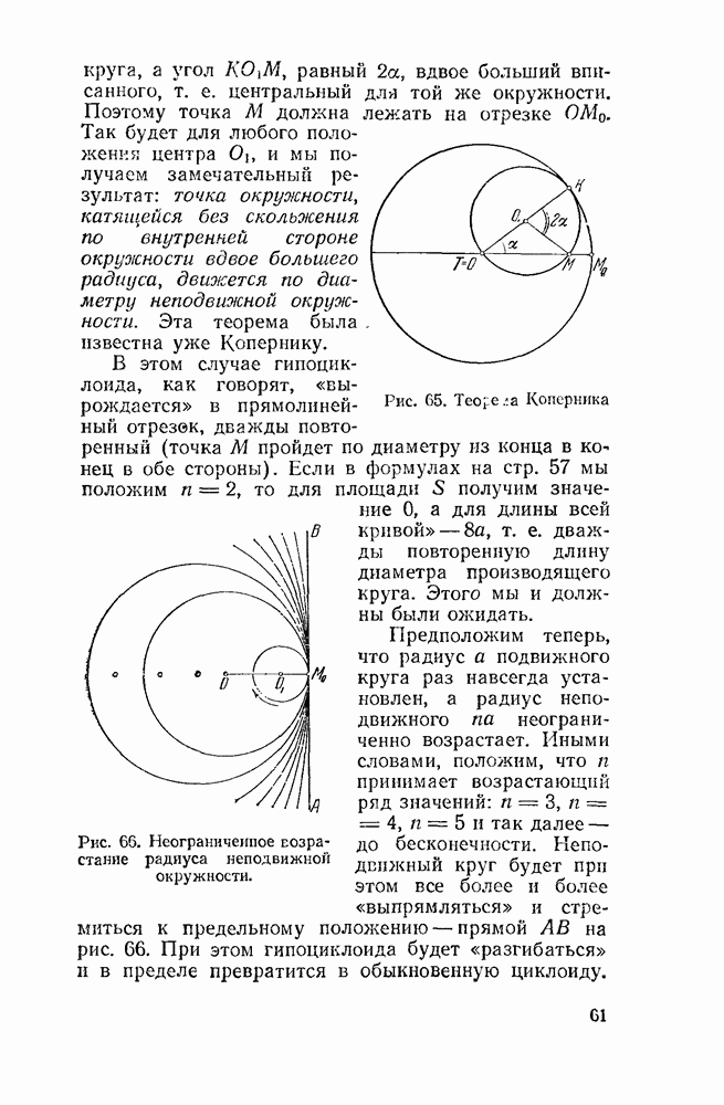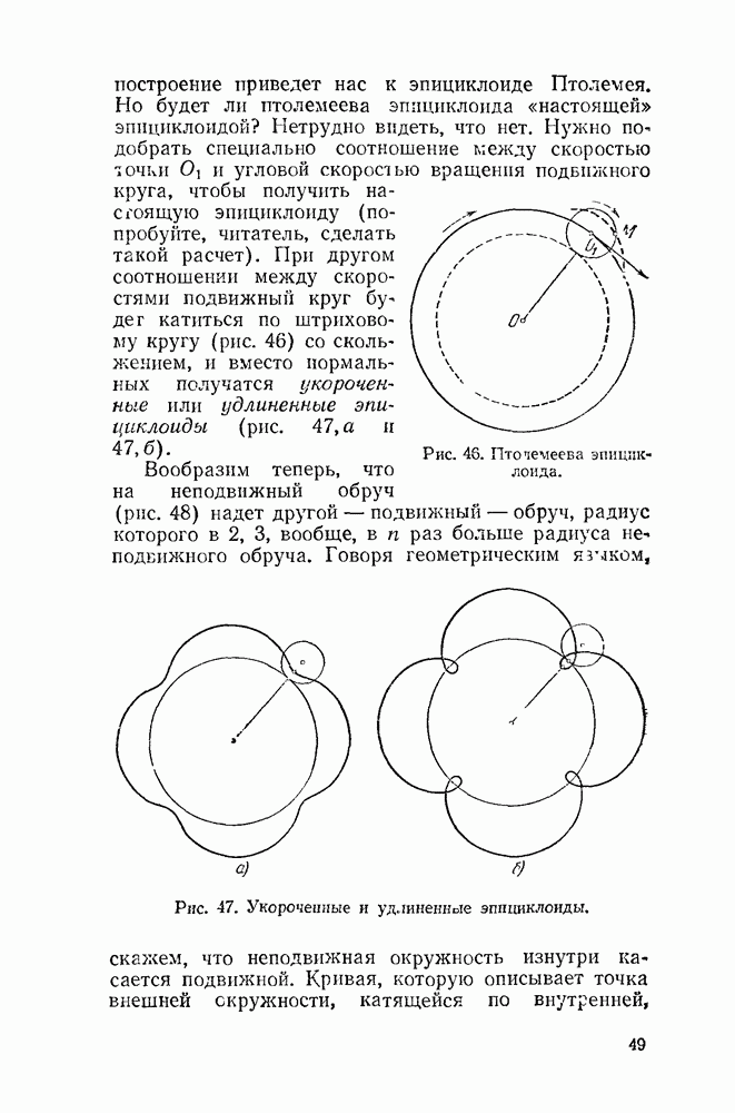 Видоизменим немного условия, при которых порождается эпициклоида. Рассмотрим (рис. 46) круг с центром О и будем предполагать, что по этому кругу равномерно движется центр другого круга, равномерно вращающегося. Какую кривую опишет при этом точка окружности вращающегося круга? Мы встречались с такой задачей в самом начале этой книжки, когда шел разговор о птолемеевой системе мира (стр. 14—16). Действительно, указанное построение приведет нас к эпициклоиде Птолемея. Но будет ли птолемеева эпициклоида «настоящей» эпициклоидой? Нетрудно видеть, что нет. Нужно подобрать специально соотношение между скоростью очки О] и угловой скоростью вращення подвижного круга, чтобы получить настоящую эпициклоиду (попробуйте, читатель, сделать такой расчет). При другом соотношении между скоростями подвижный круг будет катиться по штриховому кругу (рис. 46) со скольжением, и вместо нормальных получатся укороченные или удлиненные эпициклоиды (рис. 47, а и 47, б).