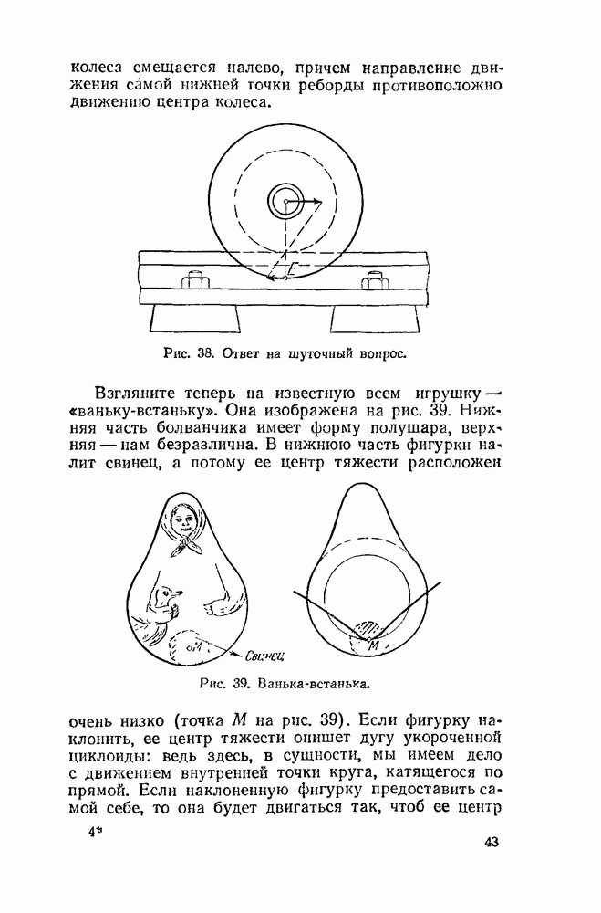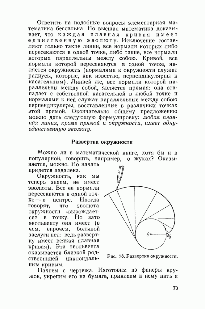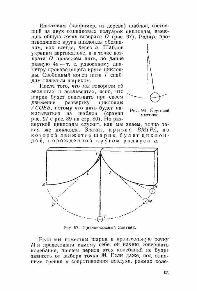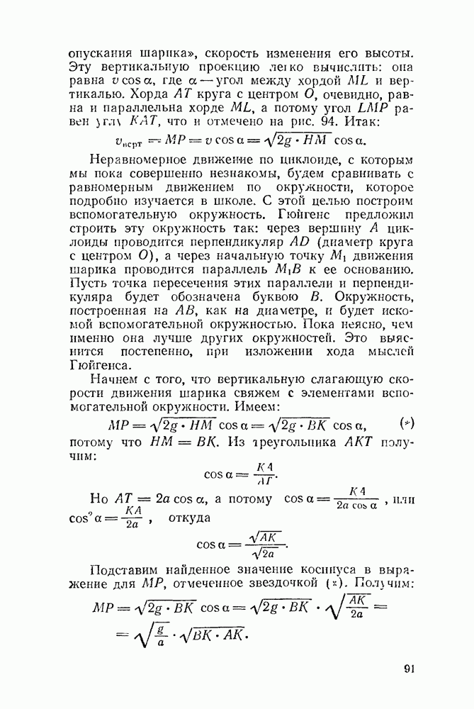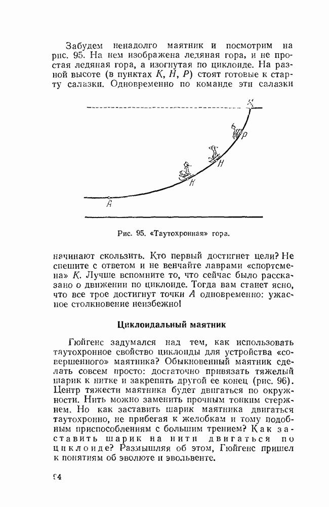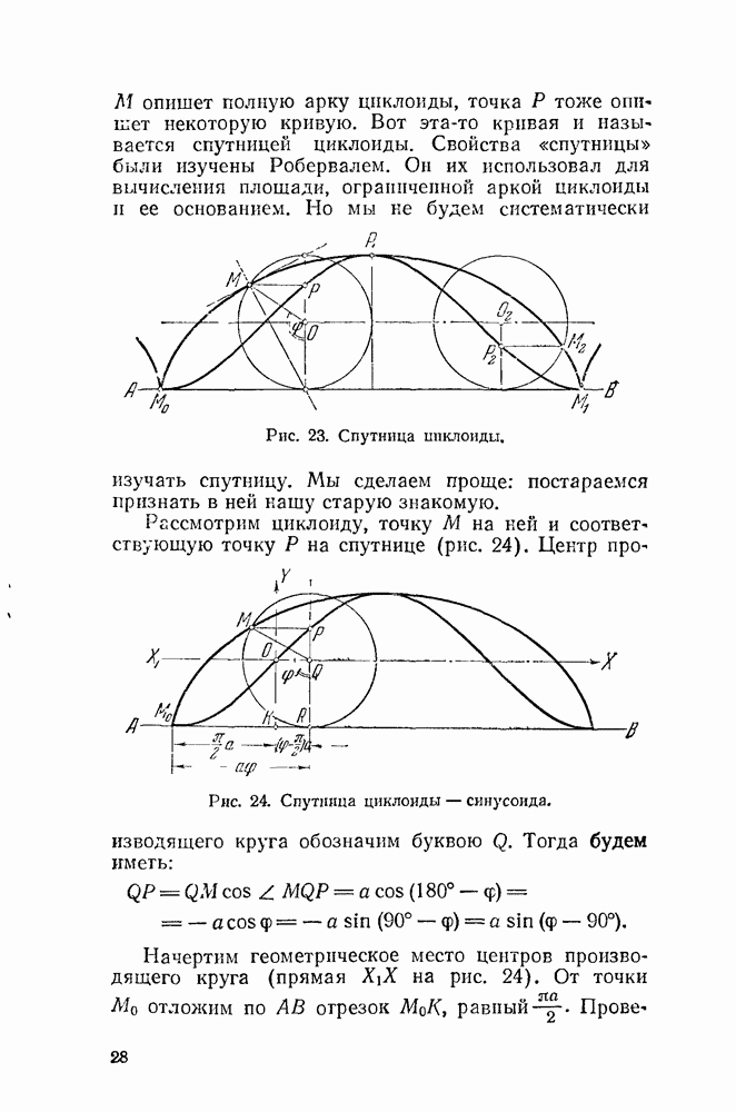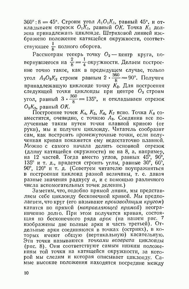 Видоизменим немного условия, при которых порождается эпициклоида. Рассмотрим (рис. 46) круг с центром О и будем предполагать, что по этому кругу равномерно движется центр другого круга, равномерно вращающегося. Какую кривую опишет при этом точка окружности вращающегося круга? Мы встречались с такой задачей в самом начале этой книжки, когда шел разговор о птолемеевой системе мира (стр. 14—16). Действительно, указанное построение приведет нас к эпициклоиде Птолемея. Но будет ли птолемеева эпициклоида «настоящей» эпициклоидой? Нетрудно видеть, что нет. Нужно подобрать специально соотношение между скоростью очки О] и угловой скоростью вращення подвижного круга, чтобы получить настоящую эпициклоиду (попробуйте, читатель, сделать такой расчет). При другом соотношении между скоростями подвижный круг будет катиться по штриховому кругу (рис. 46) со скольжением, и вместо нормальных получатся укороченные или удлиненные эпициклоиды (рис. 47, а и 47, б).