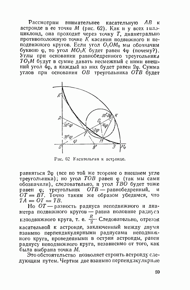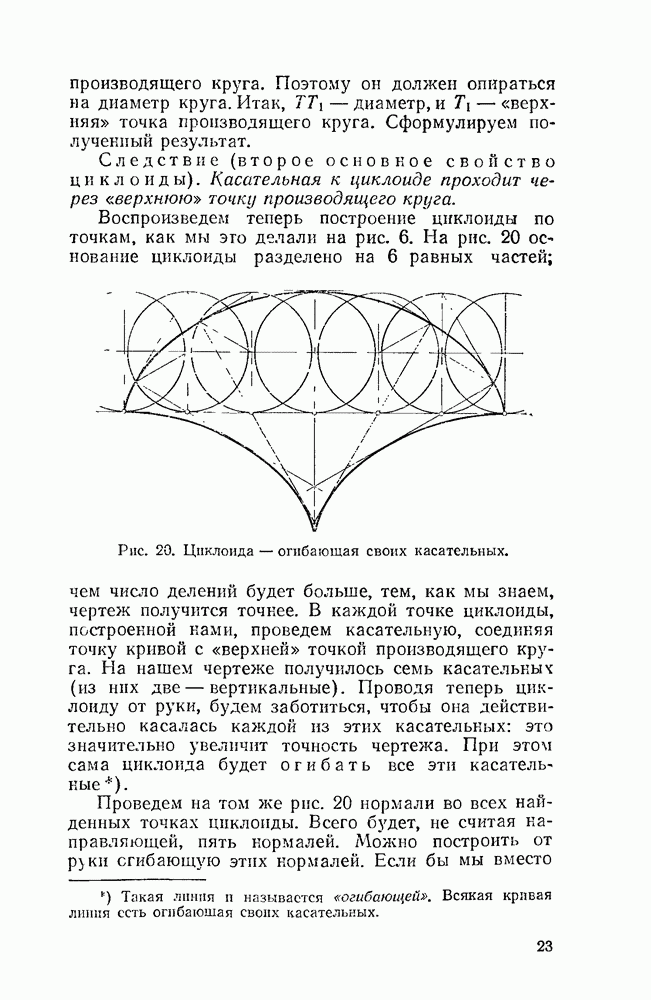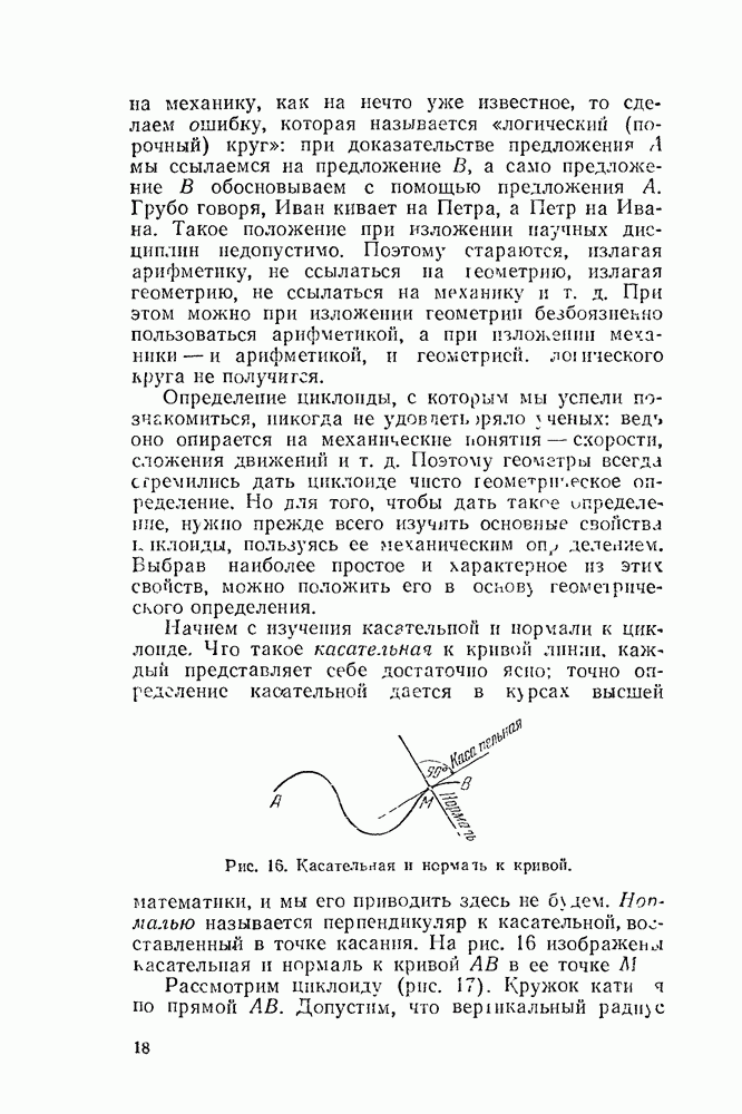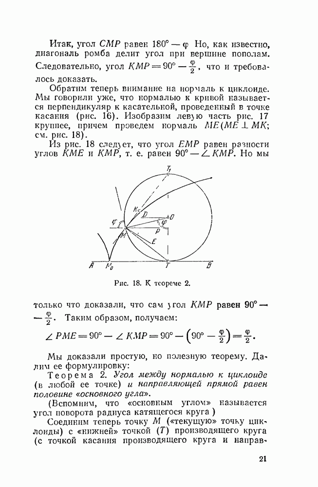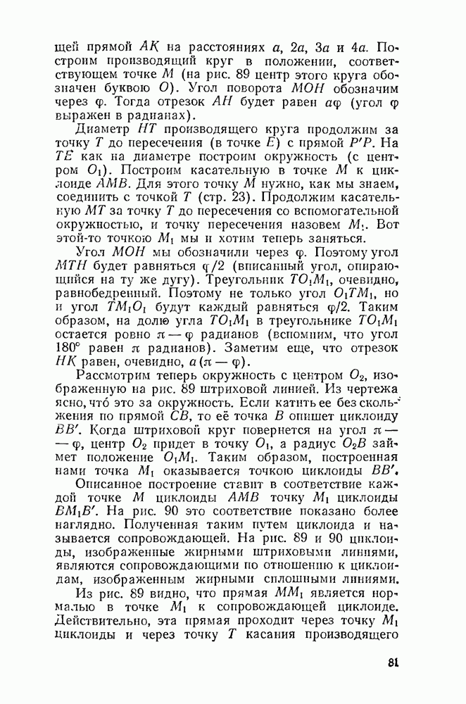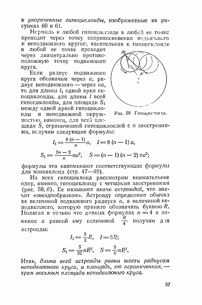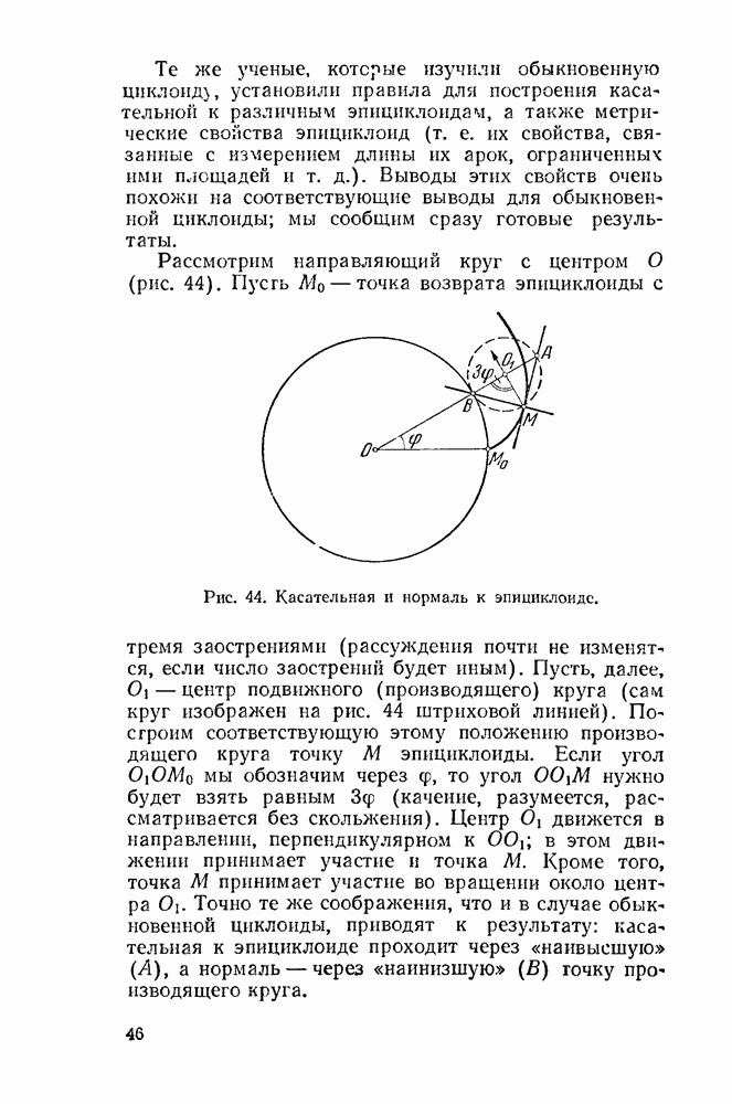 Рис. 44. Касательная и нормаль к эпициклоиде. Пусть Радиус производящего круга будем, как и дня обыкновенной циклоиды, обозначать буквою а. У обыкновенной циклоиды число а вполне ее определяло (как, например, окружность вполне определялась своим радиусом). В случае эпициклоиды нужно указать еще олно число: именно, нужно указать, во сколько раз радиус неподвижного круга больше радиуса подвижного. Это число мы будем обозначать буквою п. У эпициклоиды с двумя заострениями При этих обозначениях для длины одной арки эпициклоиды с