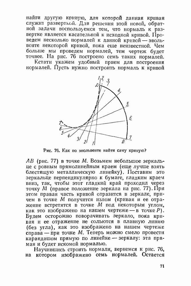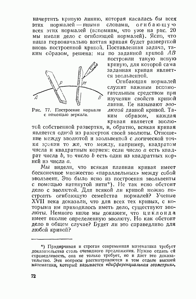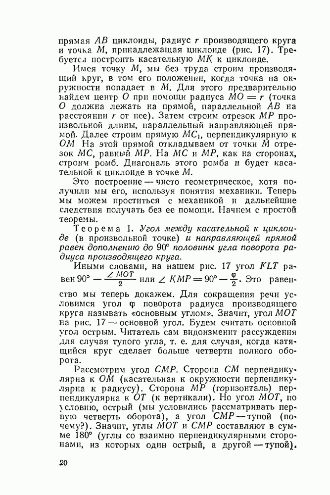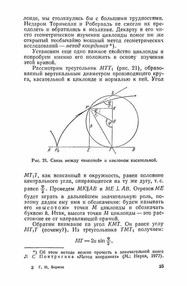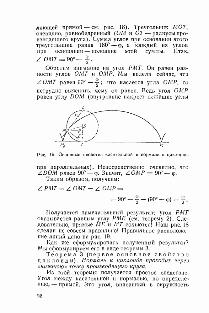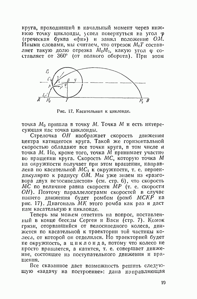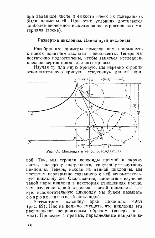 Рис. 44. Касательная и нормаль к эпициклоиде. Пусть Радиус производящего круга будем, как и дня обыкновенной циклоиды, обозначать буквою а. У обыкновенной циклоиды число а вполне ее определяло (как, например, окружность вполне определялась своим радиусом). В случае эпициклоиды нужно указать еще олно число: именно, нужно указать, во сколько раз радиус неподвижного круга больше радиуса подвижного. Это число мы будем обозначать буквою п. У эпициклоиды с двумя заострениями При этих обозначениях для длины одной арки эпициклоиды с