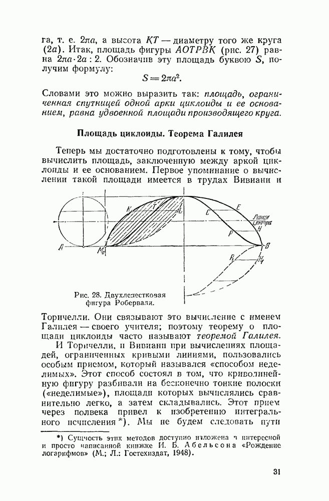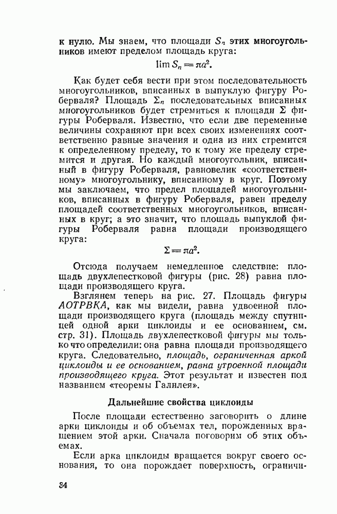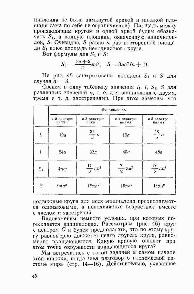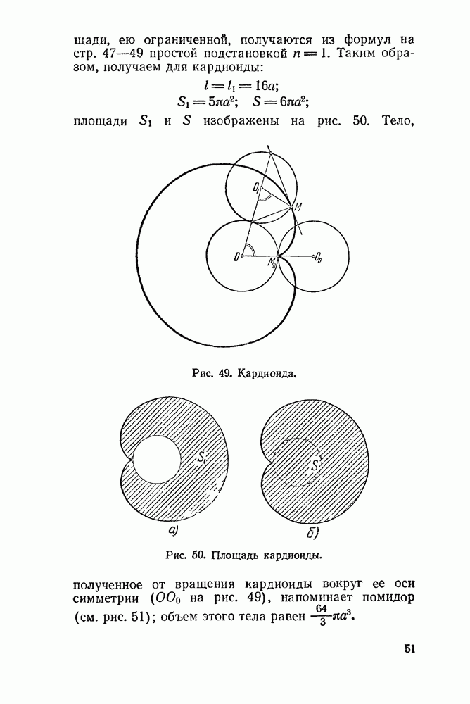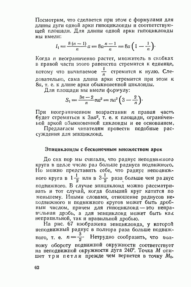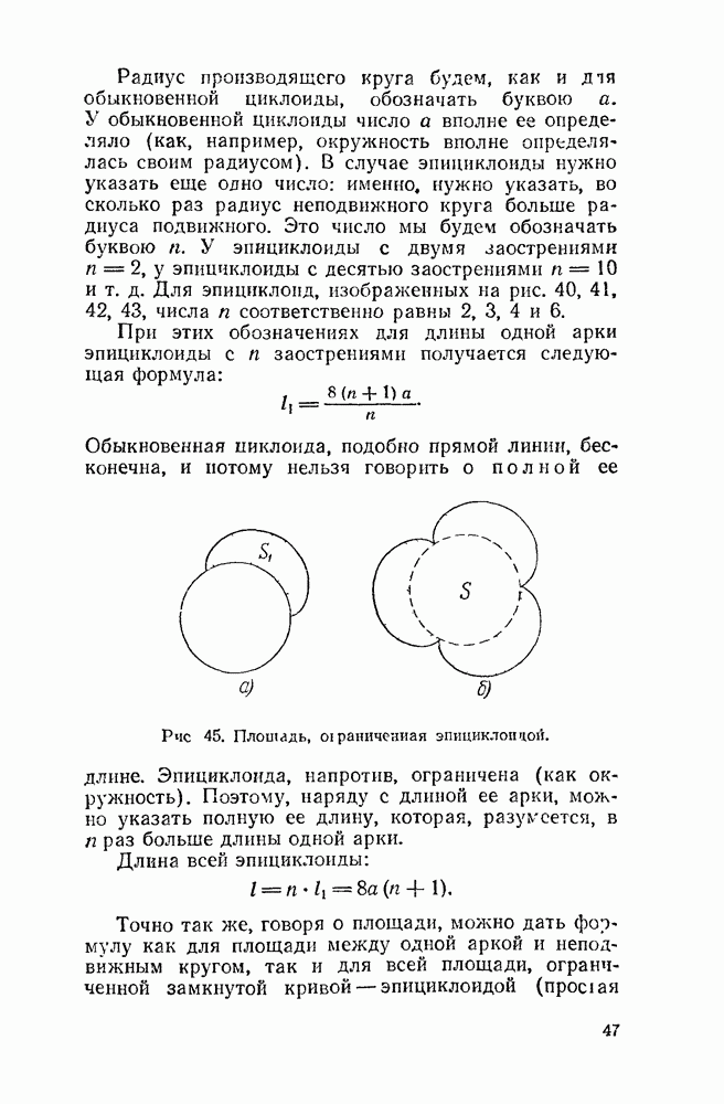 Рис 45. Площадь, ограниченная эпициклоидой. Эпициклоида, напротив, ограничена (как окружность). Поэтому, наряду с длиной ее арки, можно указать полную ее длину, которая, разумеется, в Длина всей эпициклоиды: