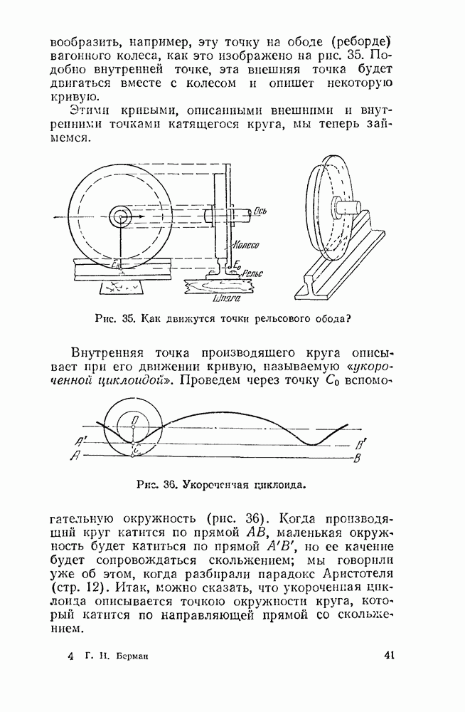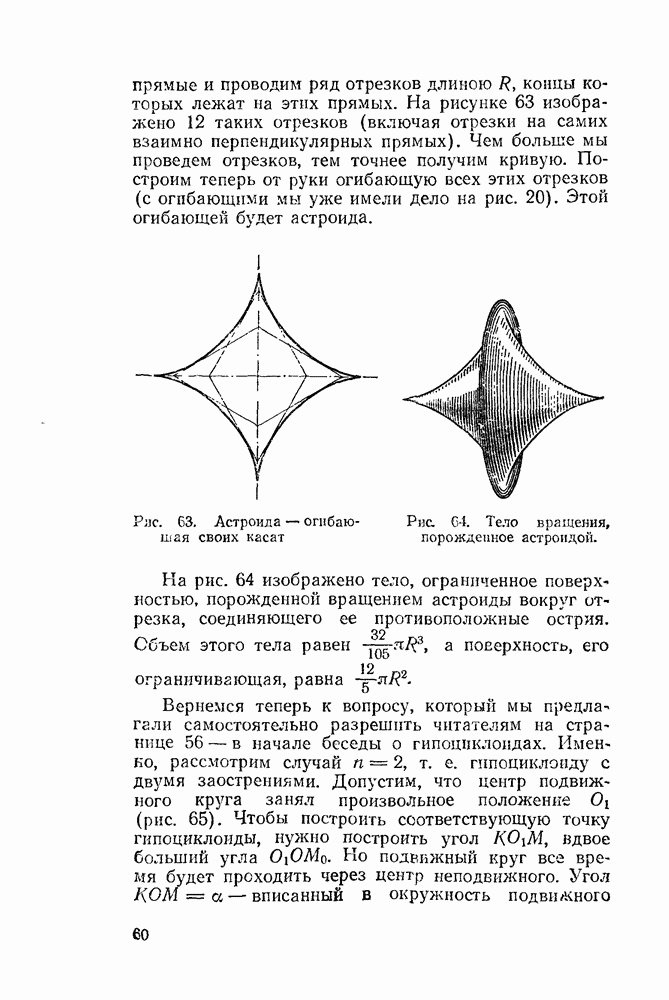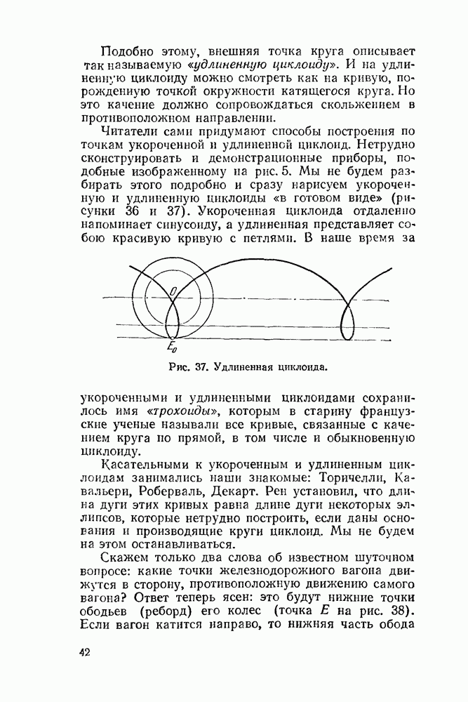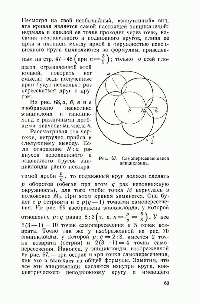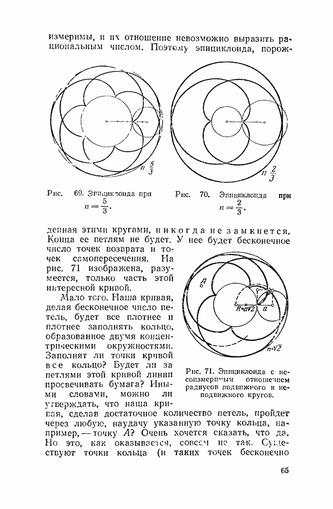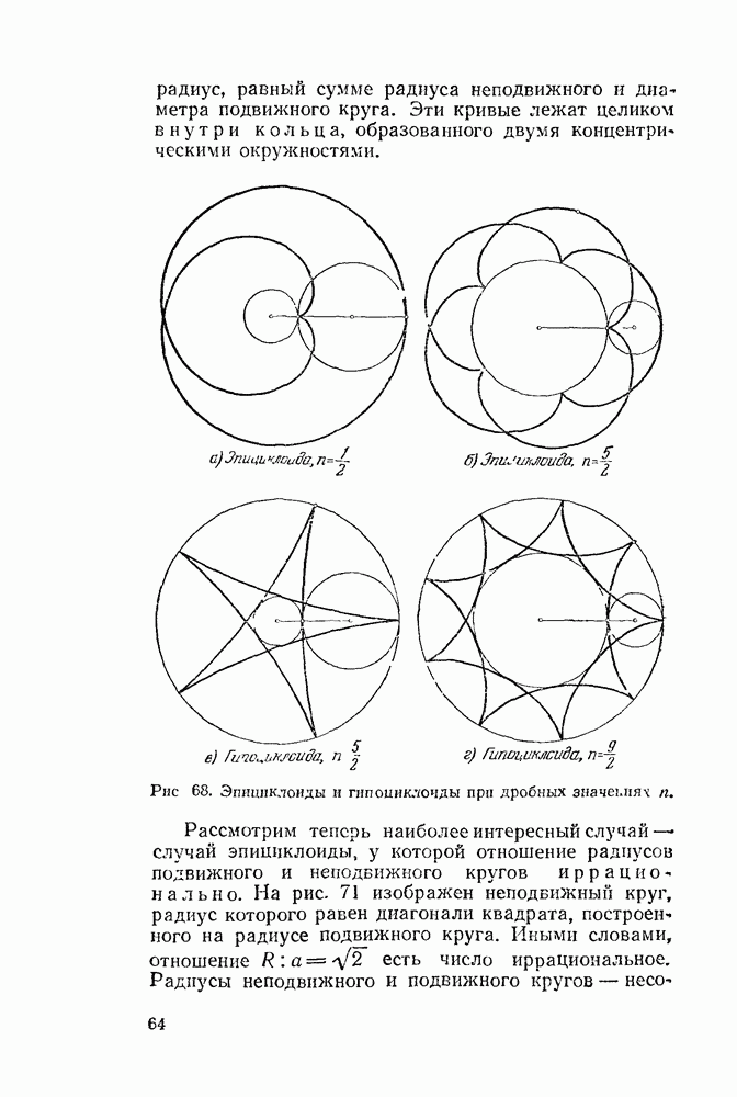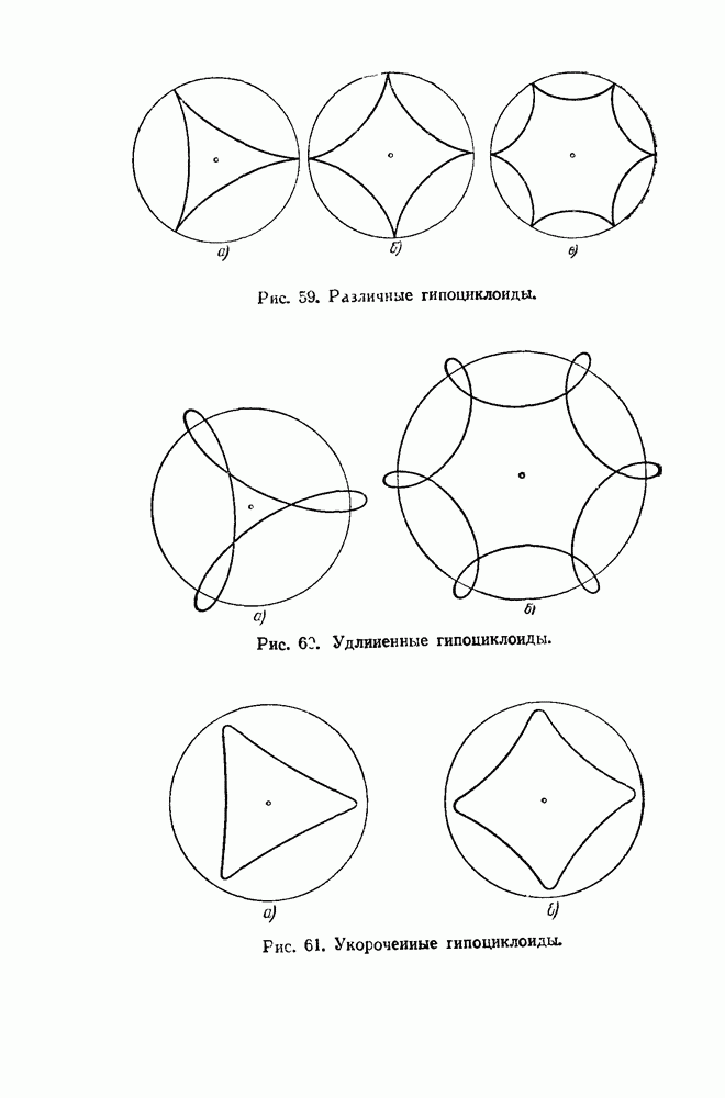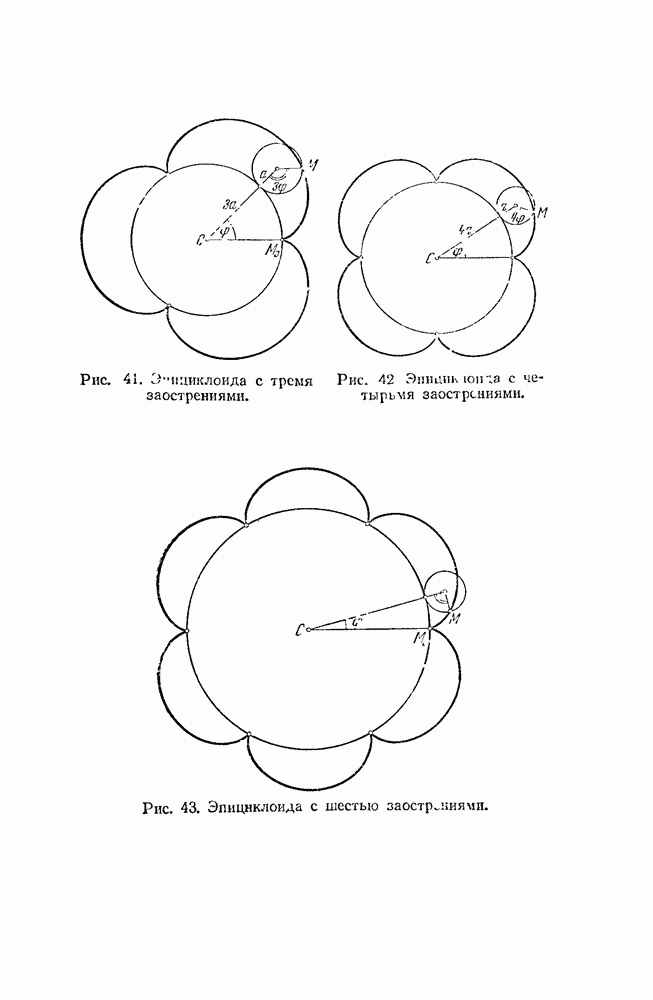 Рис. 47. Укороченные и удлиненные эпициклоиды. Говоря геометрическим языком, скажем, что неподвижная окружность изнутри касается подвижной. Кривая, которую описывает точка внешней окружности, катящейся по внутренней, называется перициклоидой. Но говорить о свойствах перициклоид нет смысла: при более внимательном рассмотрении каждая перициклоида оказывается из которой эпициклоидой.