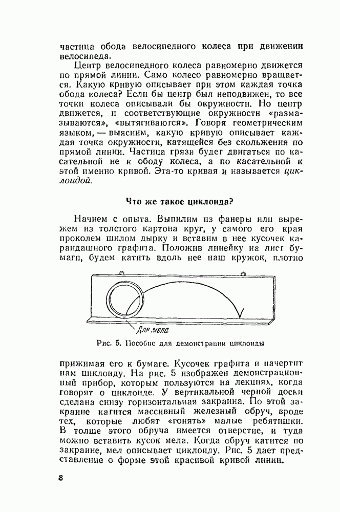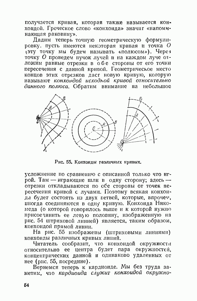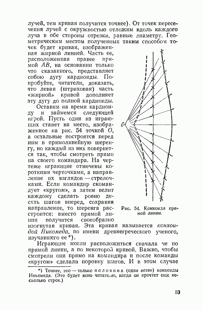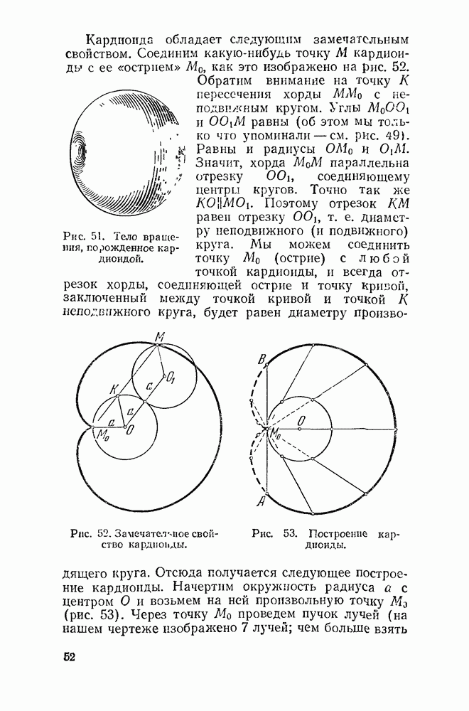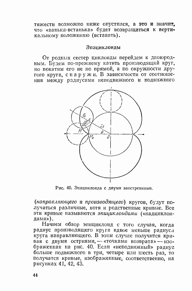 Рис. 40. Эпициклоида с двумя заострениями. Все эти кривые называются эпициклоидами («надциклоидами»). Начнем обзор эпициклоид с того случая, когда радиус производящего круга вдвое меньше радиуса круга направляющего. В этом случае получится кривая с двумя остриями, — «точками возврата» — изображенная на рис. 40. Если «неподвижный» радиус больше подвижного в три, четыре или шесть раз, то получатся кривые, изображенные, соответственно, на рисунках 41, 42, 43.