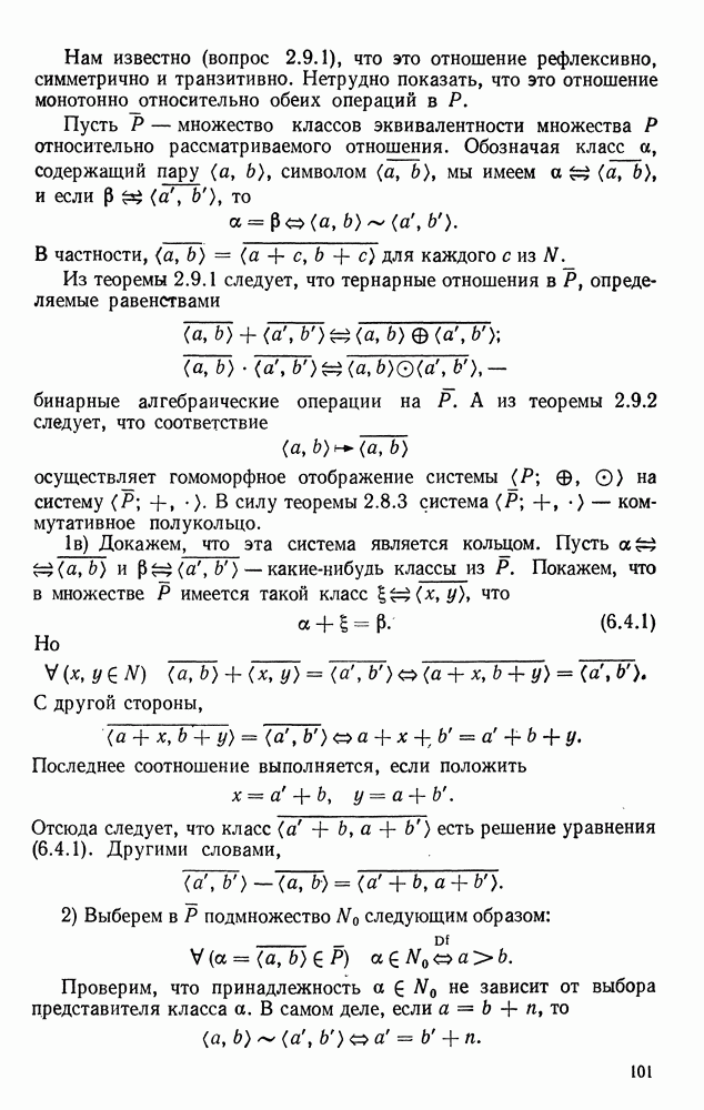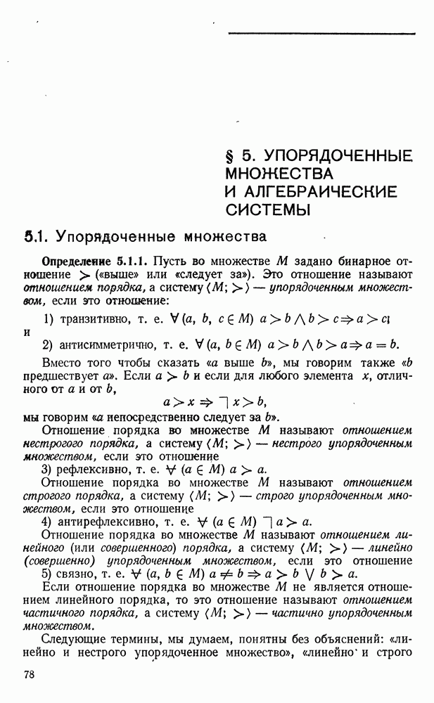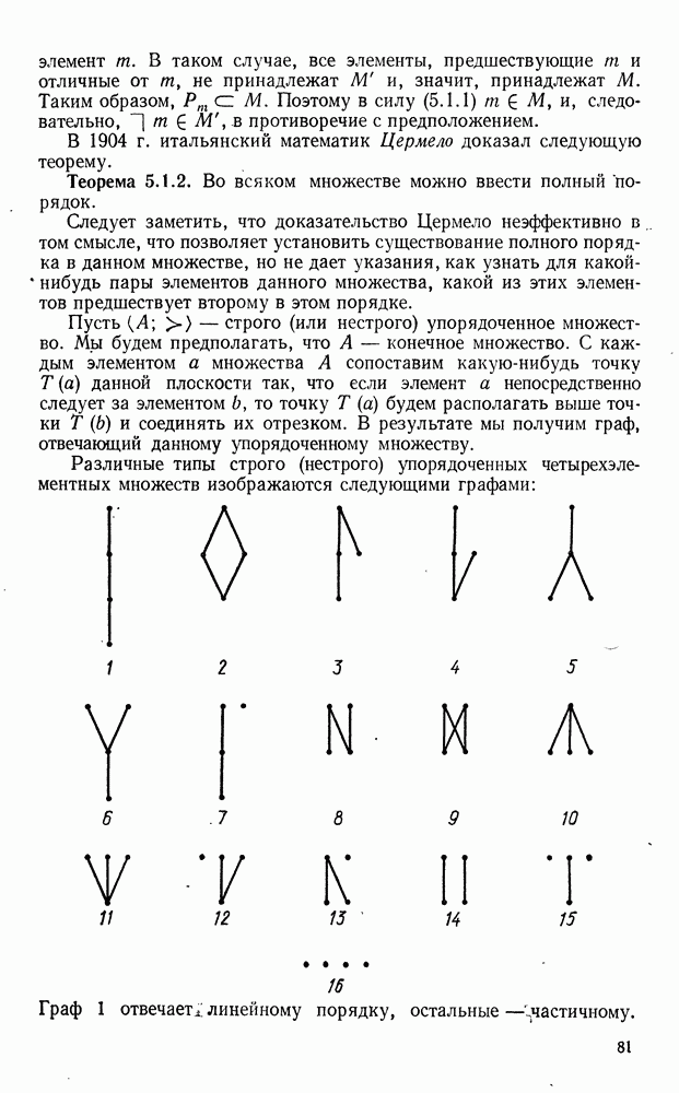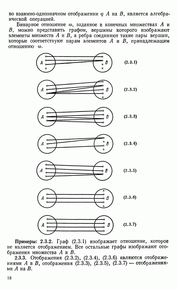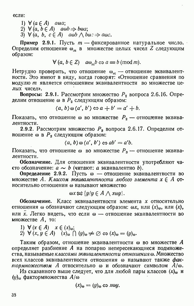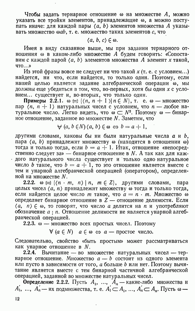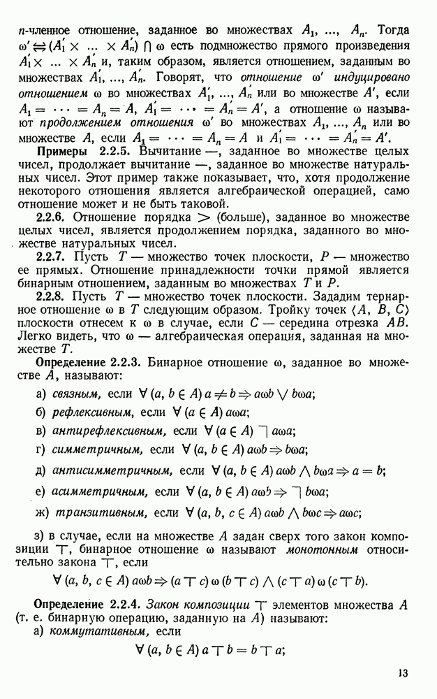 Следовательно, свойство «быть простым» может рассматриваться как унарное отношение в 2.2.4. Вычитание — во множестве натуральных чисел — тернарное отношение. Множество а — b состоит из одного элемента или пусто в зависимости от того, а больше b или нет. Поэтому вычитание является вместе с тем бинарной частичной алгебраической операцией, заданной во множестве натуральных чисел. Определение 2.2.2. Пусть Пусть Примеры 2.2.5. Вычитание 2.2.6. Отношение порядка 2.2.7. Пусть Т — множество точек плоскости, Р — множество ее прямых. Отношение принадлежности точки прямой является бинарным отношением, заданным во множествах Т и Р. 2.2.8. Пусть Т — множество точек плоскости. Зададим тернарное отношение Определение 2.2.3. Бинарное отношение а) связным, если б) рефлексивным, если в) антирефлексивным, если г) симметричным, если д) антисимметричным, если е) асимметричным, если ж) транзитивным, если з) в случае, если на множестве