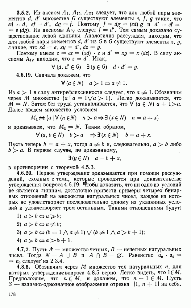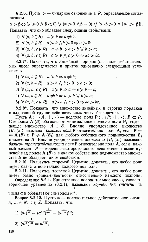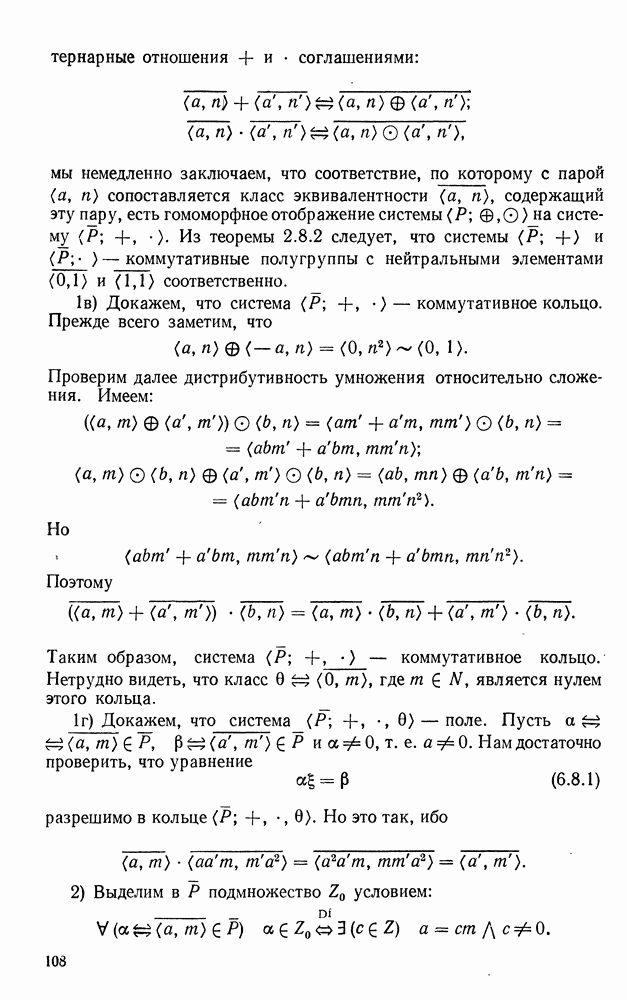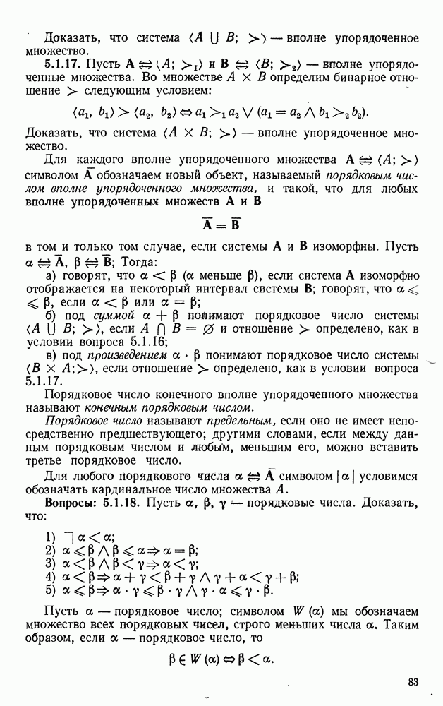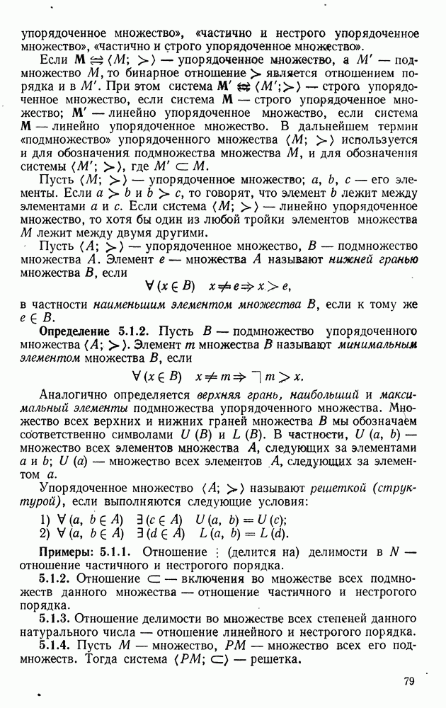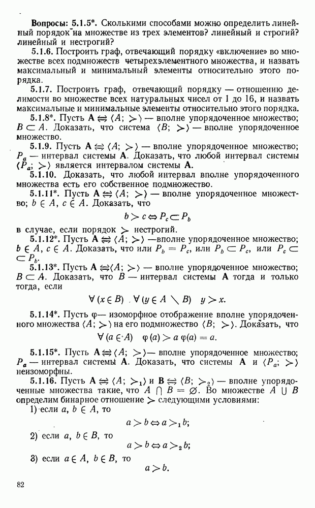Следовательно, свойство «быть простым» может рассматриваться как унарное отношение в 2.2.4. Вычитание — во множестве натуральных чисел — тернарное отношение. Множество а — b состоит из одного элемента или пусто в зависимости от того, а больше b или нет. Поэтому вычитание является вместе с тем бинарной частичной алгебраической операцией, заданной во множестве натуральных чисел. Определение 2.2.2. Пусть Пусть Примеры 2.2.5. Вычитание 2.2.6. Отношение порядка 2.2.7. Пусть Т — множество точек плоскости, Р — множество ее прямых. Отношение принадлежности точки прямой является бинарным отношением, заданным во множествах Т и Р. 2.2.8. Пусть Т — множество точек плоскости. Зададим тернарное отношение Определение 2.2.3. Бинарное отношение а) связным, если б) рефлексивным, если в) антирефлексивным, если г) симметричным, если д) антисимметричным, если е) асимметричным, если ж) транзитивным, если з) в случае, если на множестве