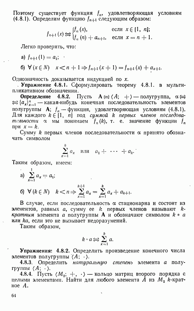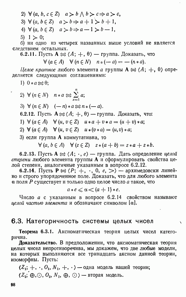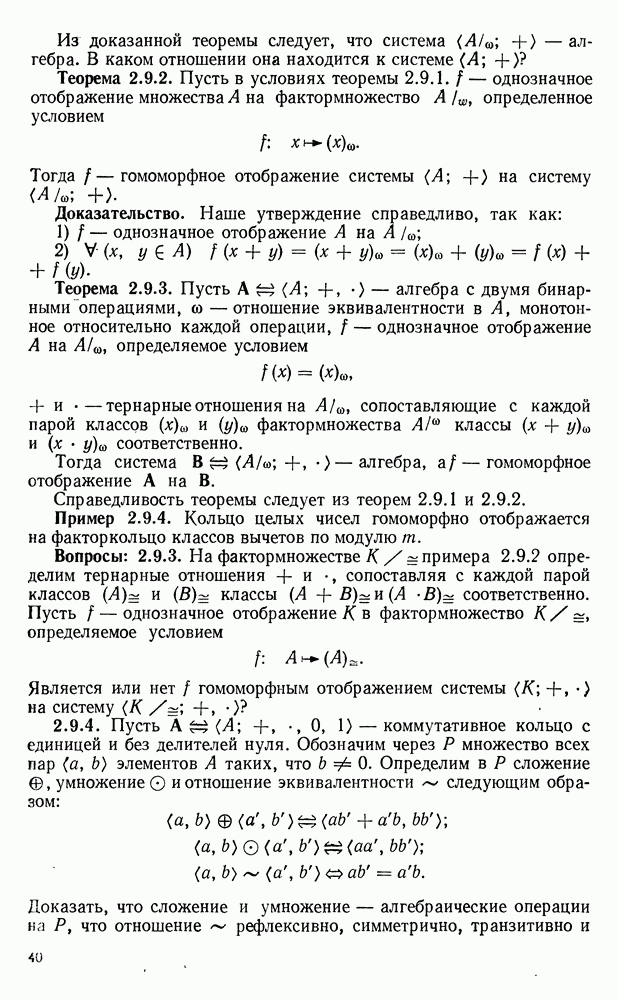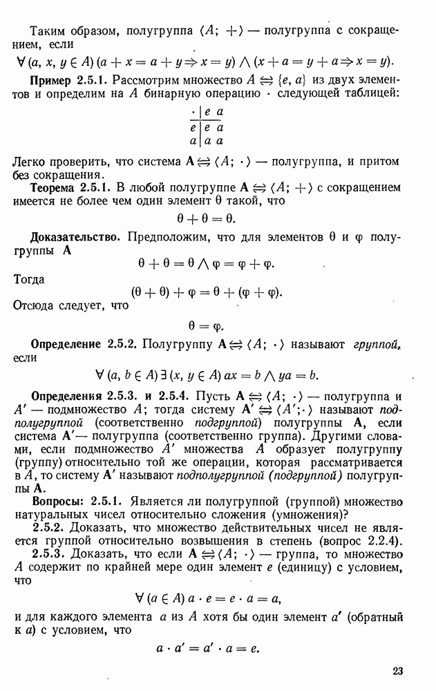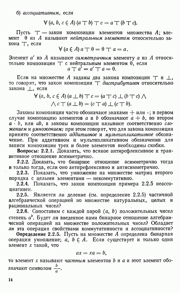 Законы композиции часто обозначают знаками Вопросы: 2.2.1. Доказать, что всякое антирефлексивное и транзитивное отношение асимметрично. 2.2.2. Доказать, что бинарное отношение асимметрично тогда и только тогда, если оно антирефлексивно и антисимметрично. 2.2.3. Показать, что умножение на множестве матриц второго порядка с целыми элементами — некоммутативно. 2.2.4. Показать, что закон композиции примера 2.2.5 неассоциативен. 2.2.5. Является ли деление (см. определение 2.2.5) частичной алгебраической операцией во множестве натуральных, целых и рациональных чисел? 2.2.6. Сопоставим с каждой парой (а, b) положительных чисел степень Определение 2.2.5. Пусть на множестве А определена бинарная операция умножение;