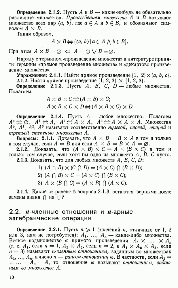 2.2. n-членные отношения и n-арные алгебраические операцииОпределение 2.2.1. Пусть Отношения ранга 1, 2, 3 называют соответственно унарным, Вместо термина «бинарное отношение» часто употребляют термин «отношение». Пусть (