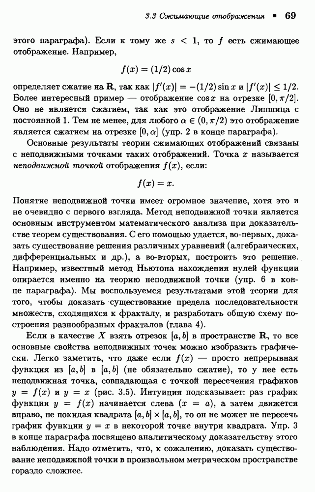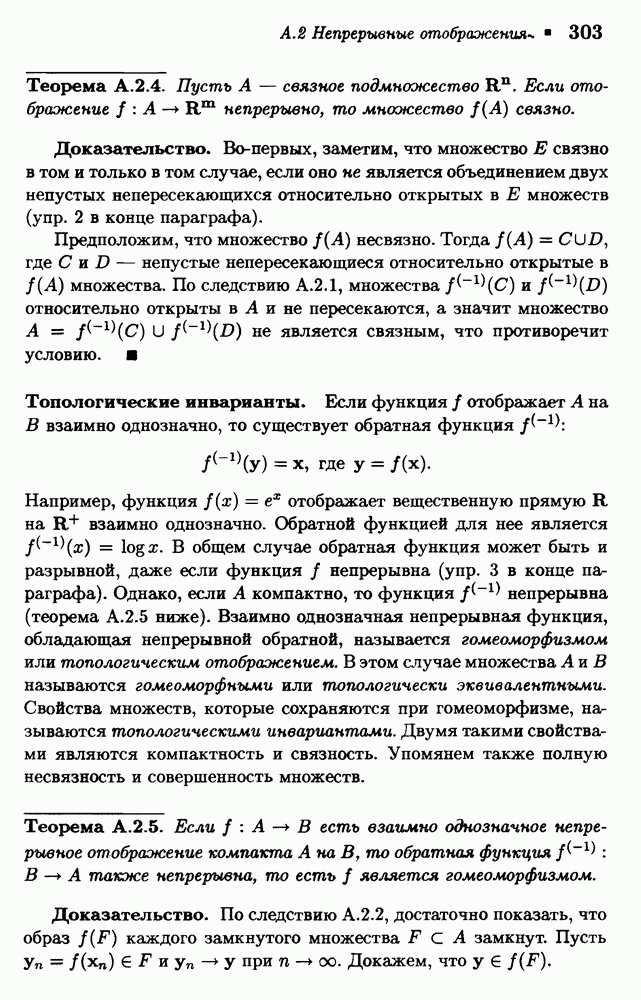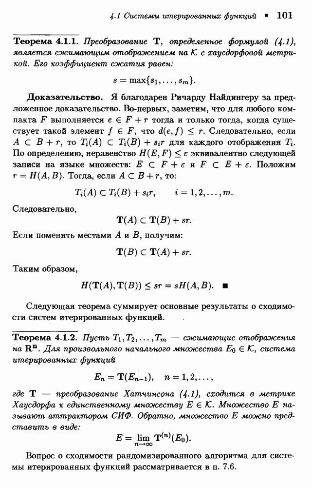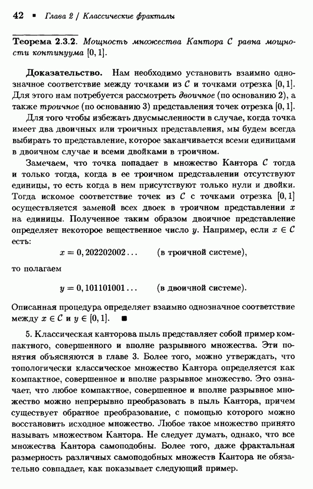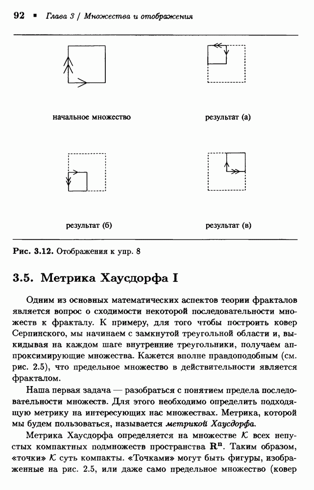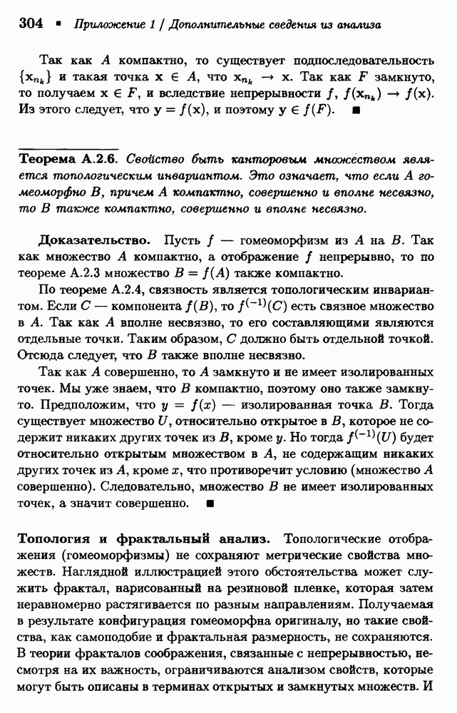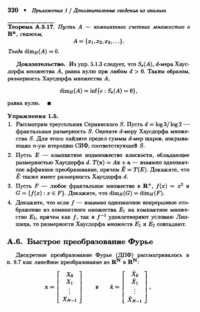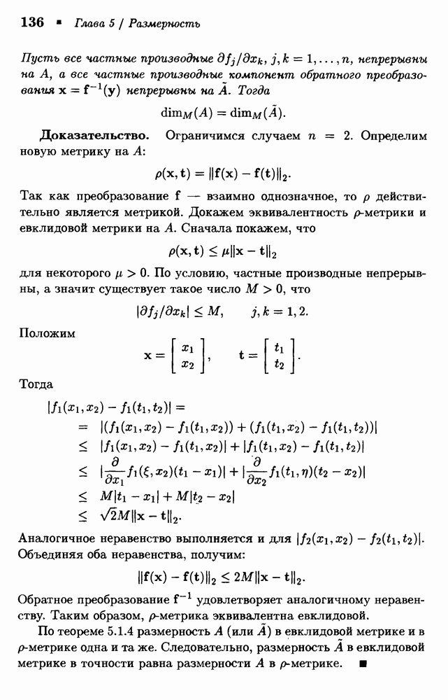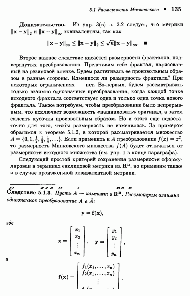 Второе важное следствие касается размерности фракталов, подвергнутых преобразованию. Представим себе фрактал, нарисованный на резиновой пленке. Будем растягивать ее произвольным образом в разные стороны. Изменится ли размерность фрактала? При некоторых ограничениях — нет. Во-первых, будем рассматривать только взаимно однозначные преобразования, когда каждой точке исходного фрактала соответствует одна и только одна точка нового фрактала. Также потребуем, чтобы преобразование было непрерывным, что исключает возможность «нашинковать» оригинал, а затем склеить кусочки произвольным образом. Но и этого еще недостаточно для того, чтобы размерность не изменилась. За примером обратимся к теореме 5.1.2, в которой рассматривается множество Следующий простой критерий сохранения размерности сформулирован в терминах евклидовой метрики на Следствие 5.1.3. Пусть А — компакт в