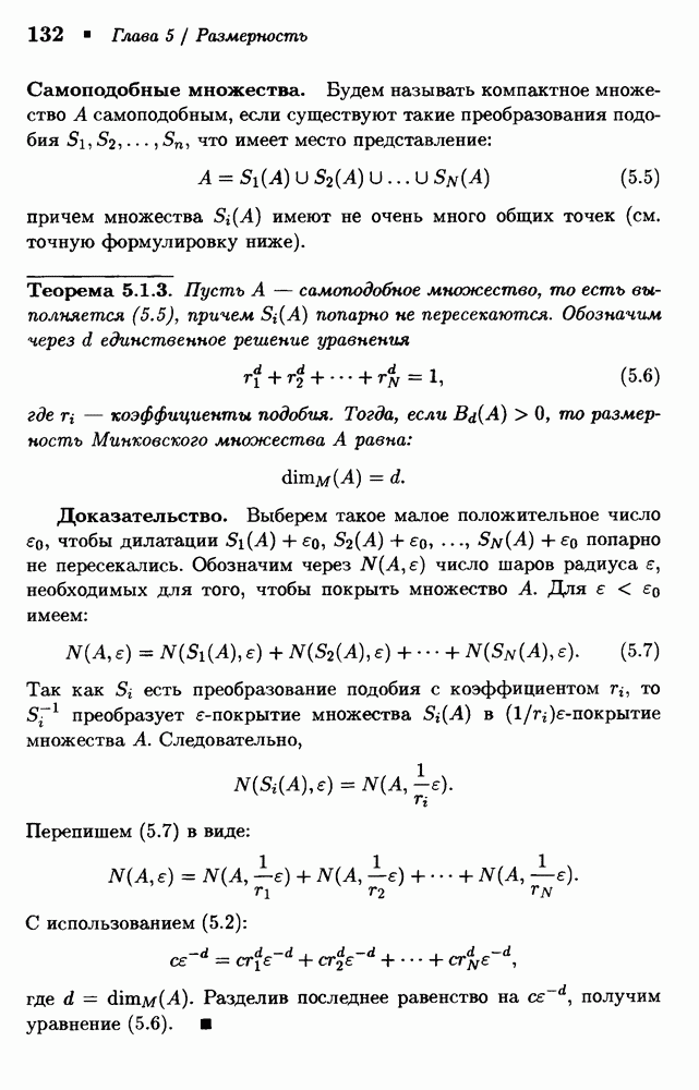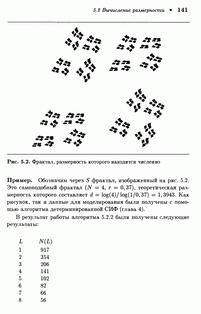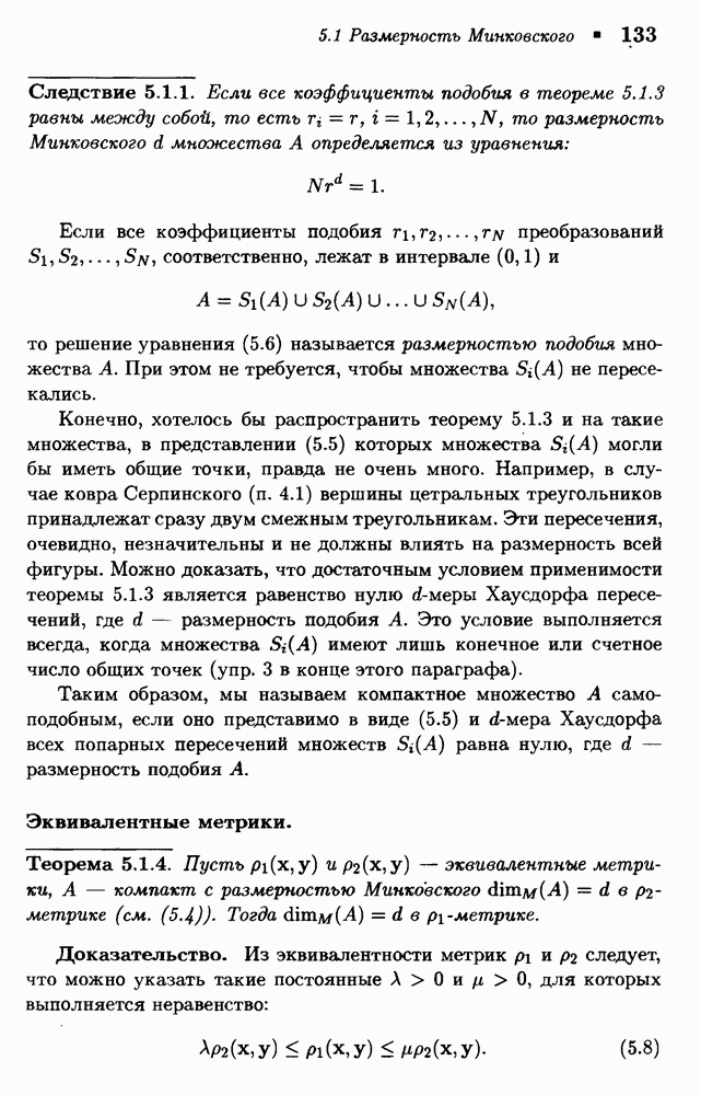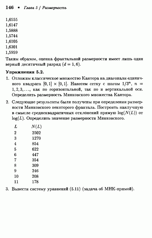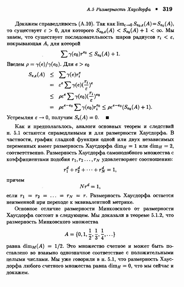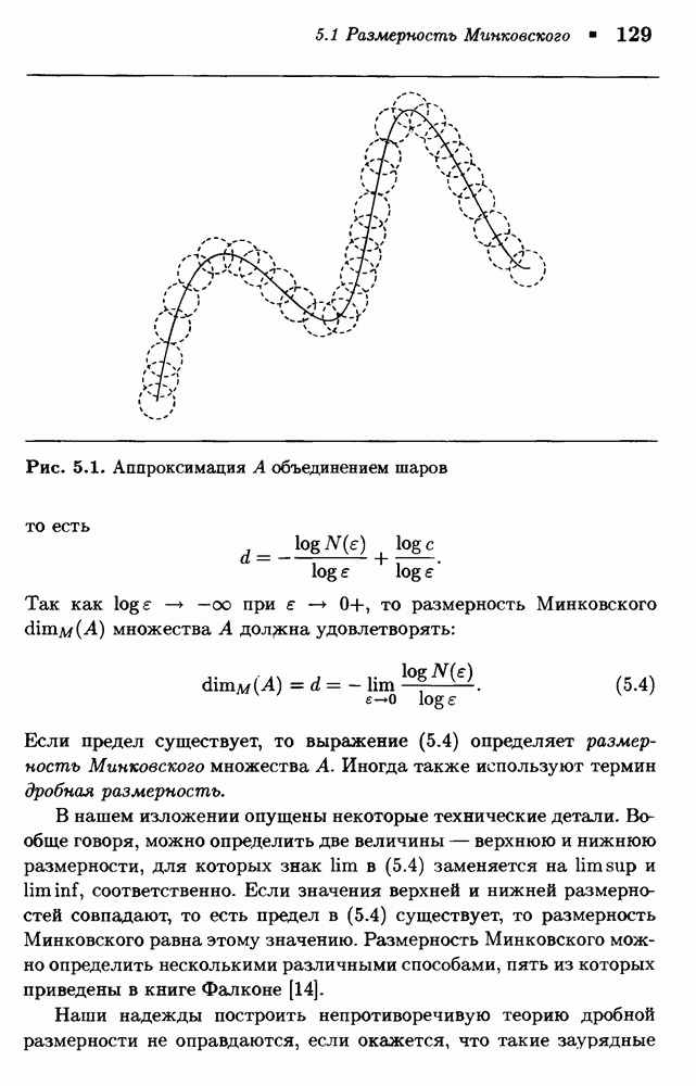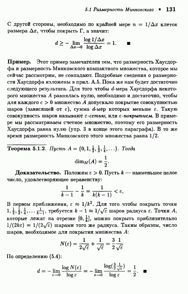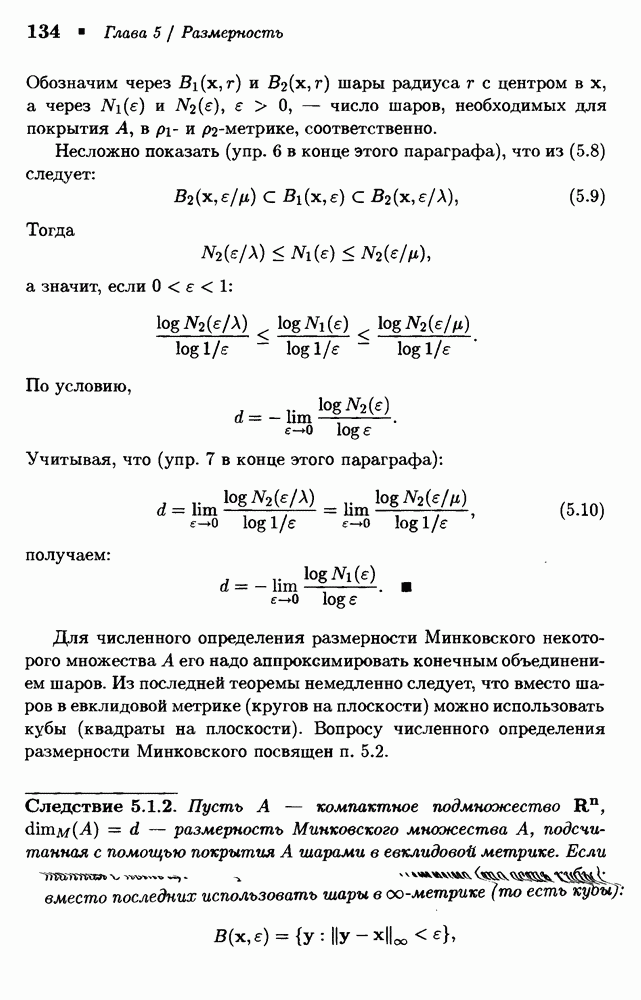 Для численного определения размерности Минковского некоторого множества А его надо аппроксимировать конечным объединением шаров. Из последней теоремы немедленно следует, что вместо шаров в евклидовой метрике (кругов на плоскости) можно использовать кубы (квадраты на плоскости). Вопросу численного определения размерности Минковского посвящен п. 5.2. Следствие 5.1.2. Пусть А — компактное подмножество