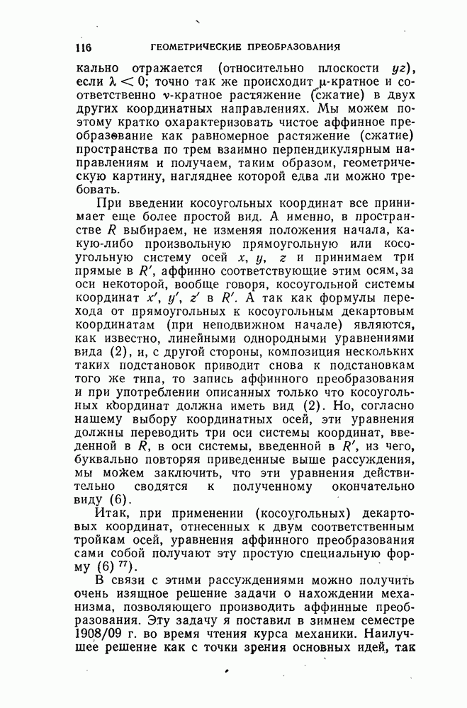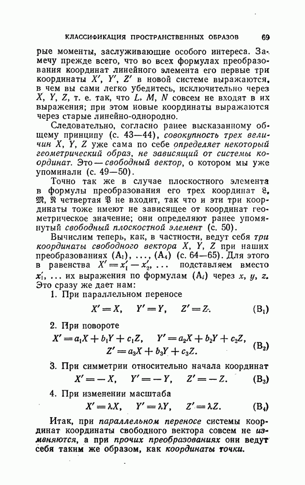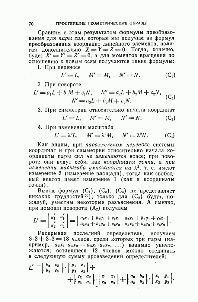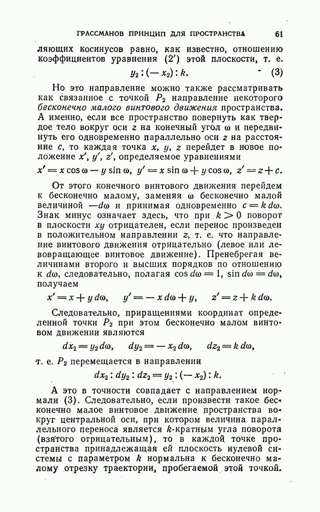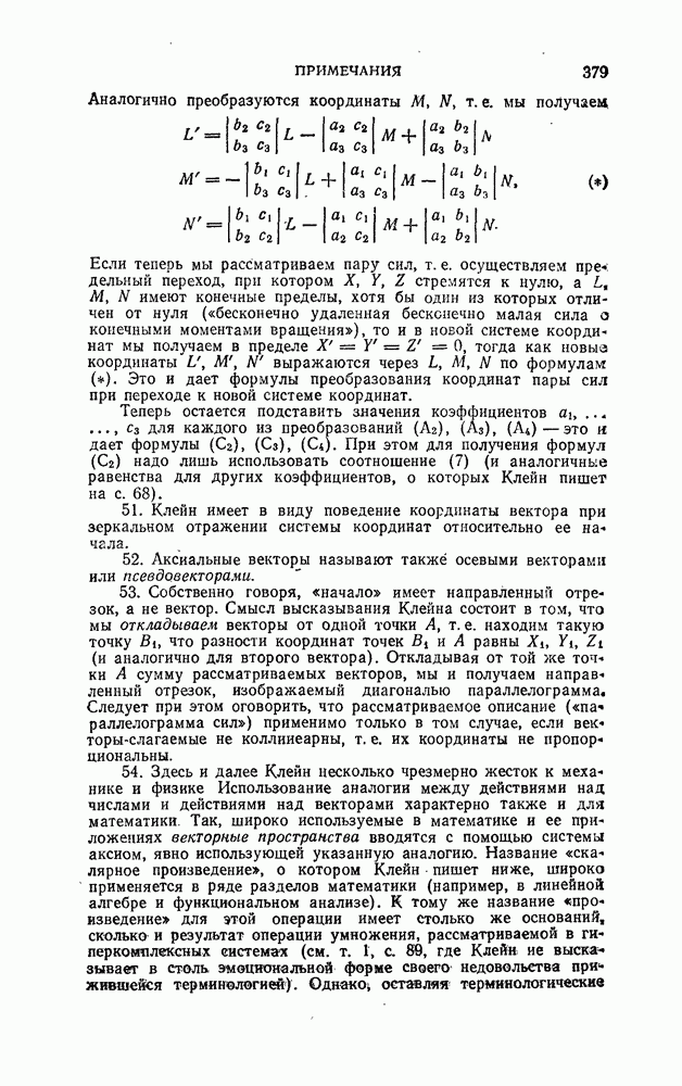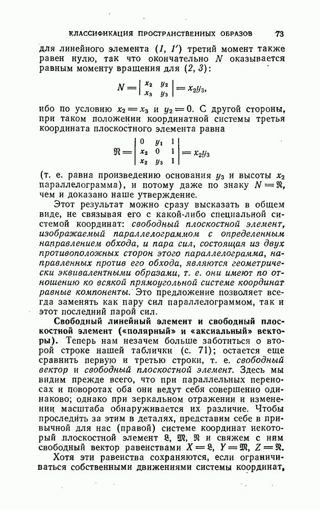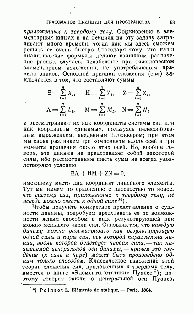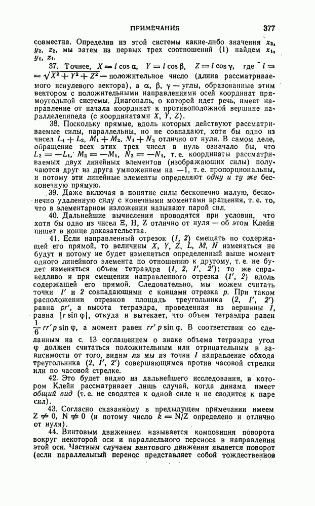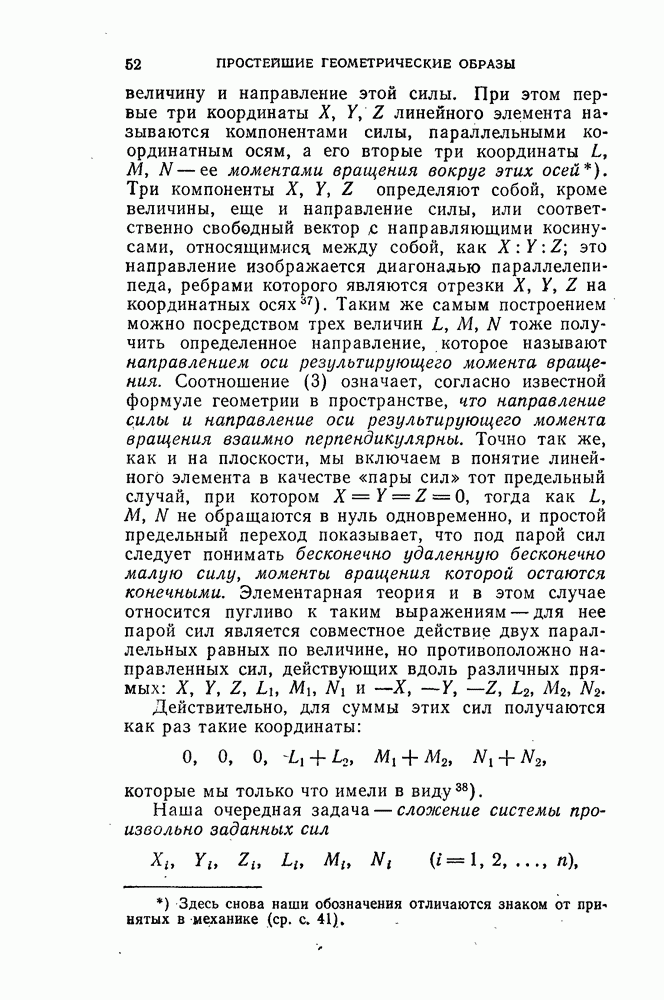 и рассматривают их как координаты системы сил или как координаты «динамы», пользуясь целесообразным выражением, введенным Плюккером; при этом мы снова различаем три компоненты вдоль осей и три момента вращения около этих осей. Но, вообще говоря, эта динама не представляет собой некоторой силы, ибо рассмотренные шесть сумм не всегда удовлетворяют условию