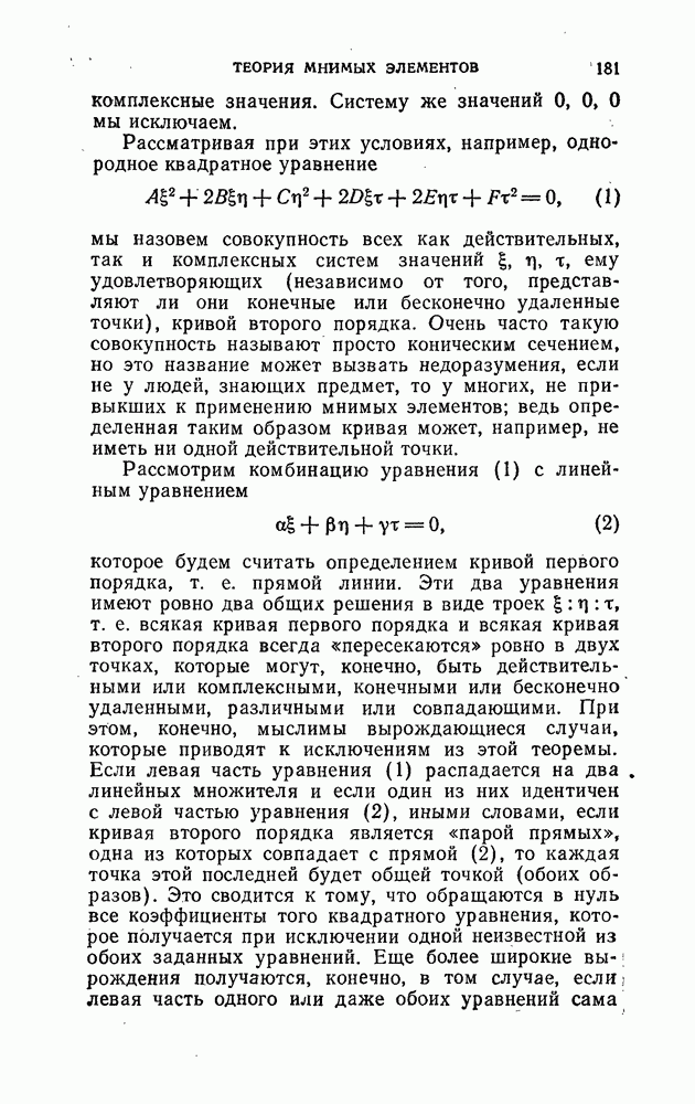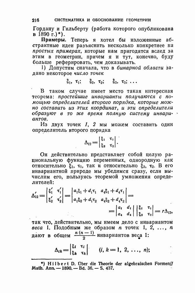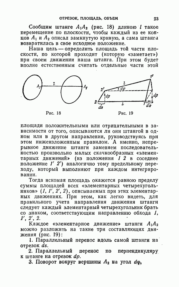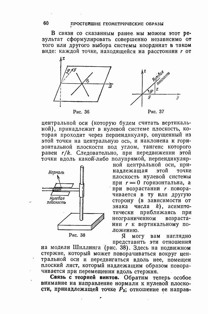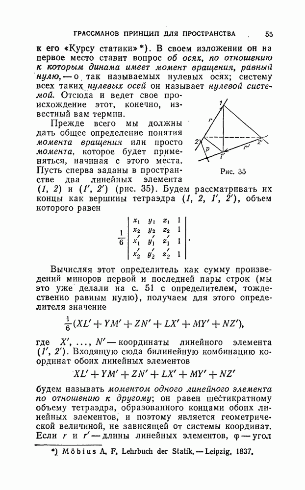 В самом деле, можно считать, что знаменатель отличен от нуля, ибо в противном случае мы с самого начала имели бы дело не с собственной динамой, а только с парой сил. Таким образом, приписывая параметру k это значение—Плюккер называет его параметром динамы, — мы действительно получаем искомое разложение динамы на требуемые пару сил и одну силу, причем из хода доказательства видно, что это разложение однозначно. Связь с нулевой системой Мёбиуса. Теперь возникает вопрос о том, с какими геометрическими представлениями можно связать это разложение. Эти исследования также восходят к Мёбиусу, а именно, к его «Курсу статики». В своем изложении он на первое место ставит вопрос об осях, по отношению к которым динама имеет момент вращения, равный нулю, — о так называемых нулевых осях; систему всех таки нулевых осей он называет нулевой системой. Отсюда и ведет свое происхождение этот, конечно, известный вам термин. Прежде всего мы должны дать общее определение понятия момента вращения или просто момента, которое будет применяться, начиная с этого места. Пусть сперва заданы в пространстве два линейных элемента (1, 2) и (1, 2) (рис. 35).