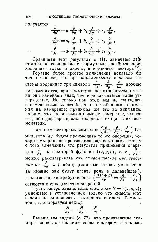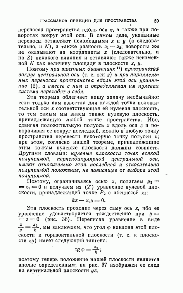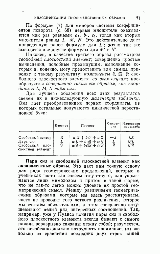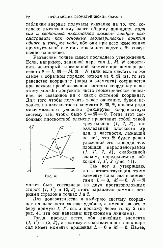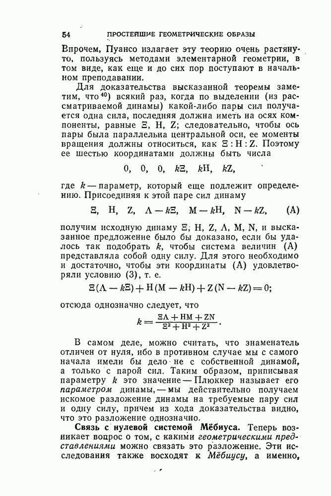 имеющему место для координат линейного элемента. Тут мы имеем по сравнению с плоскостью то новое, что систему сил, приложенных к твердому телу, не всегда можно свести к одной силе. Чтобы получить конкретное представление о сущности динамы, попробуем представить ее по возможности ясным способом в виде результирующей как можно меньшего числа сил. Оказывается, что каждую динаму можно рассматривать как результирующую одной силы и пары сил, ось которой параллельна линии, вдоль которой действует первая сила, — гак называемой центральной оси динамы, — причем это сведение (к силе и паре) может быть произведено одним только способом. Классическое изложение этой теории сложения сил, приложенных к твердому телу, имеется в книге «Элементы статики» Пуансо; поэтому говорят также о центральной оси Пуансо. Впрочем, Пуансо излагает эту теорию очень растянуто, пользуясь методами элементарной геометрии, в том виде, как еще и до сих пор поступают в начальном преподавании. Для доказательства высказанной теоремы заметим, что всякий раз, когда по выделении (из рассматриваемой динамы) какой-либо пары сил получается одна сила, последняя должна иметь на осях компоненты, равные S, Н, Z; следовательно, чтобы ось пары была параллельна центральной оси, ее моменты вращения должны относиться, как