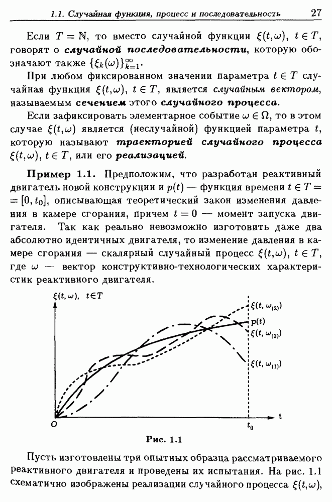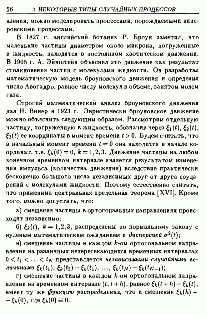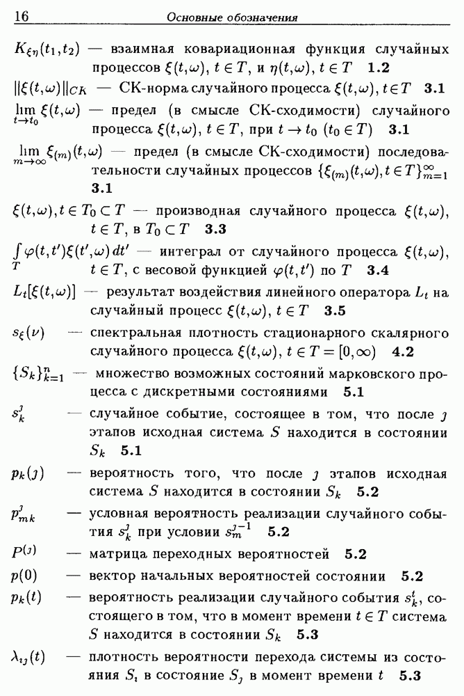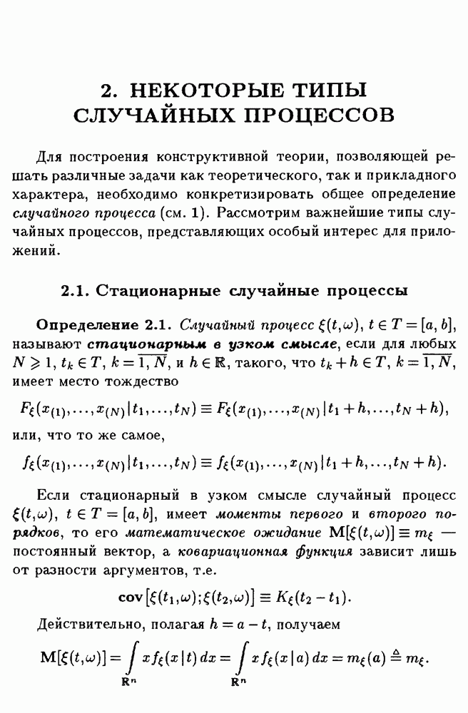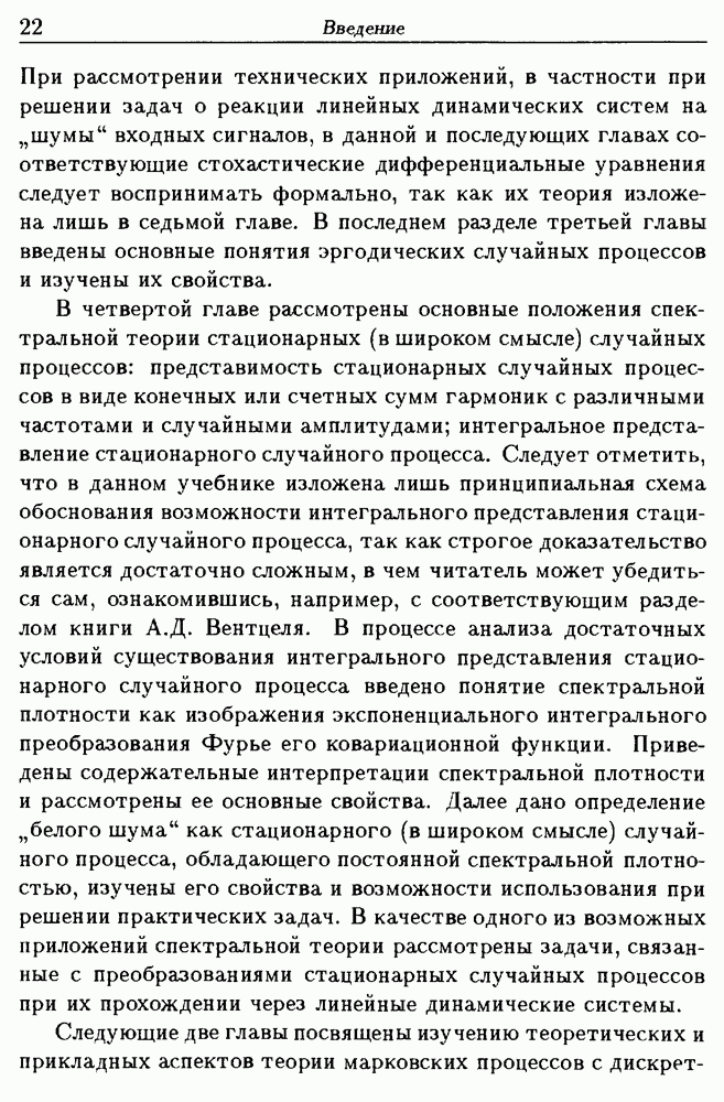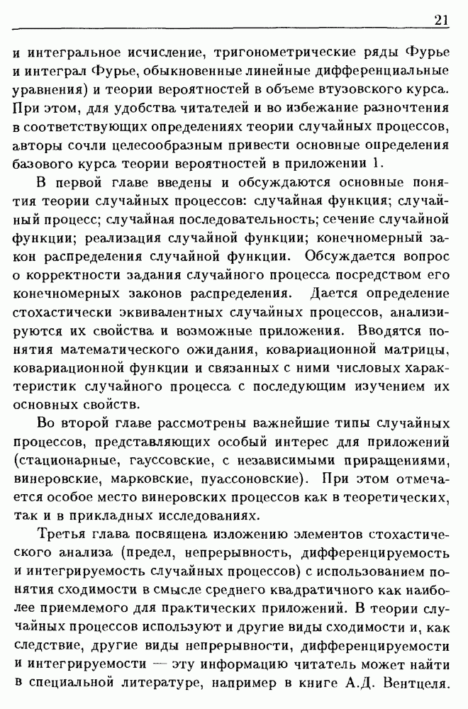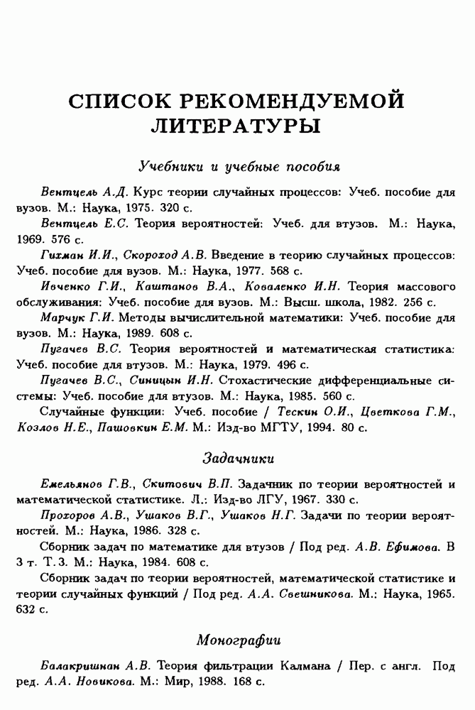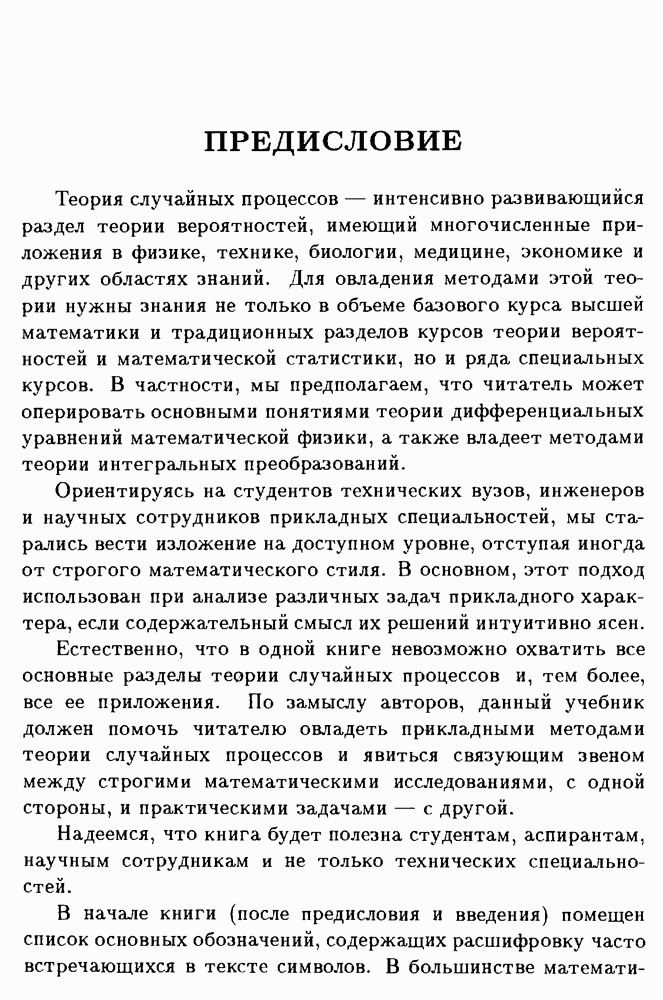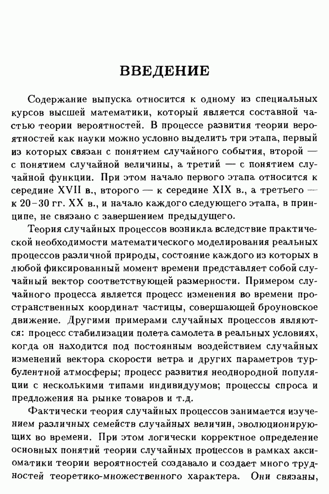 ВВЕДЕНИЕСодержание выпуска относится к одному из специальных курсов высшей математики, который является составной частью теории вероятностей. В процессе развития теории вероятностей как науки можно условно выделить три этапа, первый из которых связан с понятием случайного события, второй — с понятием случайной величины, а третий — с понятием случайной функции. При этом начало первого этапа относится к середине XVII в., второго — к середине XIX в., а третьего — к 20-30 гг. XX в., и начало каждого следующего этапа, в принципе, не связано с завершением предыдущего. Теория случайных процессов возникла вследствие практической необходимости математического моделирования реальных процессов различной природы, состояние каждого из которых в любой фиксированный момент времени представляет собой случайный вектор соответствующей размерности. Примером случайного процесса является процесс изменения во времени пространственных координат частицы, совершающей броуновское движение. Другими примерами случайных процессов являются: процесс стабилизации полета самолета в реальных условиях, когда он находится под постоянным воздействием случайных изменений вектора скорости ветра и других параметров турбулентной атмосферы; процесс развития неоднородной популяции с несколькими типами индивидуумов; процессы спроса и предложения на рынке товаров и т.д. Фактически теория случайных процессов занимается изучением различных семейств случайных величин, эволюционирующих во времени. При этом логически корректное определение основных понятий теории случайных процессов в рамках аксиоматики теории вероятностей создавало и создает много трудностей теоретико-множественного характера. Они связаны, например, с определениями непрерывности, дифференцируемости, интегрируемости и других свойств случайных процессов. Именно поэтому в монографиях по теории случайных процессов значительное место занимает анализ развития теоретикомножественных конструкций. Они написаны на высоком теоретическом уровне и, как правило, сложны для понимания специалистов, занимающихся прикладными проблемами в различных областях человеческой деятельности, решение которых предполагает широкое использование методов теории случайных процессов. А так как литература по прикладным аспектам теории случайных процессов, доступная для понимания широкому кругу студентов, аспирантов и научных работников, имеющих математическую подготовку в объеме стандартного курса высшей математики, весьма немногочисленна, то возникла необходимость в написании этой книги. Основной целью написания предлагаемого учебника явилось систематическое изложение элементов теории случайных процессов, усвоение которых должно способствовать активному овладению ее прикладными методами при решении практических задач. Различный уровень общей математической подготовки читателей и разнообразие их запросов авторы попытались учесть компоновкой материала по разделам с возрастающими уровнями сложности. Все основные понятия и методы иллюстрированы примерами, а в конце каждой главы приведены контрольные вопросы и упражнения. Отметим, что учебник не содержит библиографии по теории случайных процессов и ее приложениям. В списке рекомендуемой литературы указаны лишь те источники, обращение к ко