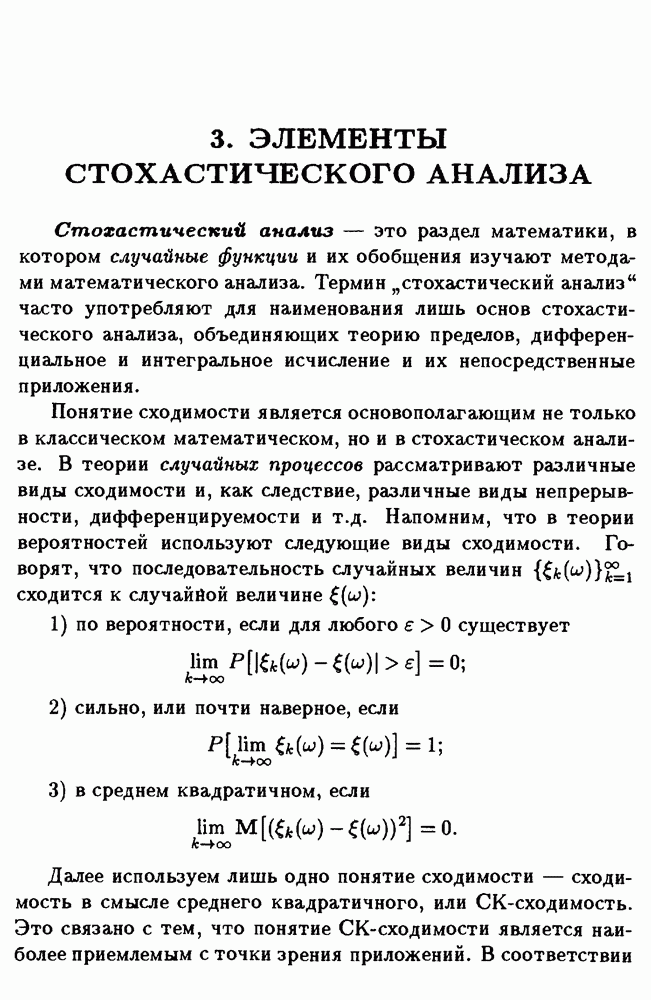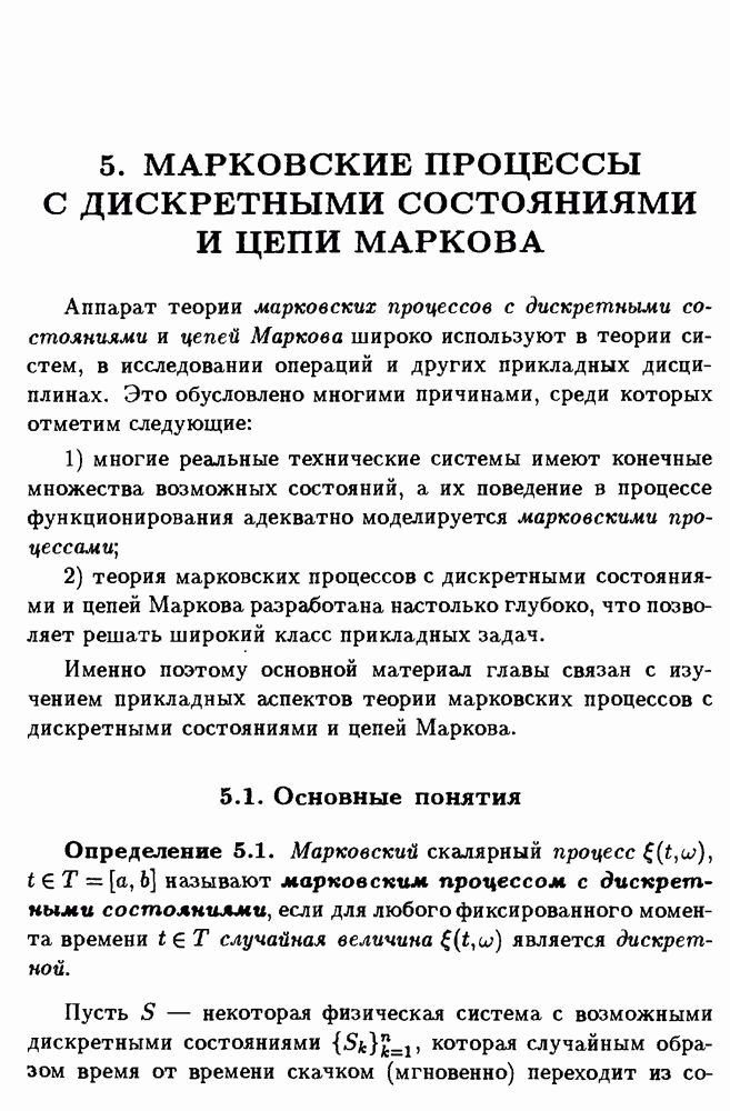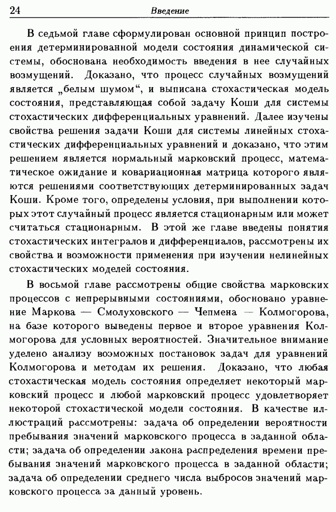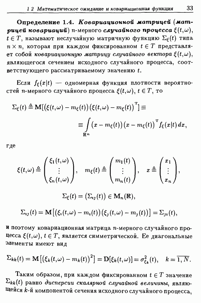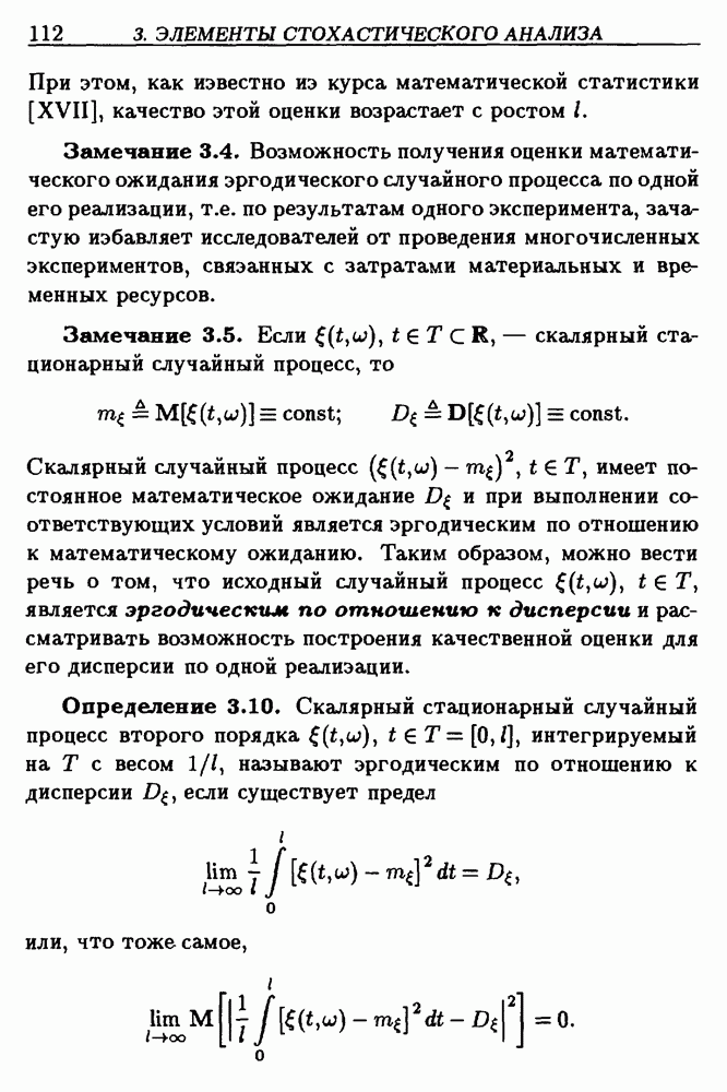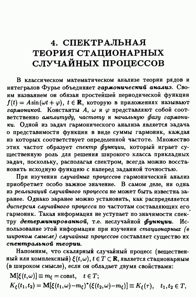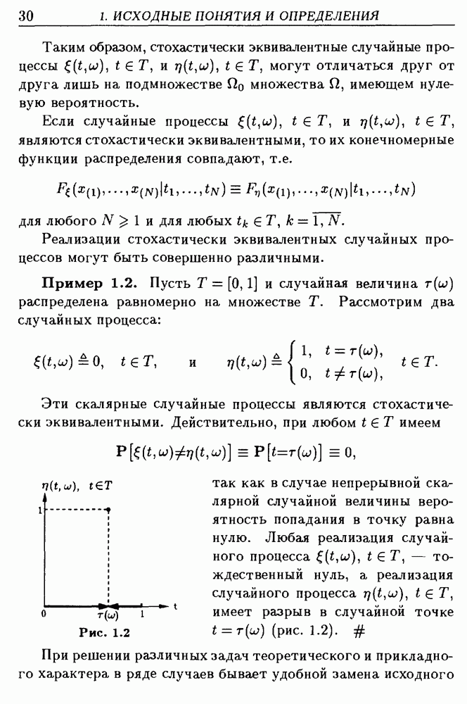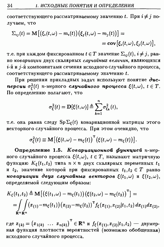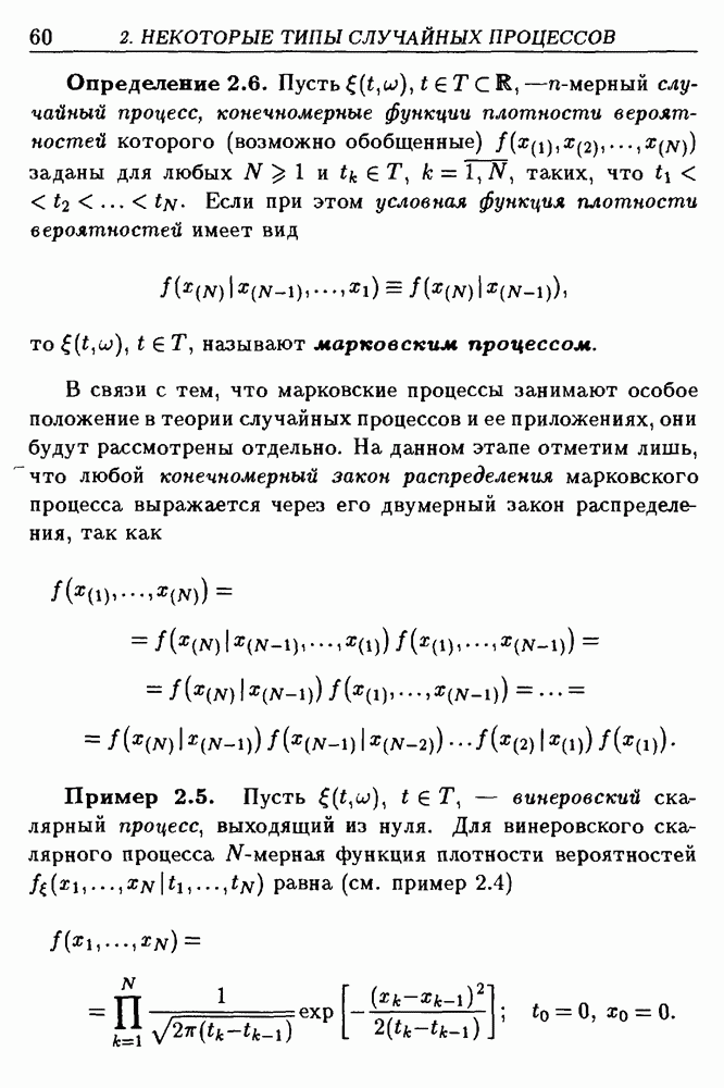 ВВЕДЕНИЕСодержание выпуска относится к одному из специальных курсов высшей математики, который является составной частью теории вероятностей. В процессе развития теории вероятностей как науки можно условно выделить три этапа, первый из которых связан с понятием случайного события, второй — с понятием случайной величины, а третий — с понятием случайной функции. При этом начало первого этапа относится к середине XVII в., второго — к середине XIX в., а третьего — к 20-30 гг. XX в., и начало каждого следующего этапа, в принципе, не связано с завершением предыдущего. Теория случайных процессов возникла вследствие практической необходимости математического моделирования реальных процессов различной природы, состояние каждого из которых в любой фиксированный момент времени представляет собой случайный вектор соответствующей размерности. Примером случайного процесса является процесс изменения во времени пространственных координат частицы, совершающей броуновское движение. Другими примерами случайных процессов являются: процесс стабилизации полета самолета в реальных условиях, когда он находится под постоянным воздействием случайных изменений вектора скорости ветра и других параметров турбулентной атмосферы; процесс развития неоднородной популяции с несколькими типами индивидуумов; процессы спроса и предложения на рынке товаров и т.д. Фактически теория случайных процессов занимается изучением различных семейств случайных величин, эволюционирующих во времени. При этом логически корректное определение основных понятий теории случайных процессов в рамках аксиоматики теории вероятностей создавало и создает много трудностей теоретико-множественного характера. Они связаны, например, с определениями непрерывности, дифференцируемости, интегрируемости и других свойств случайных процессов. Именно поэтому в монографиях по теории случайных процессов значительное место занимает анализ развития теоретикомножественных конструкций. Они написаны на высоком теоретическом уровне и, как правило, сложны для понимания специалистов, занимающихся прикладными проблемами в различных областях человеческой деятельности, решение которых предполагает широкое использование методов теории случайных процессов. А так как литература по прикладным аспектам теории случайных процессов, доступная для понимания широкому кругу студентов, аспирантов и научных работников, имеющих математическую подготовку в объеме стандартного курса высшей математики, весьма немногочисленна, то возникла необходимость в написании этой книги. Основной целью написания предлагаемого учебника явилось систематическое изложение элементов теории случайных процессов, усвоение которых должно способствовать активному овладению ее прикладными методами при решении практических задач. Различный уровень общей математической подготовки читателей и разнообразие их запросов авторы попытались учесть компоновкой материала по разделам с возрастающими уровнями сложности. Все основные понятия и методы иллюстрированы примерами, а в конце каждой главы приведены контрольные вопросы и упражнения. Отметим, что учебник не содержит библиографии по теории случайных процессов и ее приложениям. В списке рекомендуемой литературы указаны лишь те источники, обращение к ко