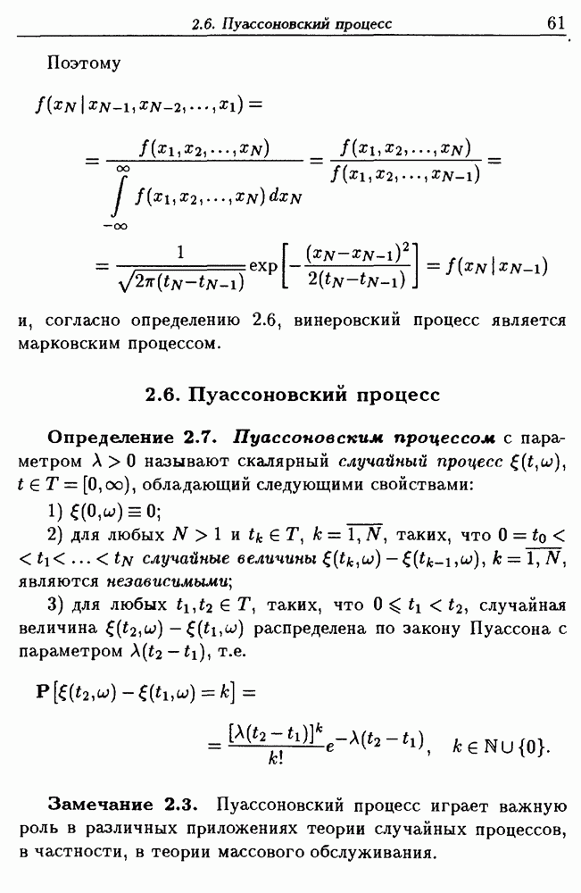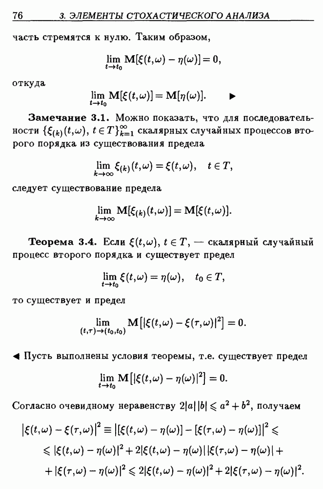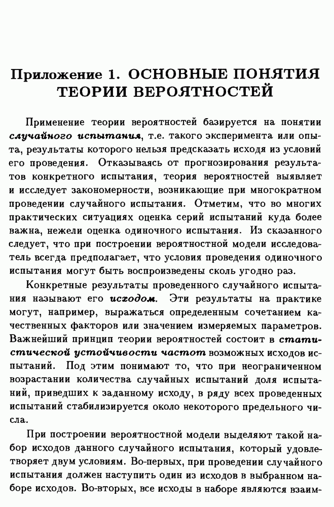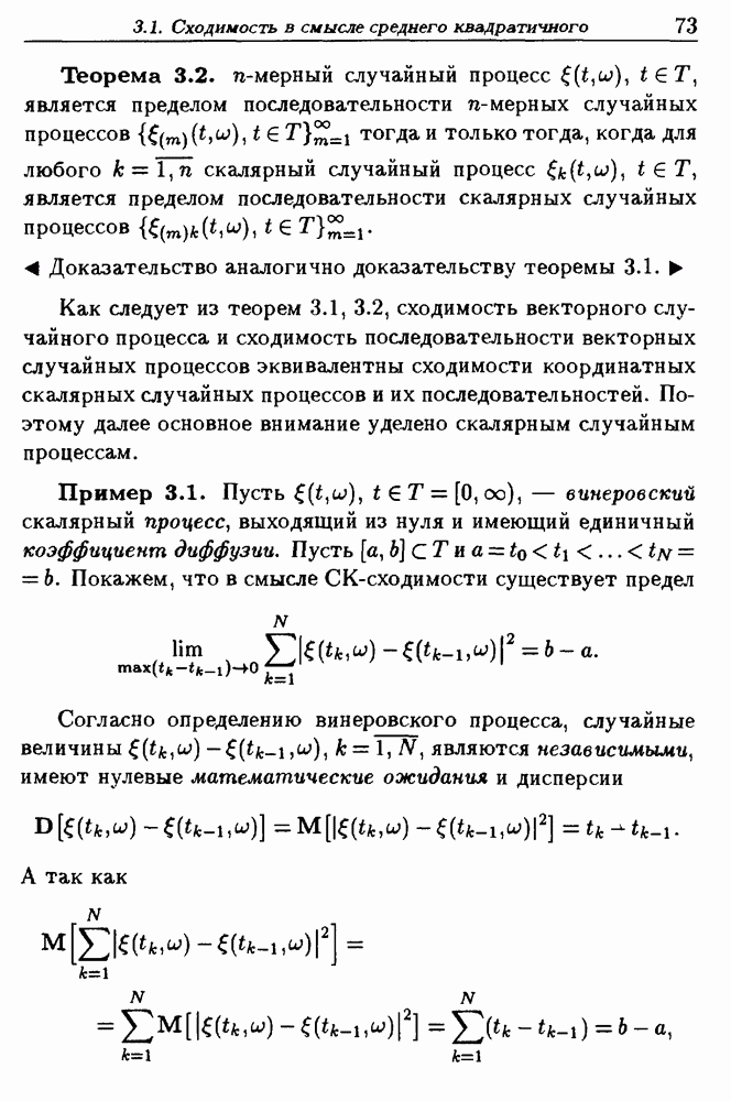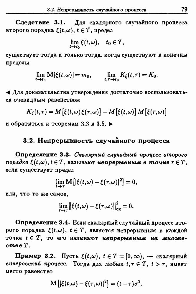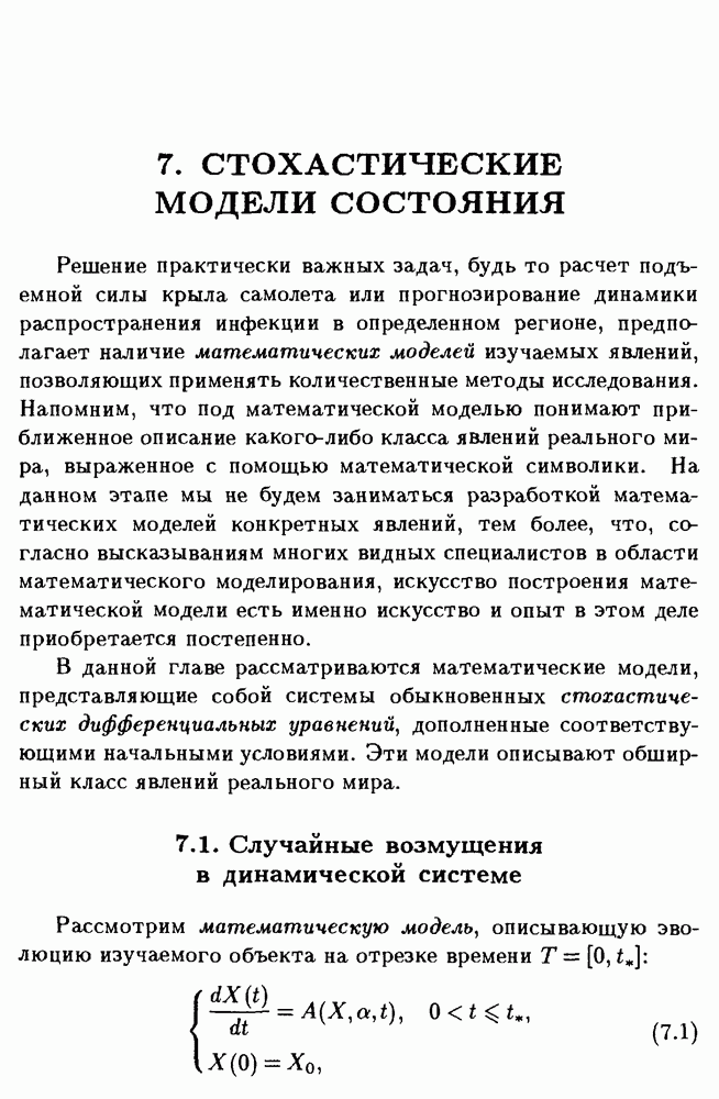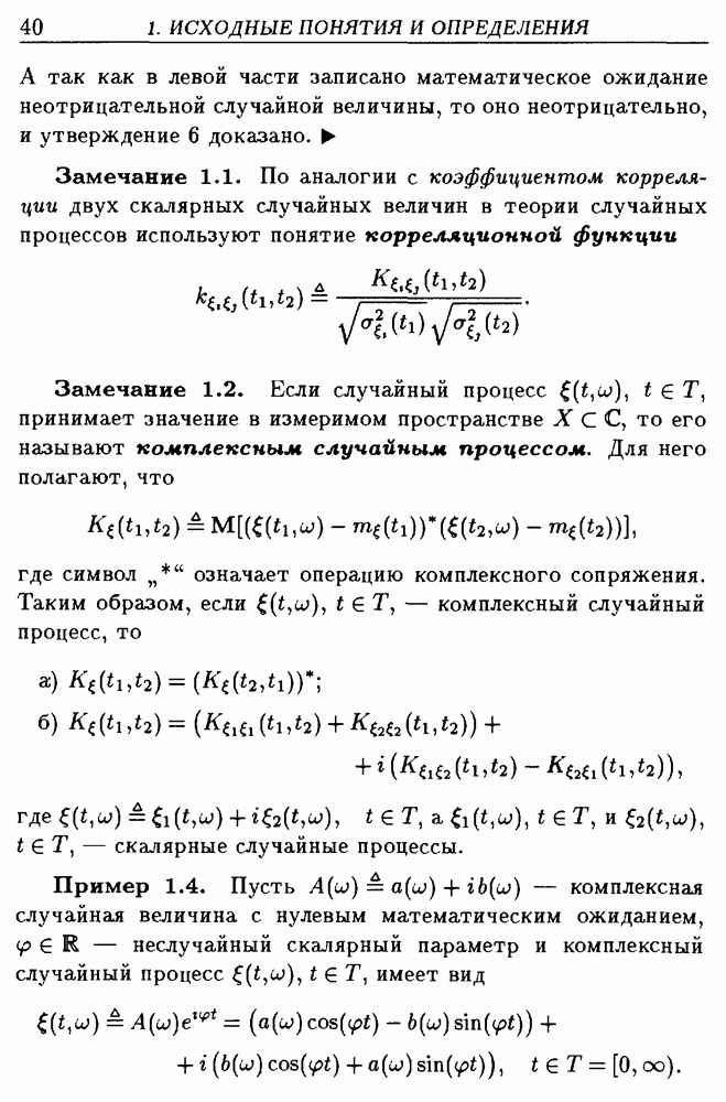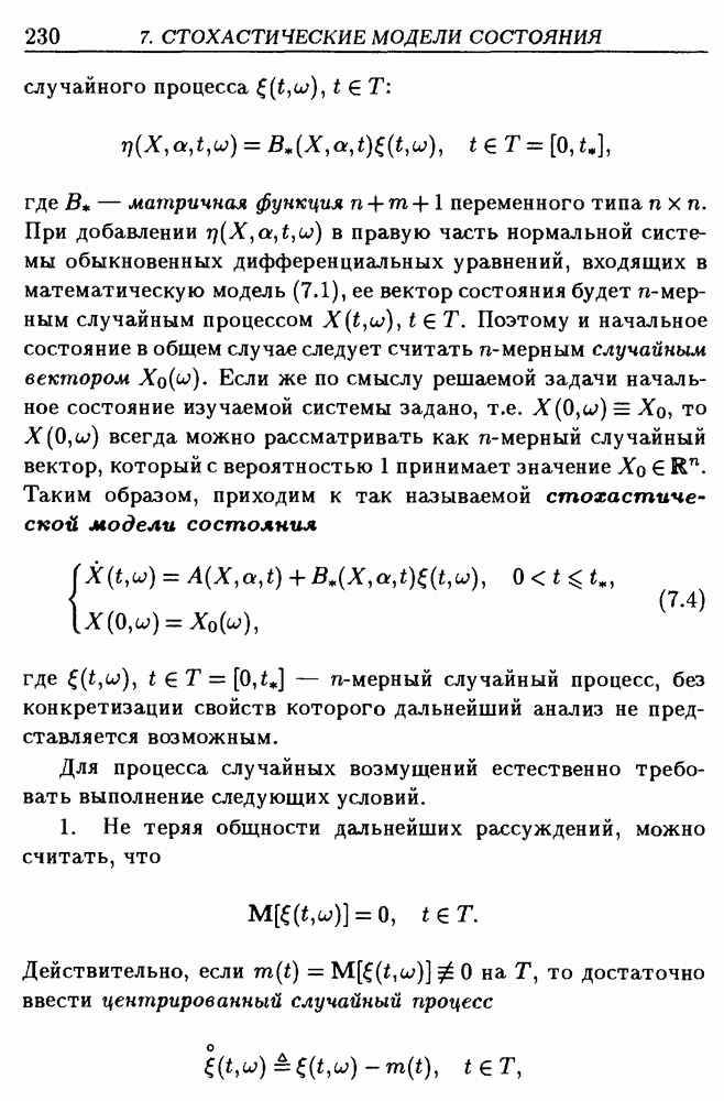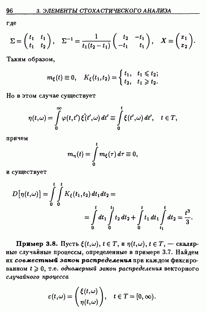 ВВЕДЕНИЕСодержание выпуска относится к одному из специальных курсов высшей математики, который является составной частью теории вероятностей. В процессе развития теории вероятностей как науки можно условно выделить три этапа, первый из которых связан с понятием случайного события, второй — с понятием случайной величины, а третий — с понятием случайной функции. При этом начало первого этапа относится к середине XVII в., второго — к середине XIX в., а третьего — к 20-30 гг. XX в., и начало каждого следующего этапа, в принципе, не связано с завершением предыдущего. Теория случайных процессов возникла вследствие практической необходимости математического моделирования реальных процессов различной природы, состояние каждого из которых в любой фиксированный момент времени представляет собой случайный вектор соответствующей размерности. Примером случайного процесса является процесс изменения во времени пространственных координат частицы, совершающей броуновское движение. Другими примерами случайных процессов являются: процесс стабилизации полета самолета в реальных условиях, когда он находится под постоянным воздействием случайных изменений вектора скорости ветра и других параметров турбулентной атмосферы; процесс развития неоднородной популяции с несколькими типами индивидуумов; процессы спроса и предложения на рынке товаров и т.д. Фактически теория случайных процессов занимается изучением различных семейств случайных величин, эволюционирующих во времени. При этом логически корректное определение основных понятий теории случайных процессов в рамках аксиоматики теории вероятностей создавало и создает много трудностей теоретико-множественного характера. Они связаны, например, с определениями непрерывности, дифференцируемости, интегрируемости и других свойств случайных процессов. Именно поэтому в монографиях по теории случайных процессов значительное место занимает анализ развития теоретикомножественных конструкций. Они написаны на высоком теоретическом уровне и, как правило, сложны для понимания специалистов, занимающихся прикладными проблемами в различных областях человеческой деятельности, решение которых предполагает широкое использование методов теории случайных процессов. А так как литература по прикладным аспектам теории случайных процессов, доступная для понимания широкому кругу студентов, аспирантов и научных работников, имеющих математическую подготовку в объеме стандартного курса высшей математики, весьма немногочисленна, то возникла необходимость в написании этой книги. Основной целью написания предлагаемого учебника явилось систематическое изложение элементов теории случайных процессов, усвоение которых должно способствовать активному овладению ее прикладными методами при решении практических задач. Различный уровень общей математической подготовки читателей и разнообразие их запросов авторы попытались учесть компоновкой материала по разделам с возрастающими уровнями сложности. Все основные понятия и методы иллюстрированы примерами, а в конце каждой главы приведены контрольные вопросы и упражнения. Отметим, что учебник не содержит библиографии по теории случайных процессов и ее приложениям. В списке рекомендуемой литературы указаны лишь те источники, обращение к ко