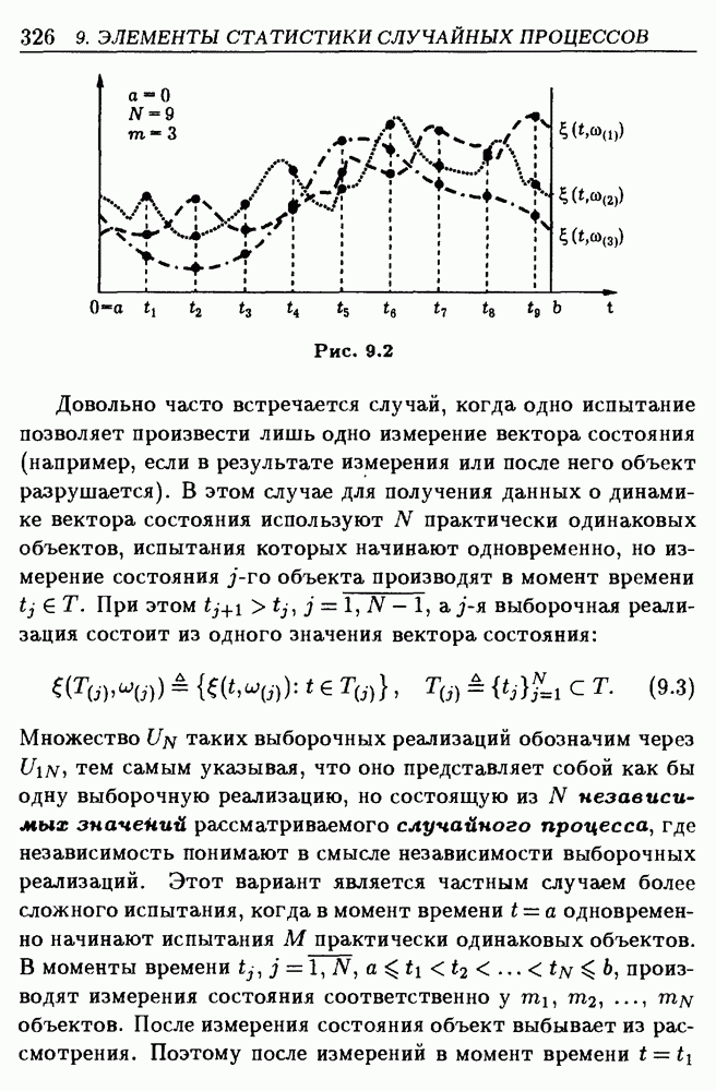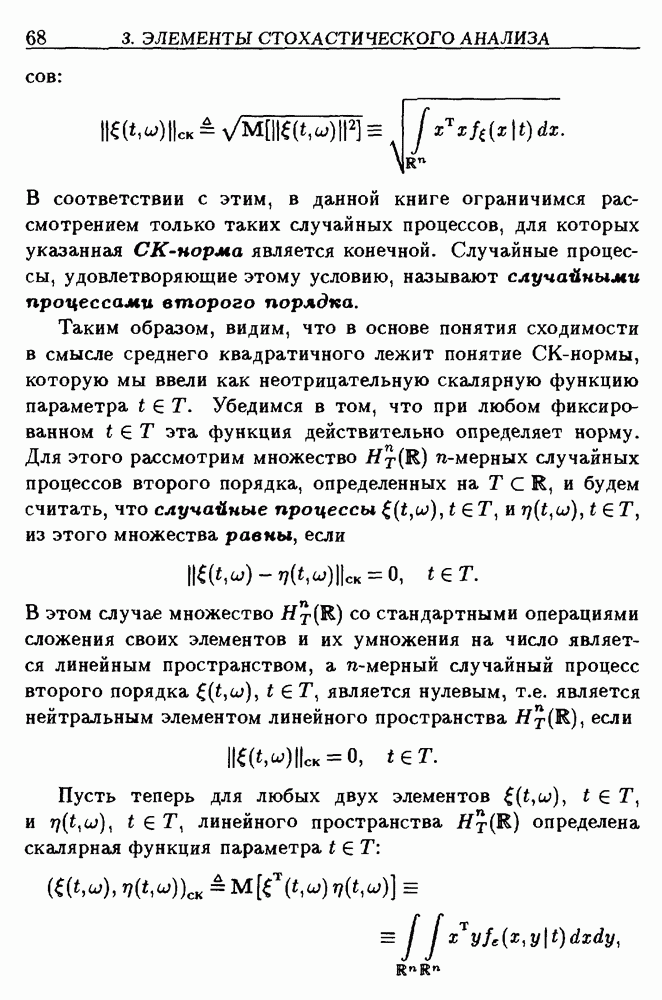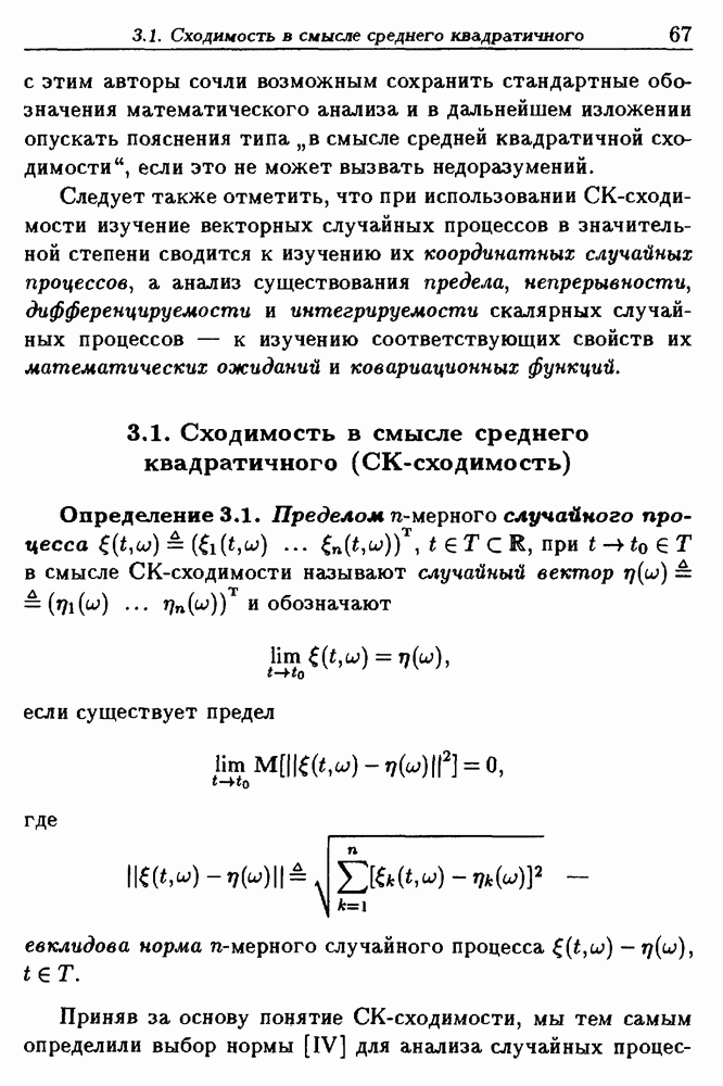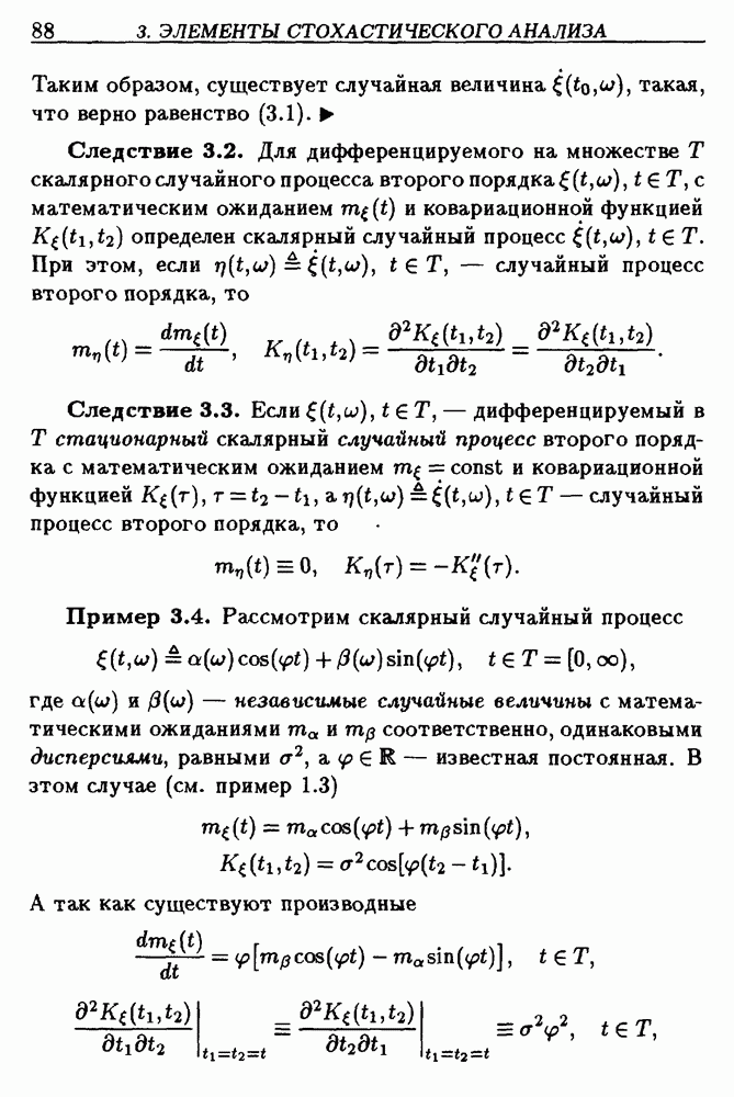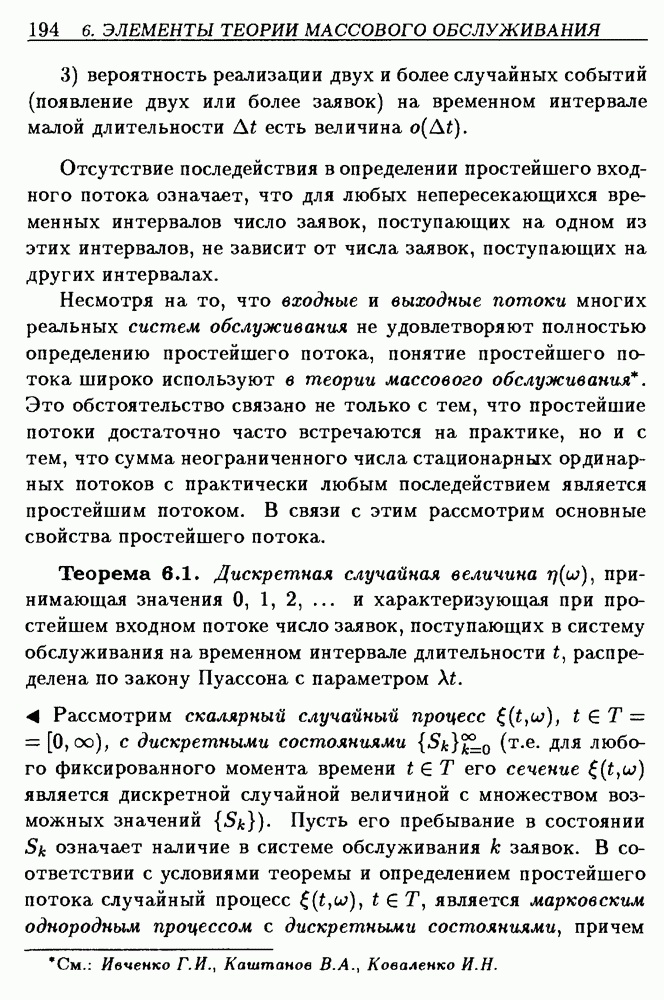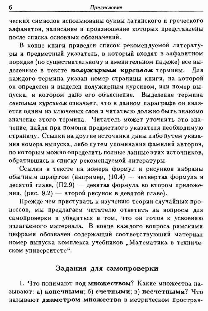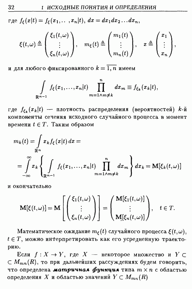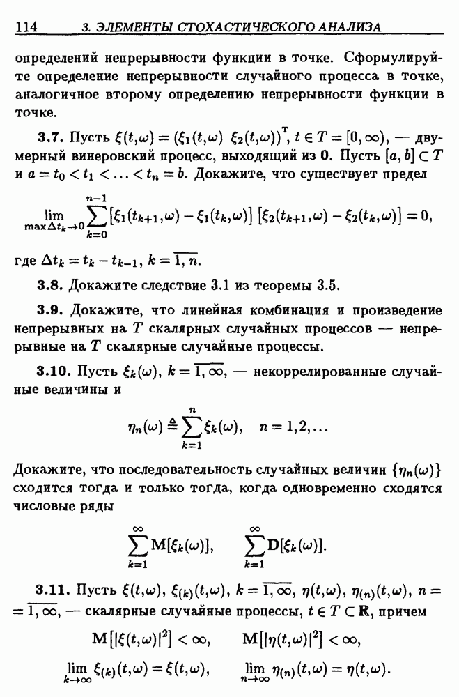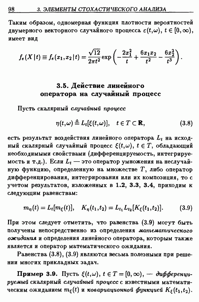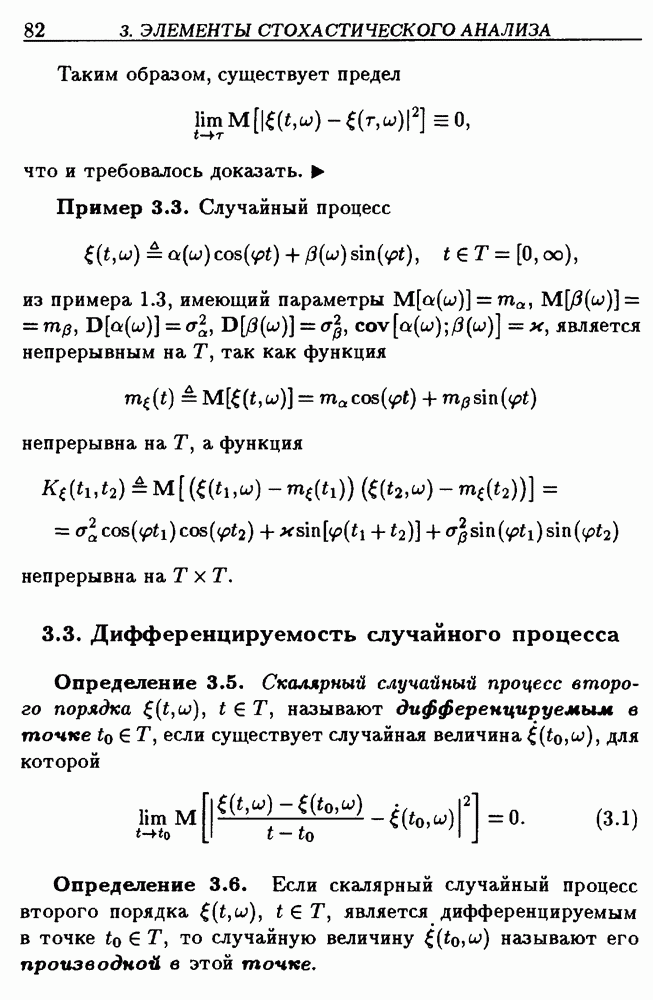ВВЕДЕНИЕСодержание выпуска относится к одному из специальных курсов высшей математики, который является составной частью теории вероятностей. В процессе развития теории вероятностей как науки можно условно выделить три этапа, первый из которых связан с понятием случайного события, второй — с понятием случайной величины, а третий — с понятием случайной функции. При этом начало первого этапа относится к середине XVII в., второго — к середине XIX в., а третьего — к 20-30 гг. XX в., и начало каждого следующего этапа, в принципе, не связано с завершением предыдущего. Теория случайных процессов возникла вследствие практической необходимости математического моделирования реальных процессов различной природы, состояние каждого из которых в любой фиксированный момент времени представляет собой случайный вектор соответствующей размерности. Примером случайного процесса является процесс изменения во времени пространственных координат частицы, совершающей броуновское движение. Другими примерами случайных процессов являются: процесс стабилизации полета самолета в реальных условиях, когда он находится под постоянным воздействием случайных изменений вектора скорости ветра и других параметров турбулентной атмосферы; процесс развития неоднородной популяции с несколькими типами индивидуумов; процессы спроса и предложения на рынке товаров и т.д. Фактически теория случайных процессов занимается изучением различных семейств случайных величин, эволюционирующих во времени. При этом логически корректное определение основных понятий теории случайных процессов в рамках аксиоматики теории вероятностей создавало и создает много трудностей теоретико-множественного характера. Они связаны, например, с определениями непрерывности, дифференцируемости, интегрируемости и других свойств случайных процессов. Именно поэтому в монографиях по теории случайных процессов значительное место занимает анализ развития теоретикомножественных конструкций. Они написаны на высоком теоретическом уровне и, как правило, сложны для понимания специалистов, занимающихся прикладными проблемами в различных областях человеческой деятельности, решение которых предполагает широкое использование методов теории случайных процессов. А так как литература по прикладным аспектам теории случайных процессов, доступная для понимания широкому кругу студентов, аспирантов и научных работников, имеющих математическую подготовку в объеме стандартного курса высшей математики, весьма немногочисленна, то возникла необходимость в написании этой книги. Основной целью написания предлагаемого учебника явилось систематическое изложение элементов теории случайных процессов, усвоение которых должно способствовать активному овладению ее прикладными методами при решении практических задач. Различный уровень общей математической подготовки читателей и разнообразие их запросов авторы попытались учесть компоновкой материала по разделам с возрастающими уровнями сложности. Все основные понятия и методы иллюстрированы примерами, а в конце каждой главы приведены контрольные вопросы и упражнения. Отметим, что учебник не содержит библиографии по теории случайных процессов и ее приложениям. В списке рекомендуемой литературы указаны лишь те источники, обращение к ко