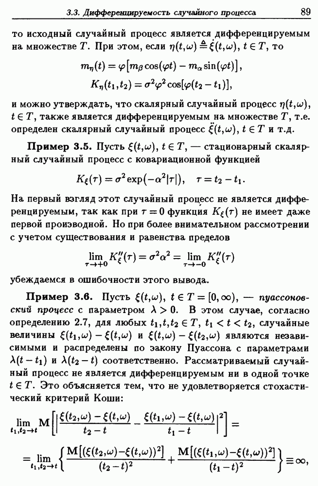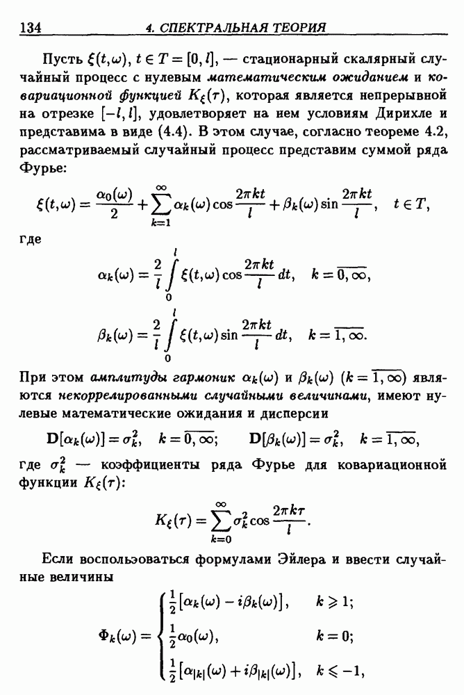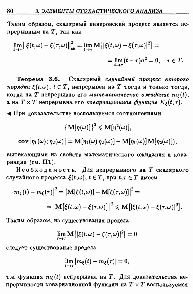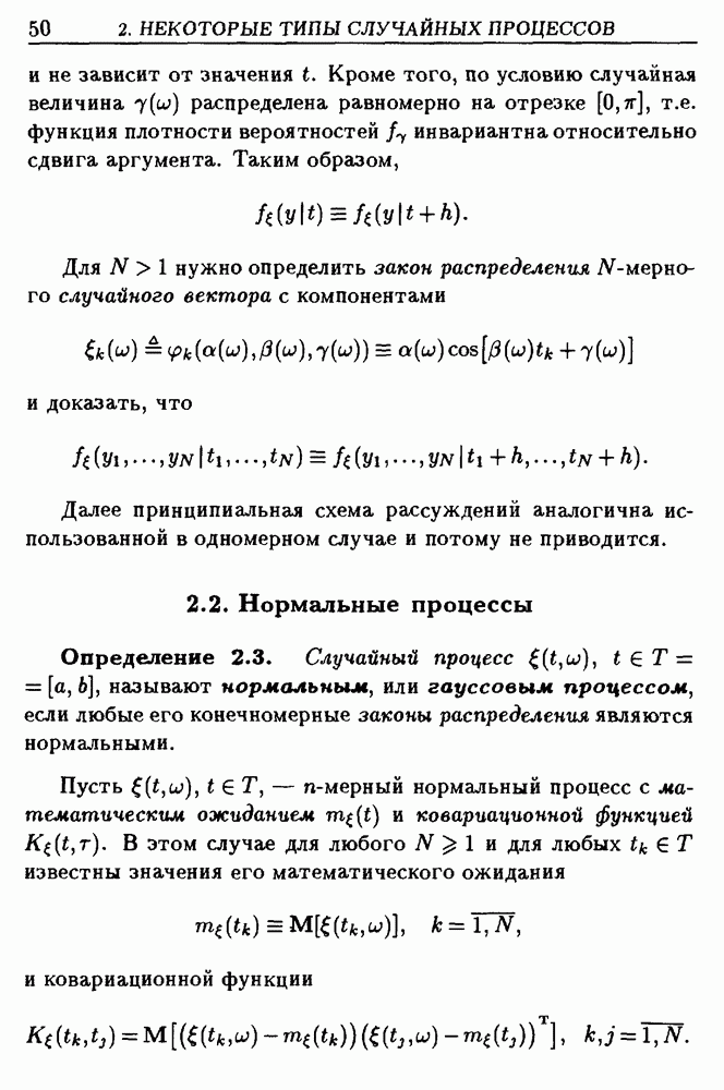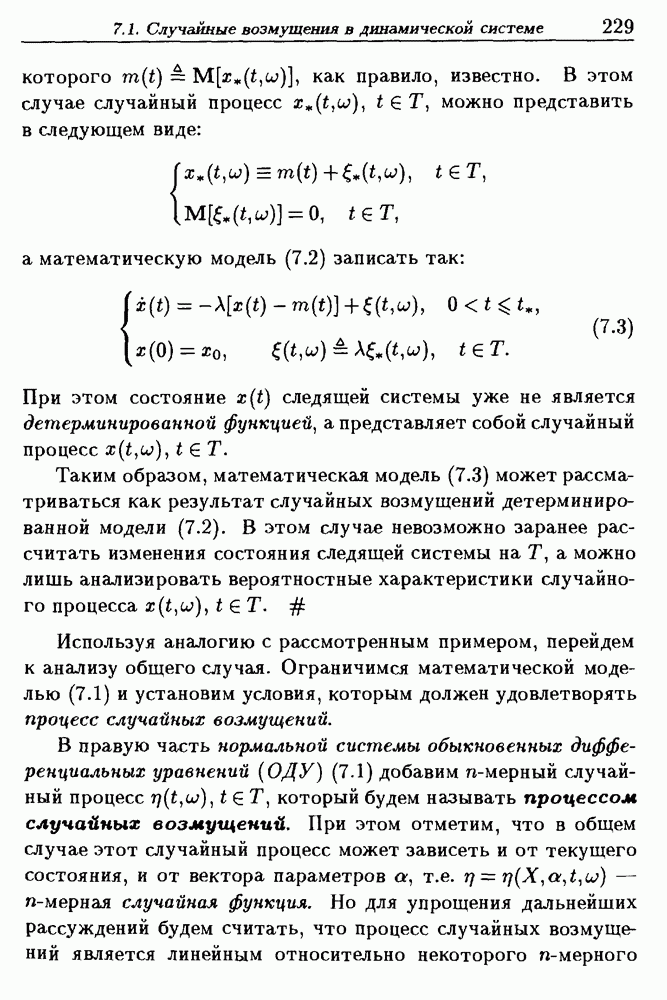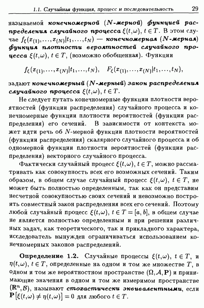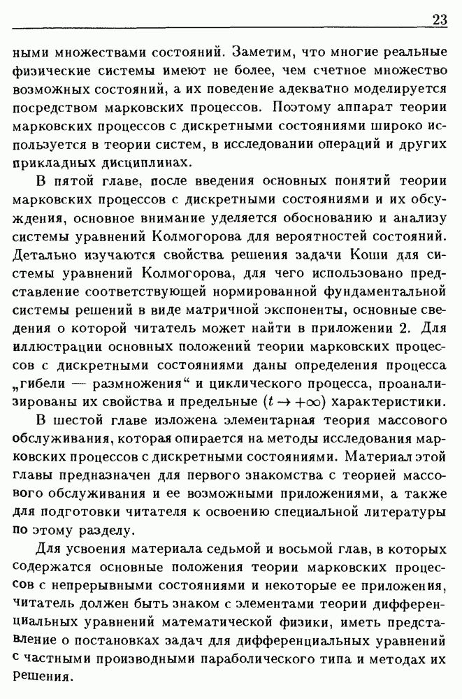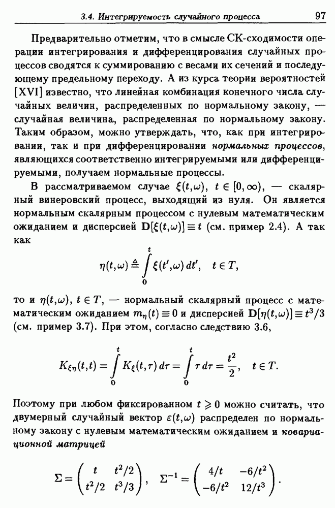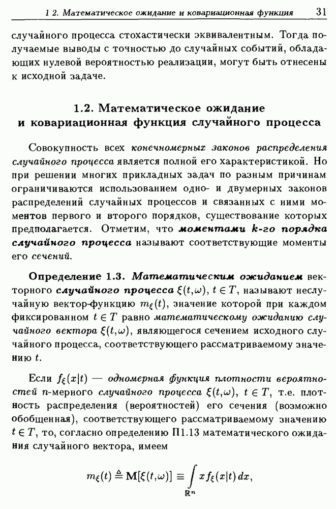 ВВЕДЕНИЕСодержание выпуска относится к одному из специальных курсов высшей математики, который является составной частью теории вероятностей. В процессе развития теории вероятностей как науки можно условно выделить три этапа, первый из которых связан с понятием случайного события, второй — с понятием случайной величины, а третий — с понятием случайной функции. При этом начало первого этапа относится к середине XVII в., второго — к середине XIX в., а третьего — к 20-30 гг. XX в., и начало каждого следующего этапа, в принципе, не связано с завершением предыдущего. Теория случайных процессов возникла вследствие практической необходимости математического моделирования реальных процессов различной природы, состояние каждого из которых в любой фиксированный момент времени представляет собой случайный вектор соответствующей размерности. Примером случайного процесса является процесс изменения во времени пространственных координат частицы, совершающей броуновское движение. Другими примерами случайных процессов являются: процесс стабилизации полета самолета в реальных условиях, когда он находится под постоянным воздействием случайных изменений вектора скорости ветра и других параметров турбулентной атмосферы; процесс развития неоднородной популяции с несколькими типами индивидуумов; процессы спроса и предложения на рынке товаров и т.д. Фактически теория случайных процессов занимается изучением различных семейств случайных величин, эволюционирующих во времени. При этом логически корректное определение основных понятий теории случайных процессов в рамках аксиоматики теории вероятностей создавало и создает много трудностей теоретико-множественного характера. Они связаны, например, с определениями непрерывности, дифференцируемости, интегрируемости и других свойств случайных процессов. Именно поэтому в монографиях по теории случайных процессов значительное место занимает анализ развития теоретикомножественных конструкций. Они написаны на высоком теоретическом уровне и, как правило, сложны для понимания специалистов, занимающихся прикладными проблемами в различных областях человеческой деятельности, решение которых предполагает широкое использование методов теории случайных процессов. А так как литература по прикладным аспектам теории случайных процессов, доступная для понимания широкому кругу студентов, аспирантов и научных работников, имеющих математическую подготовку в объеме стандартного курса высшей математики, весьма немногочисленна, то возникла необходимость в написании этой книги. Основной целью написания предлагаемого учебника явилось систематическое изложение элементов теории случайных процессов, усвоение которых должно способствовать активному овладению ее прикладными методами при решении практических задач. Различный уровень общей математической подготовки читателей и разнообразие их запросов авторы попытались учесть компоновкой материала по разделам с возрастающими уровнями сложности. Все основные понятия и методы иллюстрированы примерами, а в конце каждой главы приведены контрольные вопросы и упражнения. Отметим, что учебник не содержит библиографии по теории случайных процессов и ее приложениям. В списке рекомендуемой литературы указаны лишь те источники, обращение к ко
