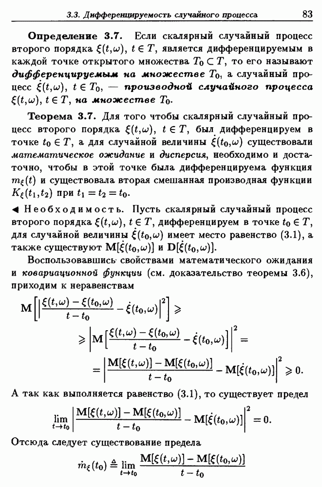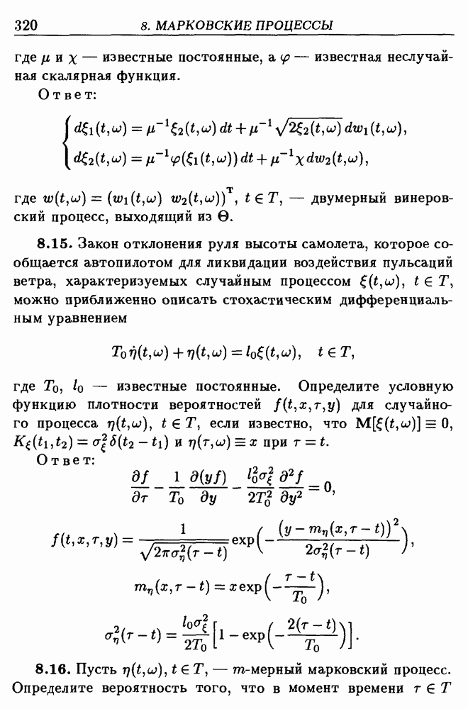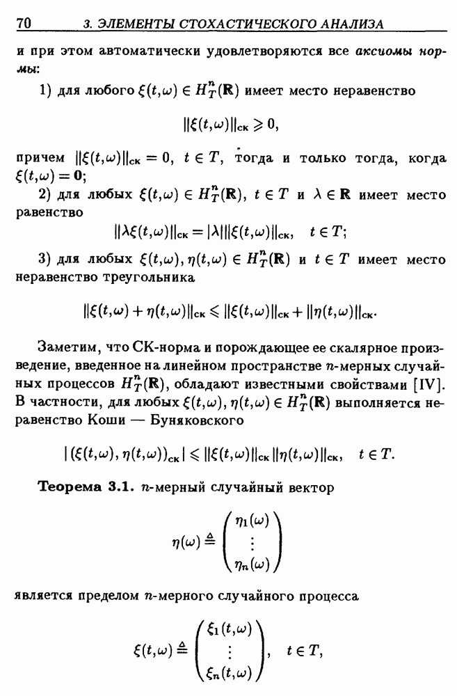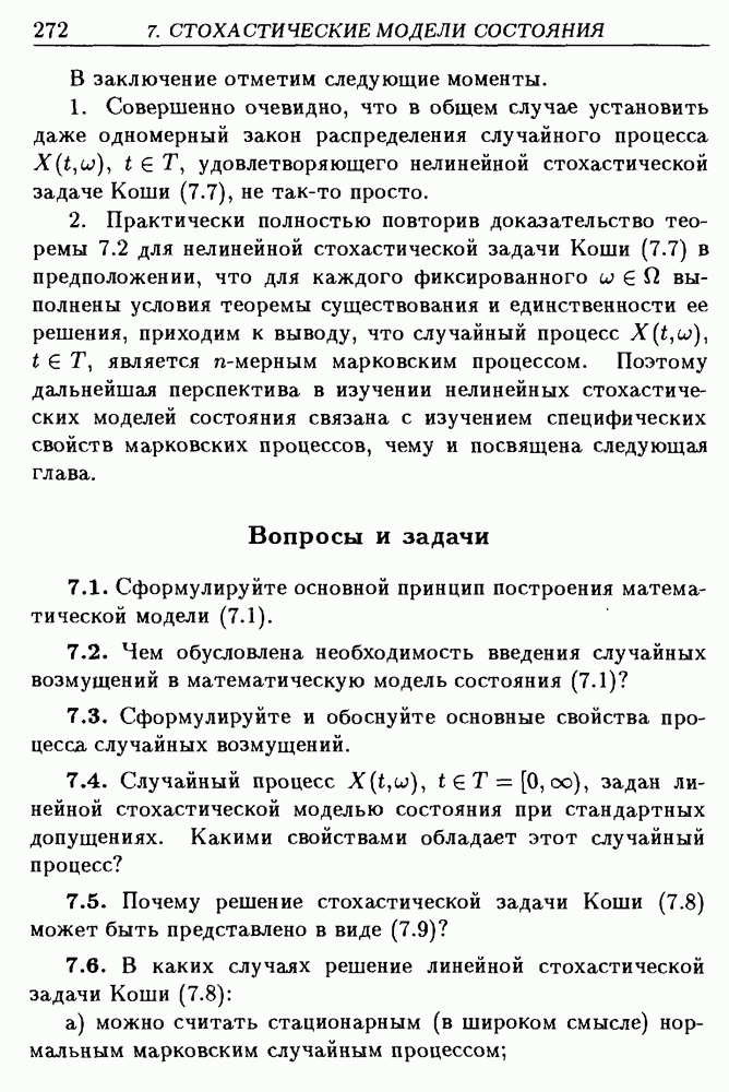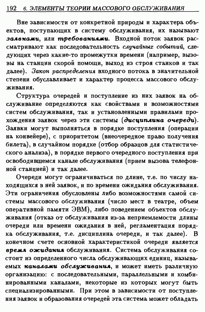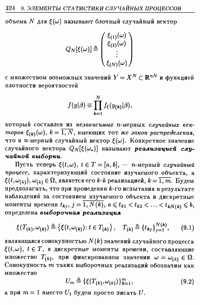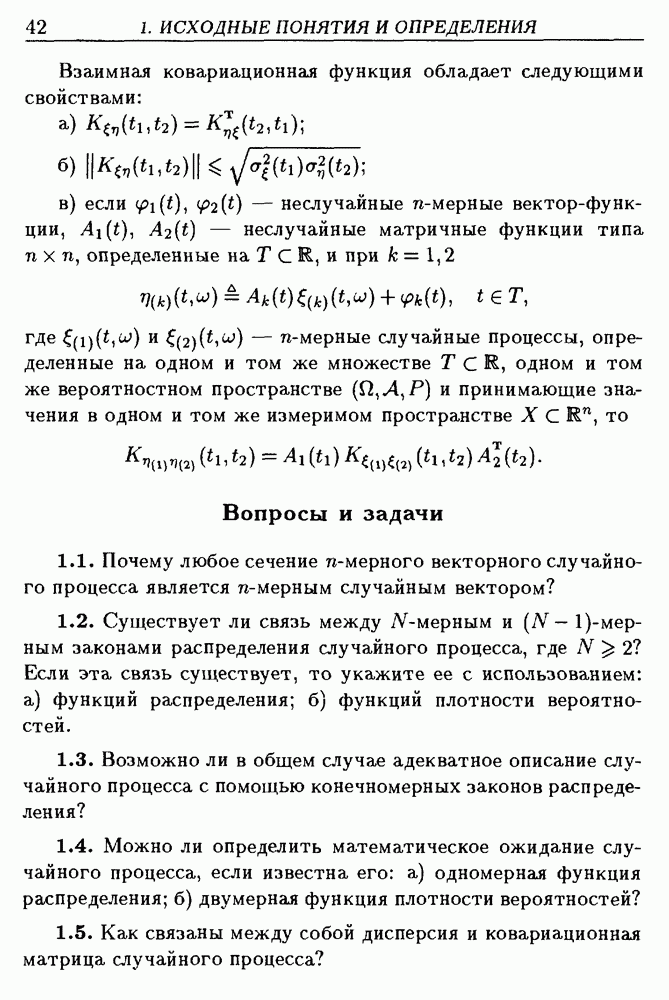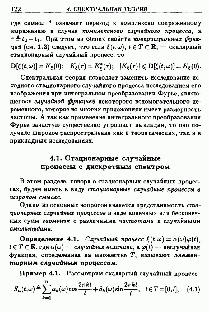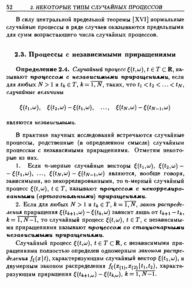 ВВЕДЕНИЕСодержание выпуска относится к одному из специальных курсов высшей математики, который является составной частью теории вероятностей. В процессе развития теории вероятностей как науки можно условно выделить три этапа, первый из которых связан с понятием случайного события, второй — с понятием случайной величины, а третий — с понятием случайной функции. При этом начало первого этапа относится к середине XVII в., второго — к середине XIX в., а третьего — к 20-30 гг. XX в., и начало каждого следующего этапа, в принципе, не связано с завершением предыдущего. Теория случайных процессов возникла вследствие практической необходимости математического моделирования реальных процессов различной природы, состояние каждого из которых в любой фиксированный момент времени представляет собой случайный вектор соответствующей размерности. Примером случайного процесса является процесс изменения во времени пространственных координат частицы, совершающей броуновское движение. Другими примерами случайных процессов являются: процесс стабилизации полета самолета в реальных условиях, когда он находится под постоянным воздействием случайных изменений вектора скорости ветра и других параметров турбулентной атмосферы; процесс развития неоднородной популяции с несколькими типами индивидуумов; процессы спроса и предложения на рынке товаров и т.д. Фактически теория случайных процессов занимается изучением различных семейств случайных величин, эволюционирующих во времени. При этом логически корректное определение основных понятий теории случайных процессов в рамках аксиоматики теории вероятностей создавало и создает много трудностей теоретико-множественного характера. Они связаны, например, с определениями непрерывности, дифференцируемости, интегрируемости и других свойств случайных процессов. Именно поэтому в монографиях по теории случайных процессов значительное место занимает анализ развития теоретикомножественных конструкций. Они написаны на высоком теоретическом уровне и, как правило, сложны для понимания специалистов, занимающихся прикладными проблемами в различных областях человеческой деятельности, решение которых предполагает широкое использование методов теории случайных процессов. А так как литература по прикладным аспектам теории случайных процессов, доступная для понимания широкому кругу студентов, аспирантов и научных работников, имеющих математическую подготовку в объеме стандартного курса высшей математики, весьма немногочисленна, то возникла необходимость в написании этой книги. Основной целью написания предлагаемого учебника явилось систематическое изложение элементов теории случайных процессов, усвоение которых должно способствовать активному овладению ее прикладными методами при решении практических задач. Различный уровень общей математической подготовки читателей и разнообразие их запросов авторы попытались учесть компоновкой материала по разделам с возрастающими уровнями сложности. Все основные понятия и методы иллюстрированы примерами, а в конце каждой главы приведены контрольные вопросы и упражнения. Отметим, что учебник не содержит библиографии по теории случайных процессов и ее приложениям. В списке рекомендуемой литературы указаны лишь те источники, обращение к ко
